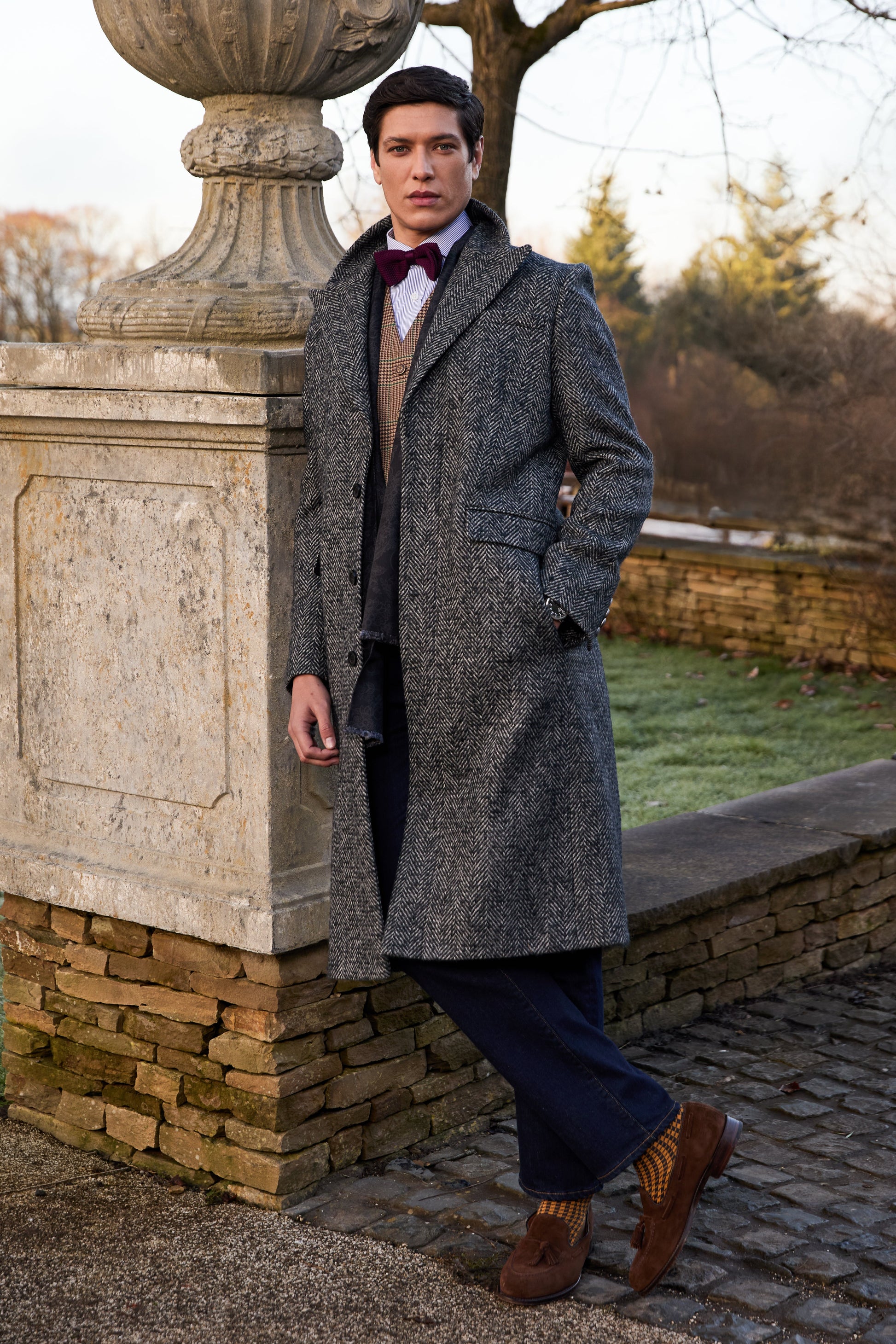 A refined take on classic tailoring, the Fairford Coat is crafted from pure wool herringbone, offering both warmth and timeless sophistication. The sleek, calf-length silhouette is elevated by peak lapels and a black leather collar stand, while a concealed button fastening ensures a clean, polished finish. Thoughtfully designed with a vented back for ease of movement, articulated sleeve openings with branded alloy buttons, and a fully lined interior with contrast leather-trimmed pockets, this coat is the perfect blend of heritage craftsmanship and modern elegance.