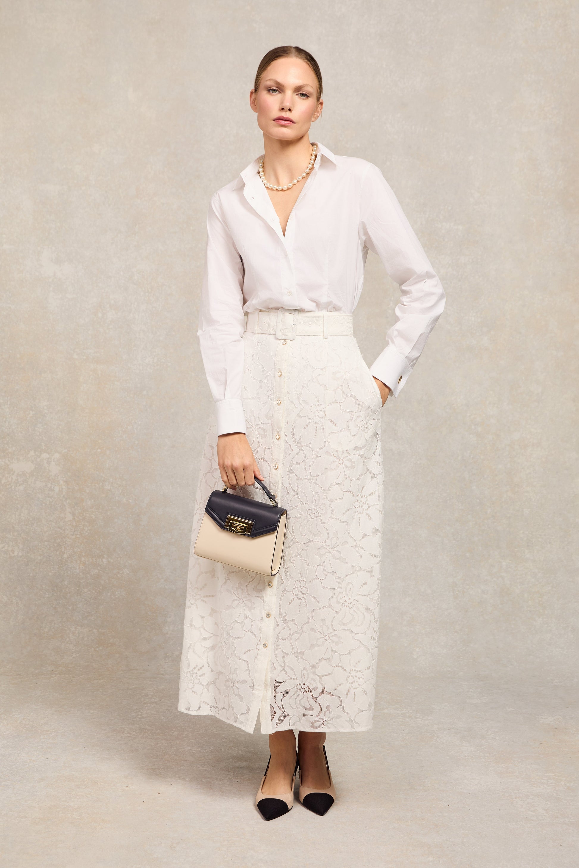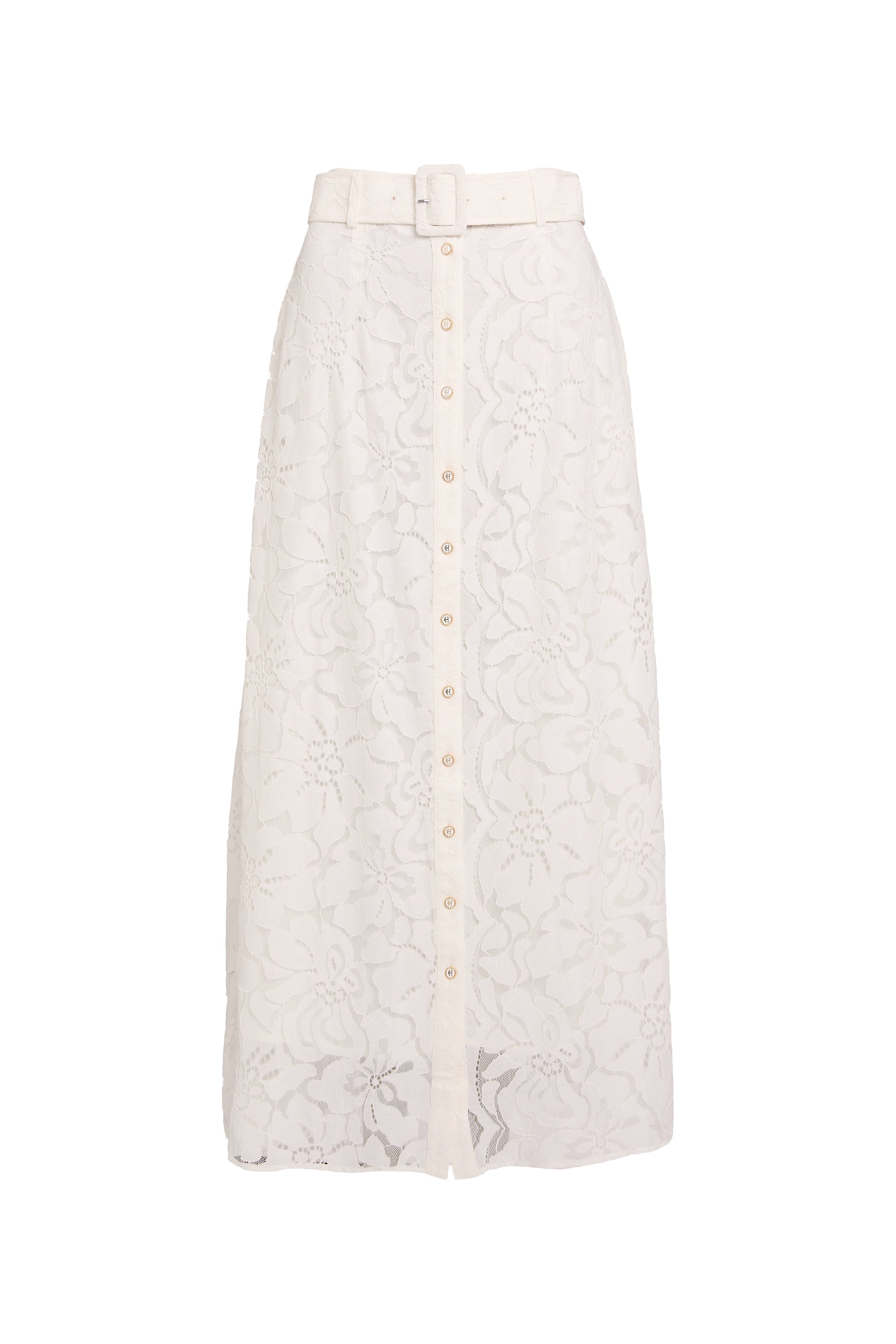 The self-fabric belt with piped edges and a lace-covered buckle accentuates the waist, adding a tailored touch to this romantic piece. Finished with a central placket closure adorned with lace-covered buttons, the Annabelle Lace Skirt is the epitome of refined craftsmanship and effortless sophistication.
