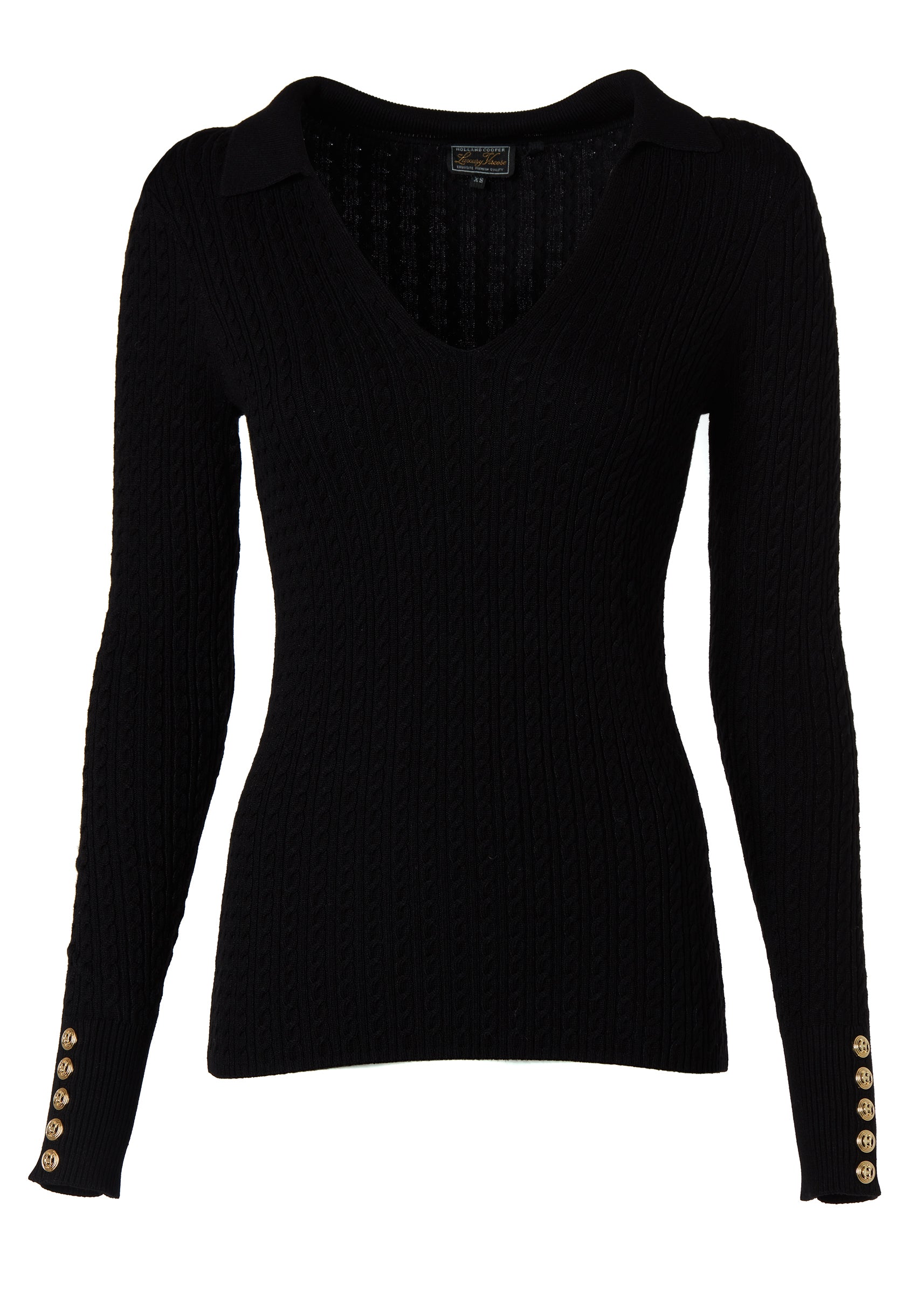Crafted from a luxurious super soft yarn, this jumper ensures a sumptuously cosy feel against your skin. With an intricate cable design with a slim silhouette and deep v collar neckline. Beautifully elevated with gold hardware on the cuffs.