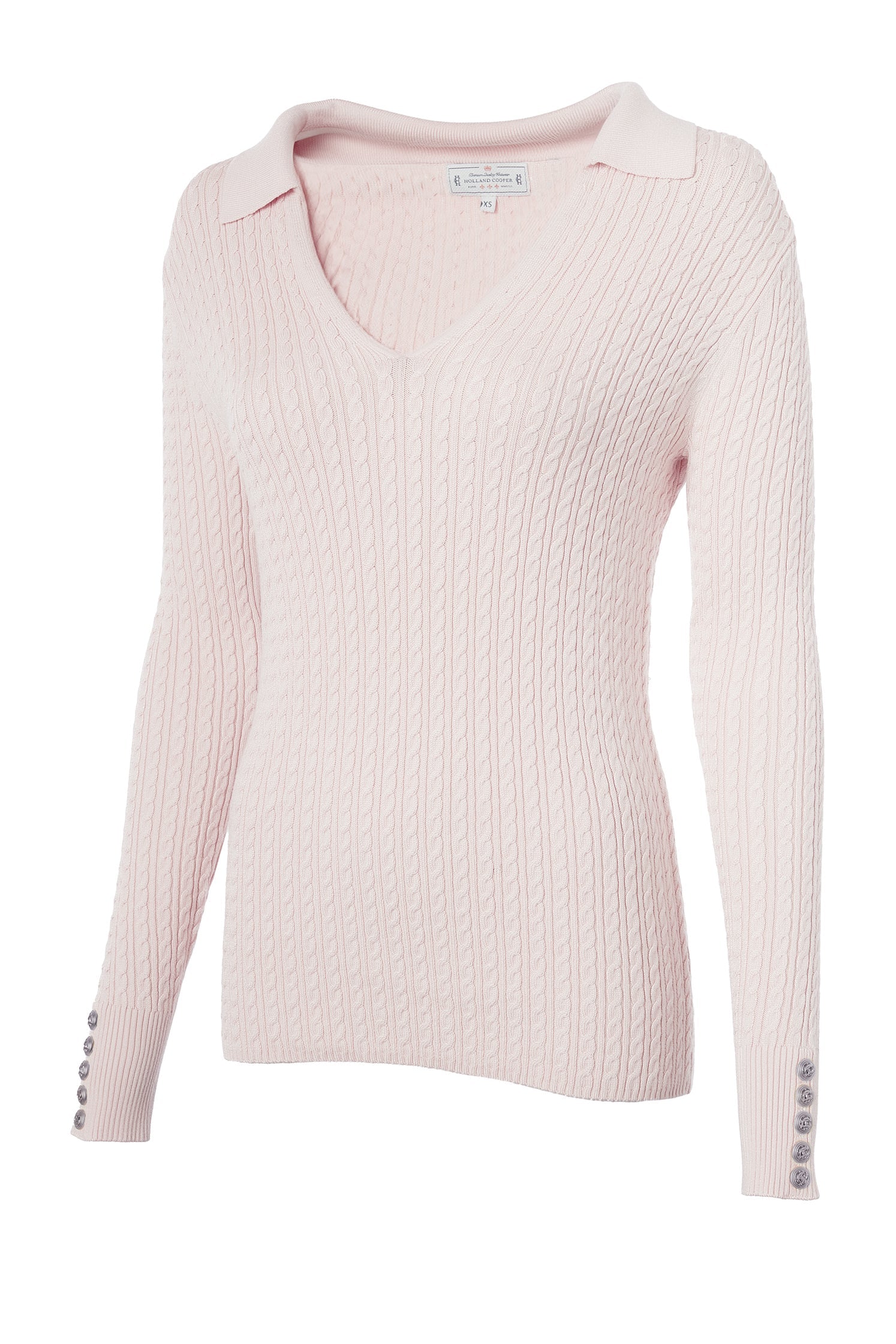 Crafted from a luxurious super soft yarn, this jumper ensures a sumptuously cosy feel against your skin. With an intricate cable design with a slim silhouette and deep v collar neckline. Beautifully elevated with silver hardware on the cuffs.