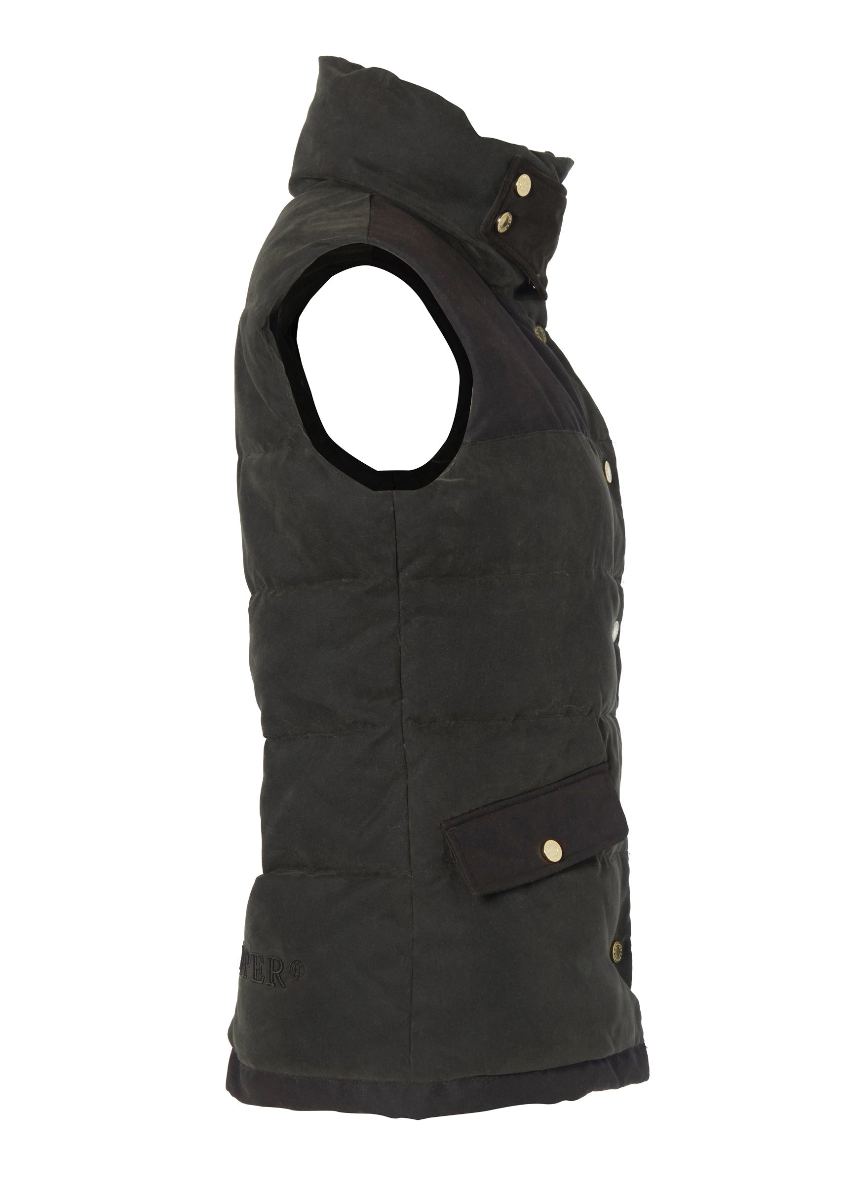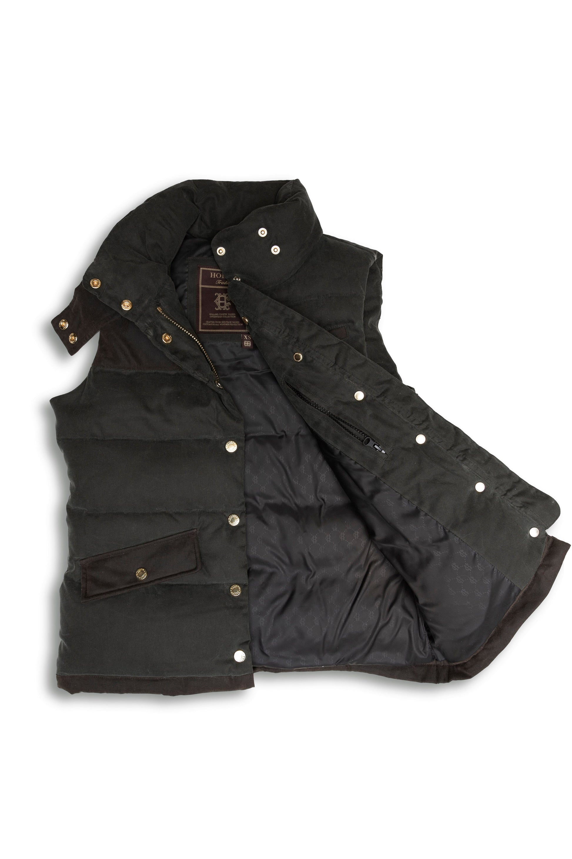 A classic Holland Cooper style, this vintage green gilet has been created from a waxed cotton fabric, filled with Sorona Eco Fill for warmth and breathability. Designed with a slim fit and poppers and zip to the front, it is detailed with a removable storm flap to the collar for practicality and finished with our iconic branding.