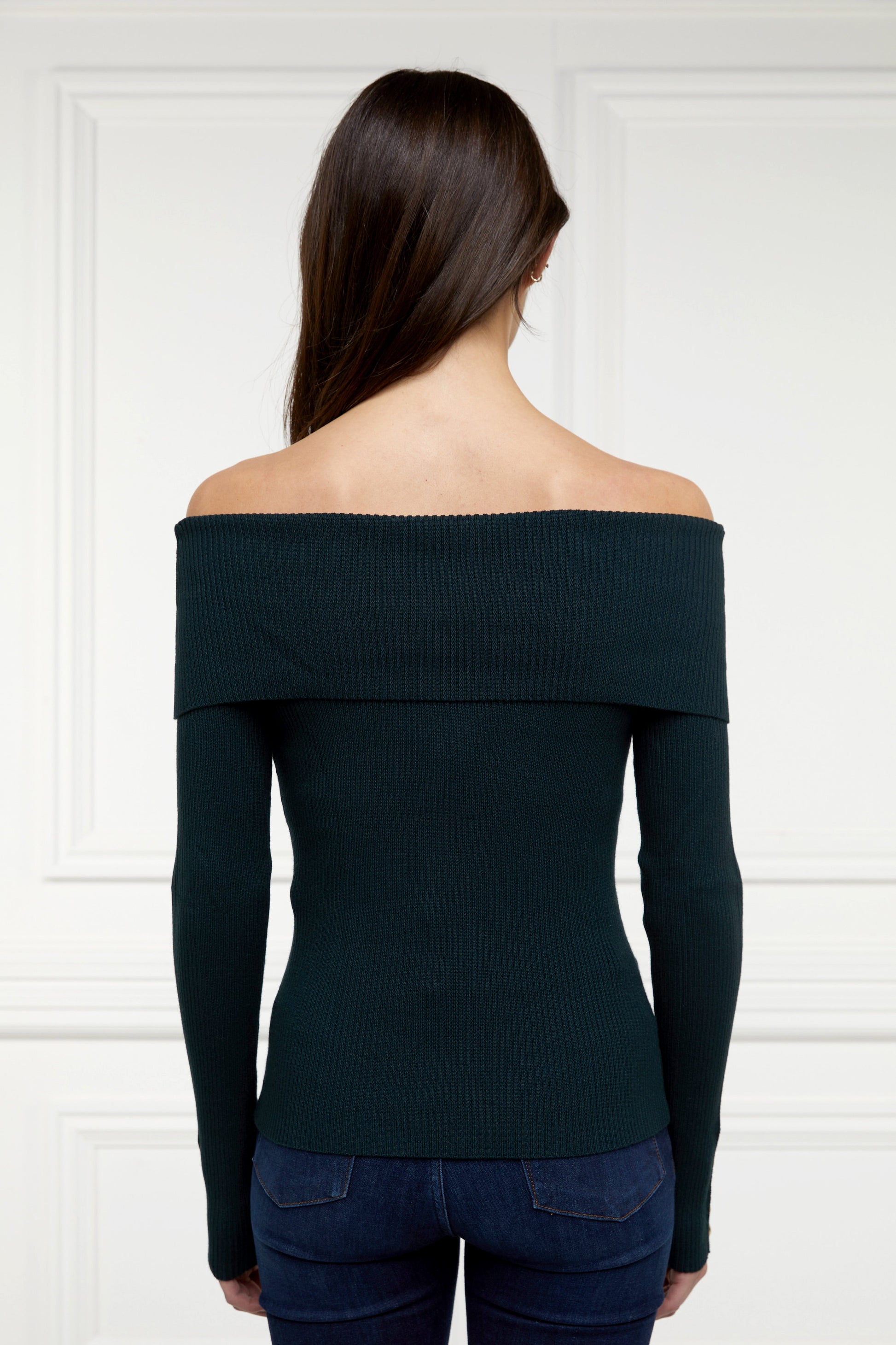 Designed in a timeless Bardot silhouette that offers endless styling opportunities. This elegant top features a relaxed open neckline and long sleeves, perfectly framed for a chic look. The slim fit ribbed body ensures a flattering fit, while signature hardware on the cuffs adds a touch of sophistication. Versatile and stylish, the Bardot Knit is a must-have for any fashion-forward wardrobe.