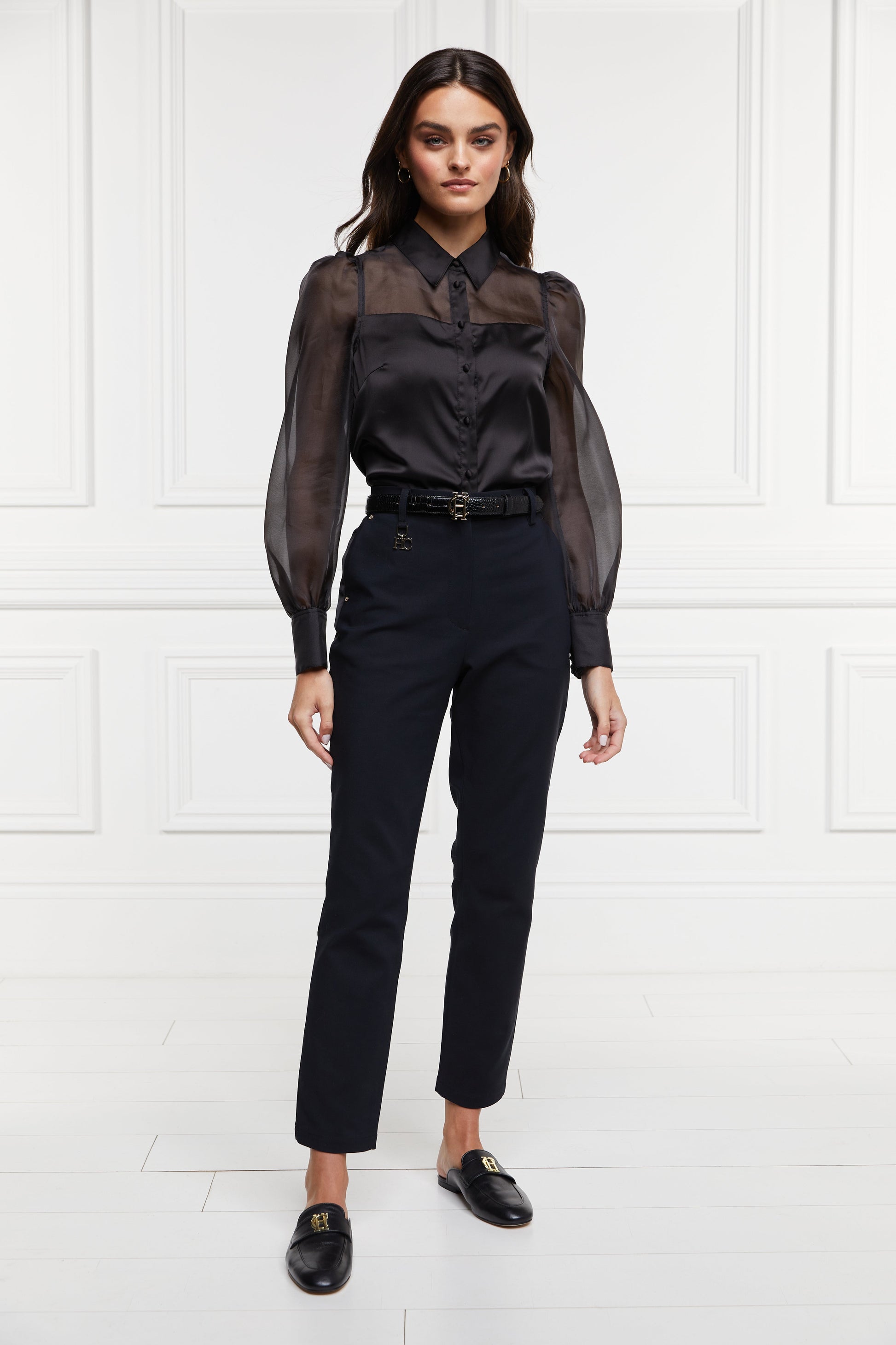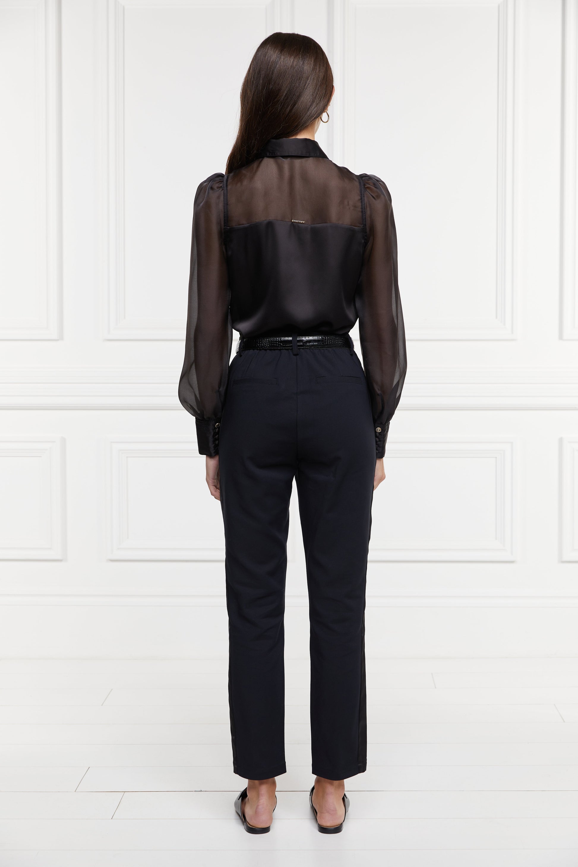 Designed with a high rise waist with a skinny fit and tailored shape, these trousers have been created from a stretchy fabric. With hidden elastic in the waist to ensure extra comfort and detailed with a button closure. Finished with our iconic gold hardware and an elevated satin stripe.