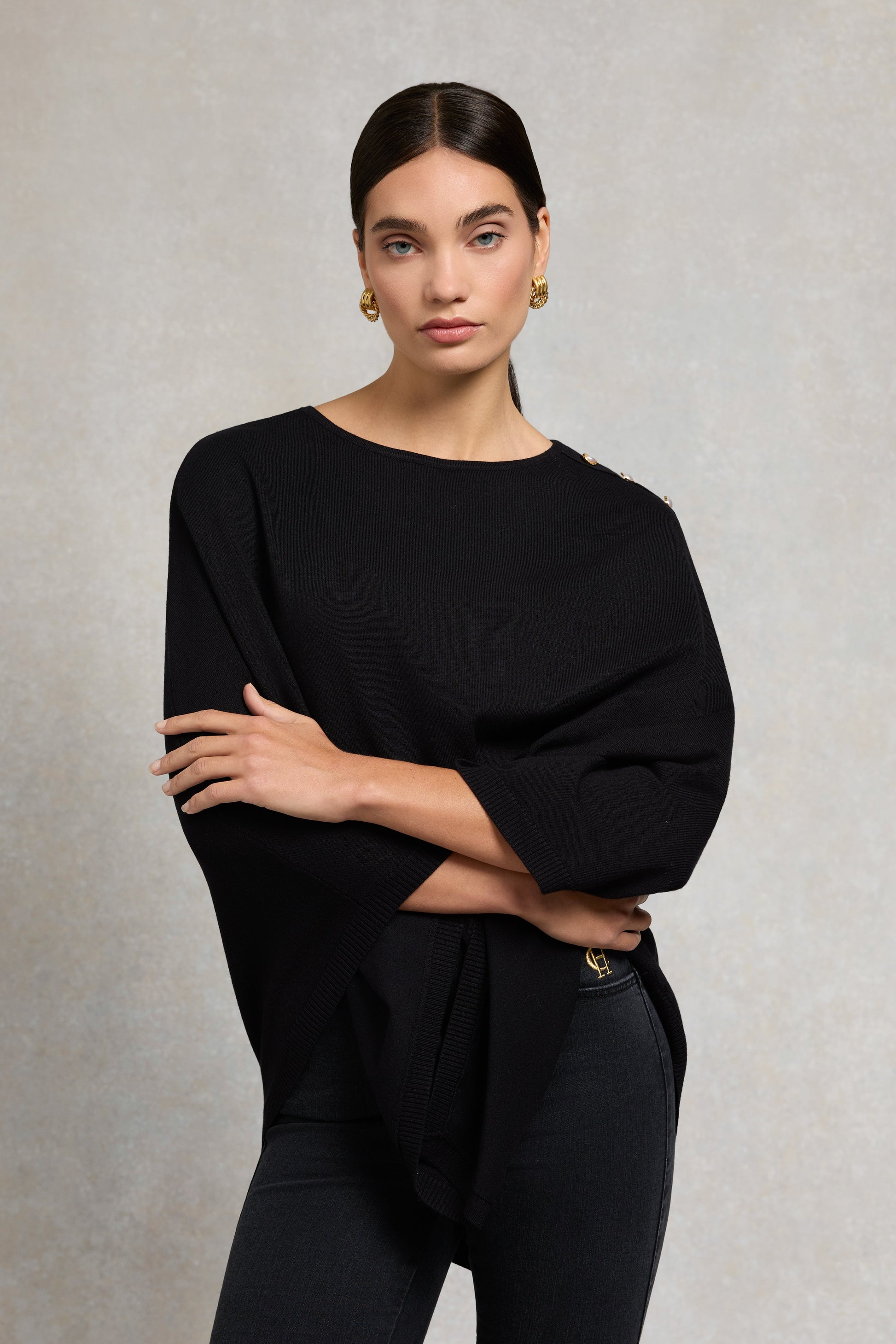 Effortlessly elegant, the Boat Neck Cape has been designed to elevate any look with its refined silhouette and luxurious drape. Featuring a timeless boat neckline and soft, flowing shape, it’s adorned with delicate pearl HC rivets that lend a signature touch. Cut in a one-size fit, this piece layers beautifully, making it a versatile addition to your wardrobe.