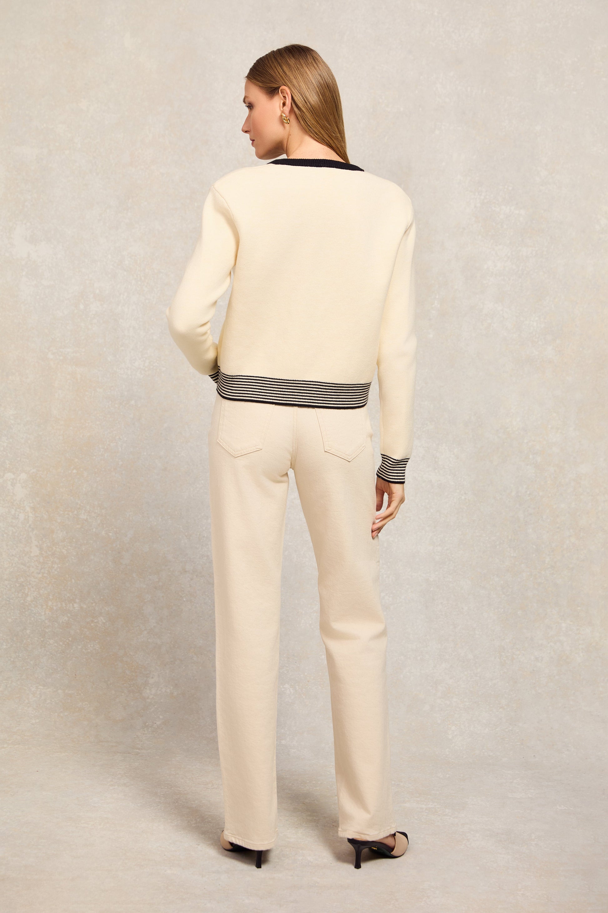 Featuring exquisite contrast detailing and a striking stripe at the hem and cuffs adds a touch of sophistication. The classic crew neck provides a clean and versatile silhouette, while the gold rivets introduce a subtle hint of glamour, making this cardigan a perfect choice for both casual and more elevated occasions.