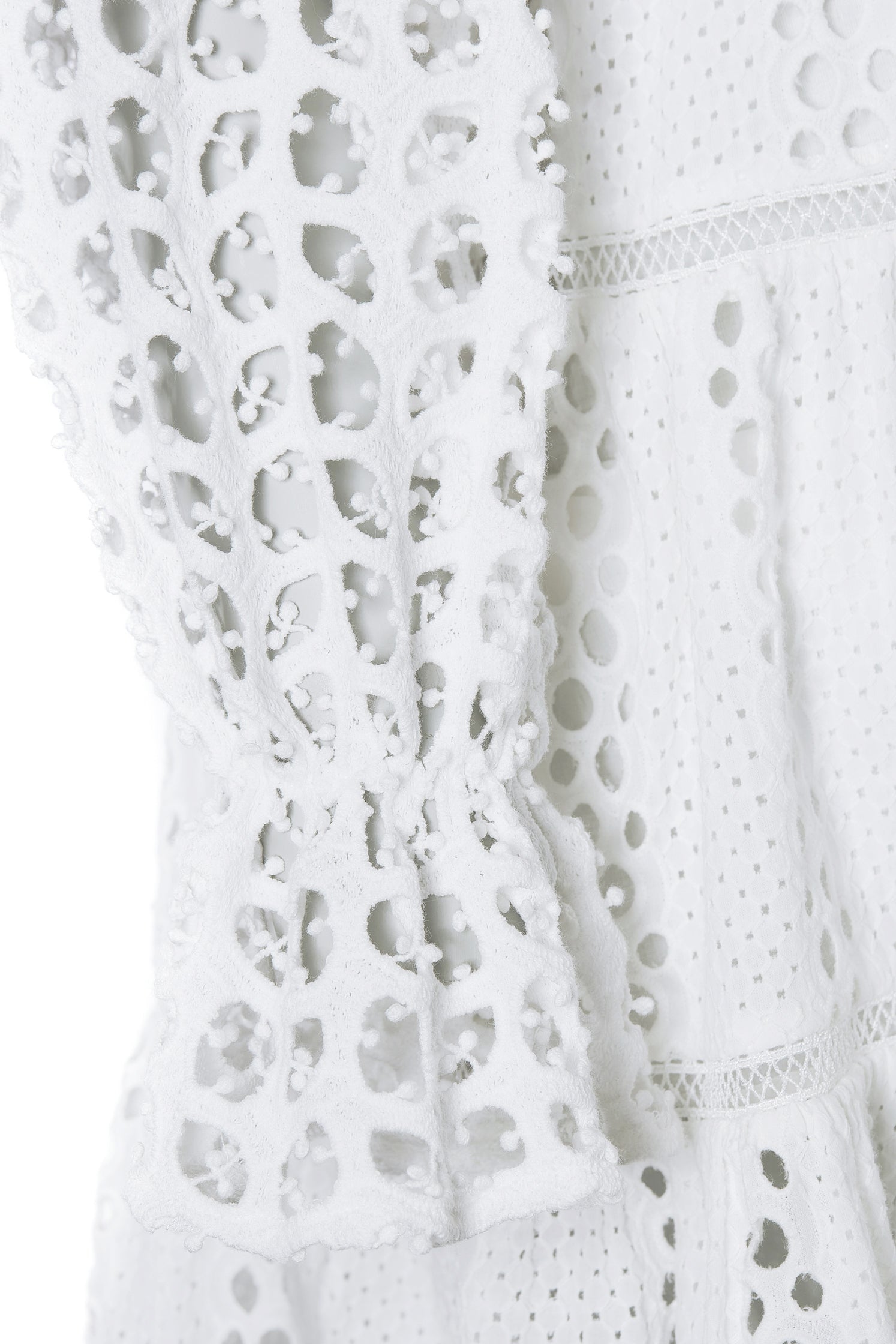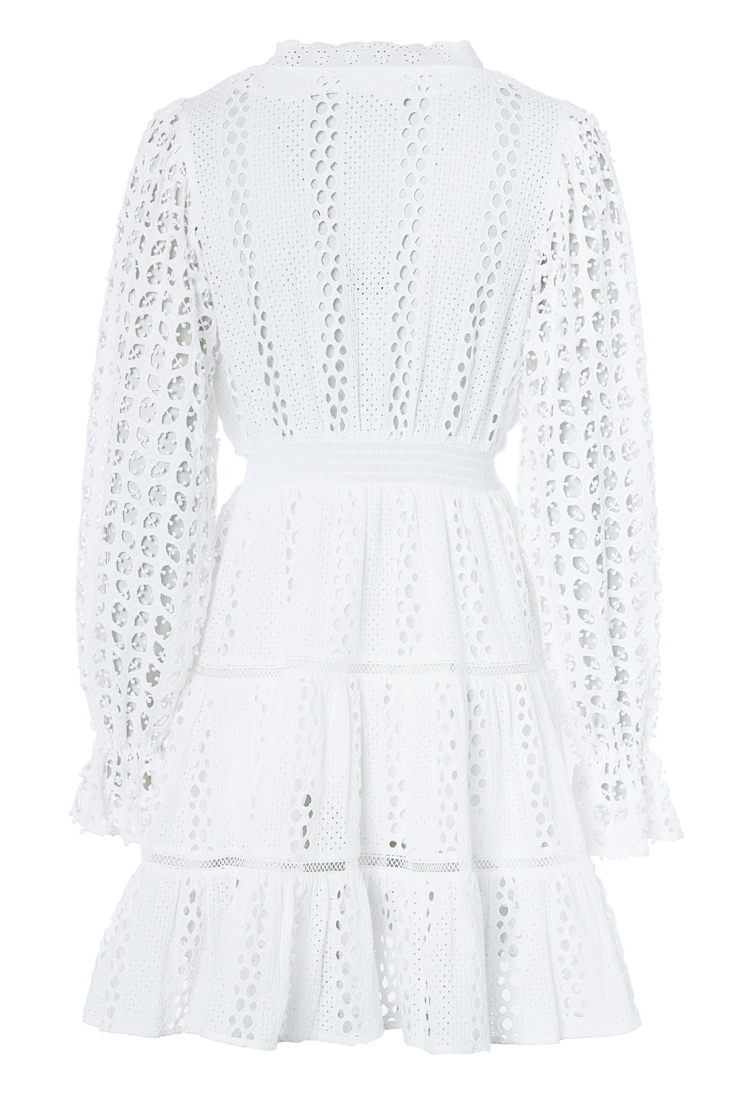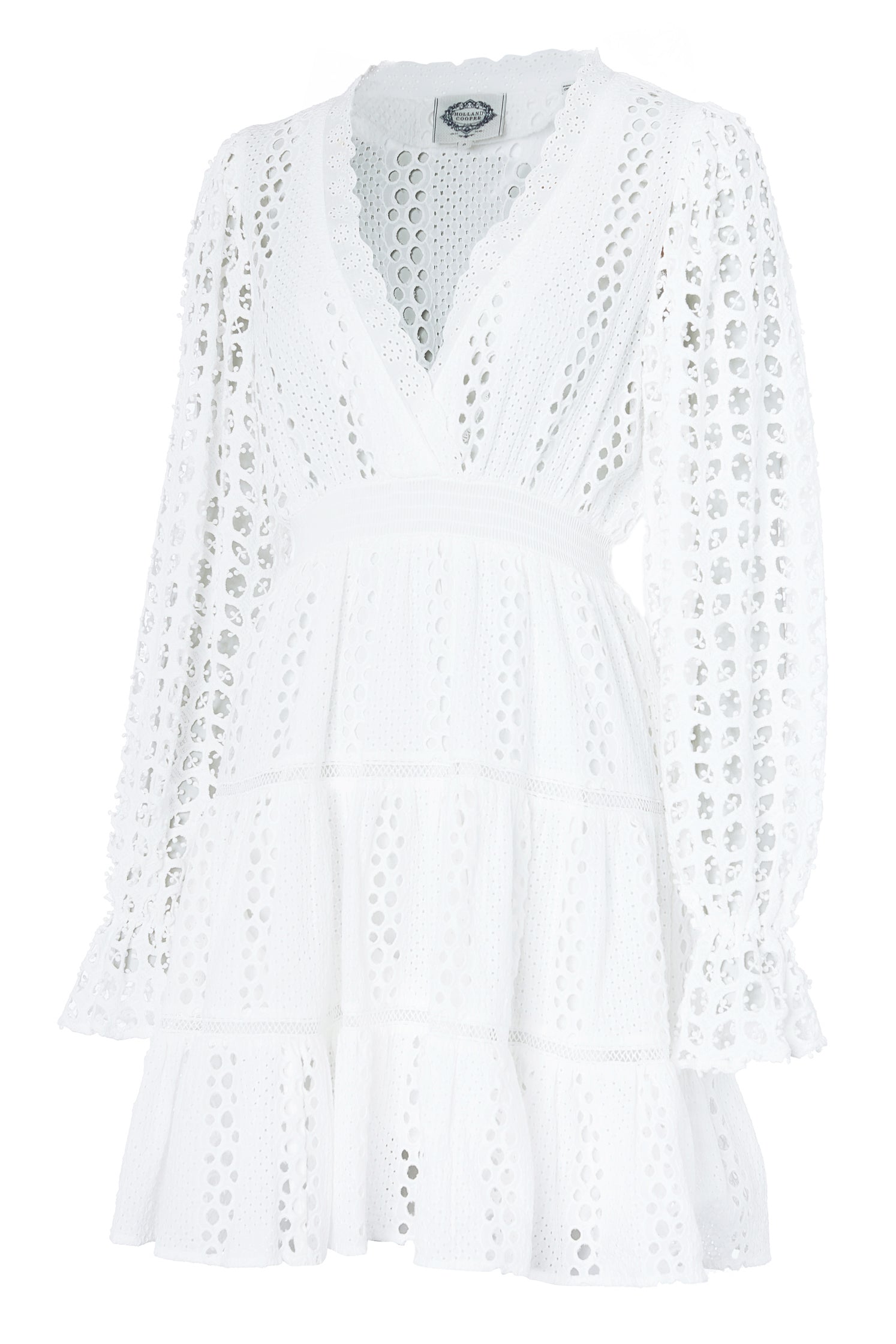 This tiered mini-length dress is crafted from delicate lace fabric, featuring full lining for both comfort and coverage. The dress is adorned with delicate contrasting lace edge trims, adding a touch of sophistication to its design. The low wrap-over front and v-neck styling create a flattering silhouette, while the long sleeves with bellowed volume at the lower part and fitted cuffs bring a stylish and elegant flair. The shirred waist ensures a flattering and easy fit.
