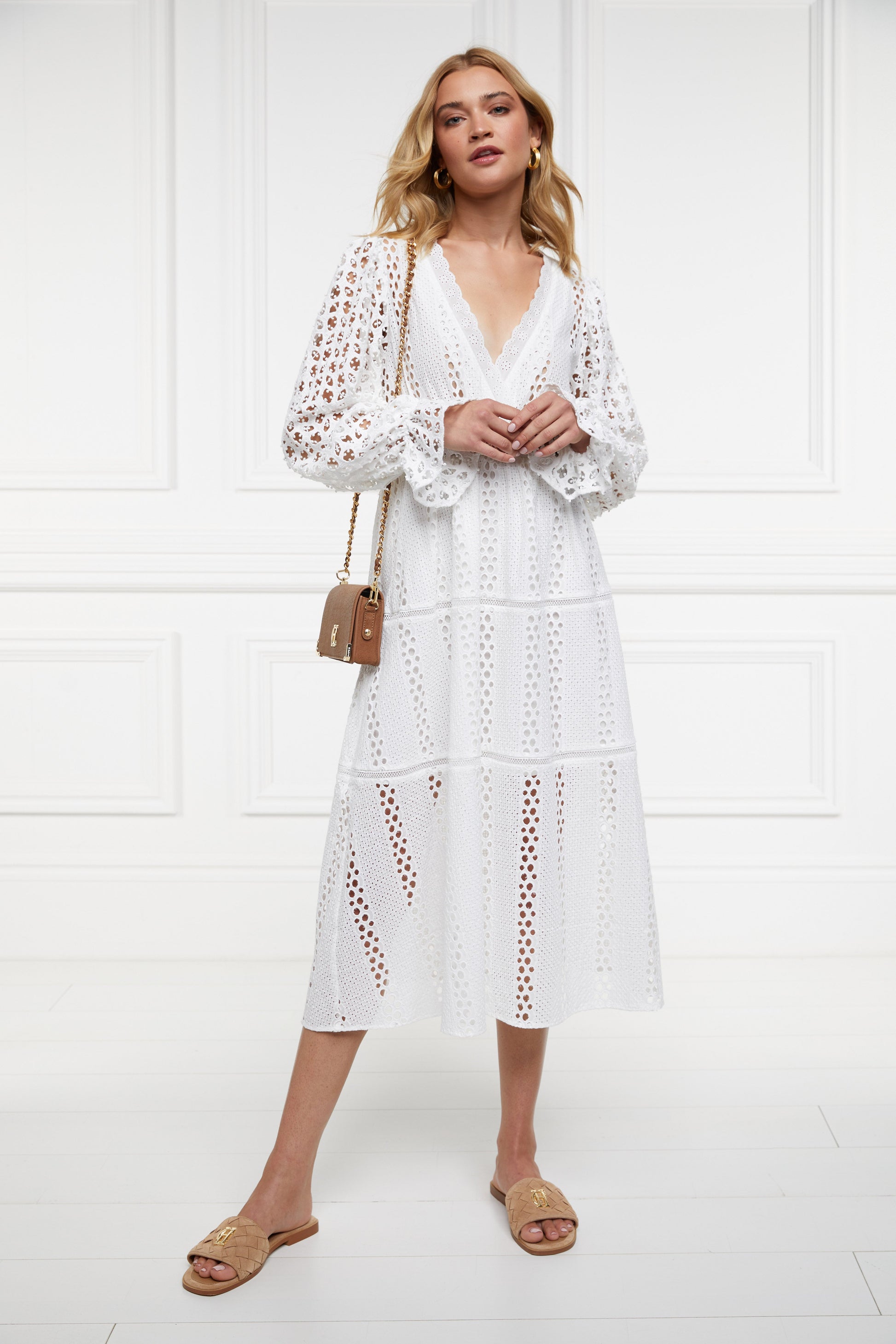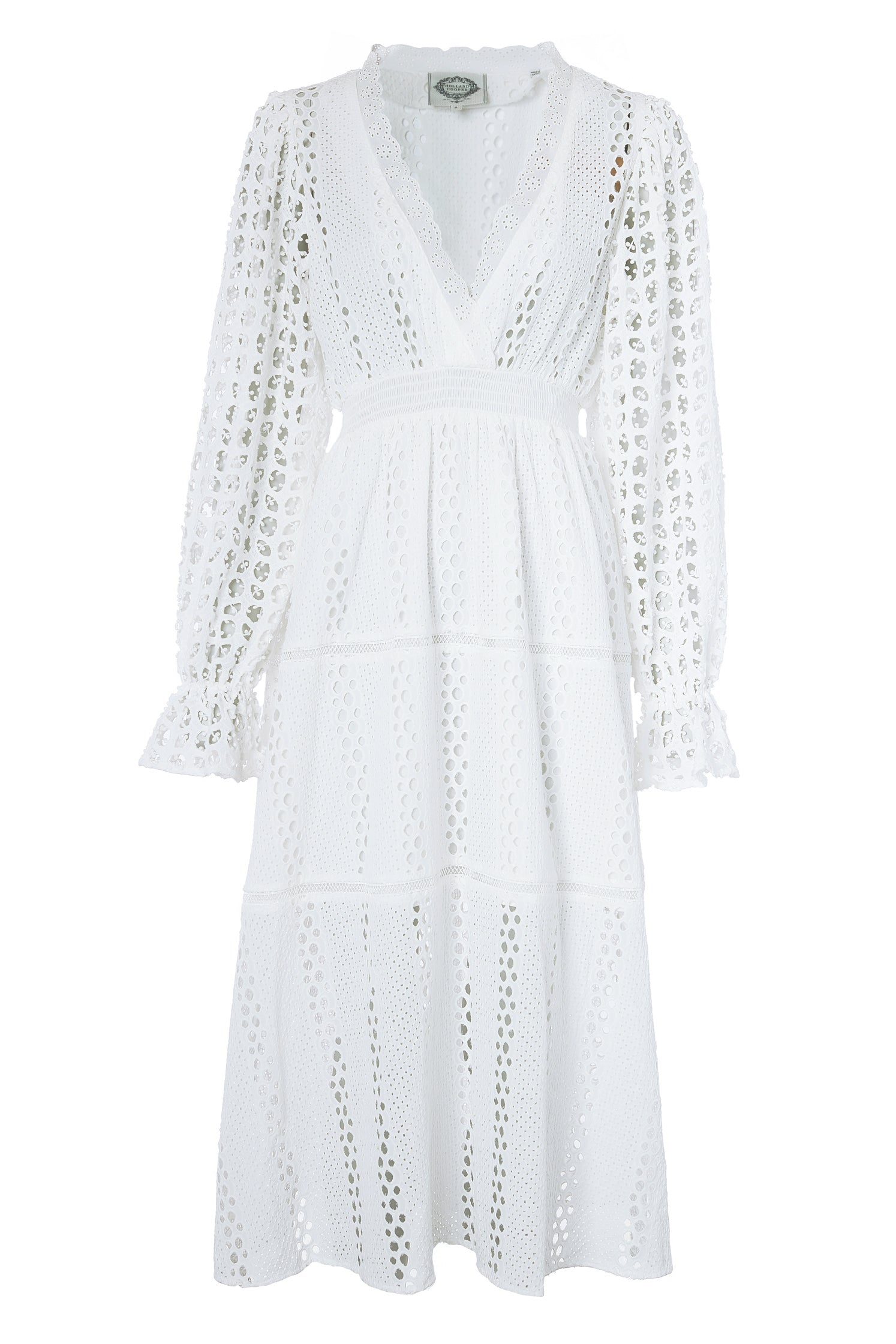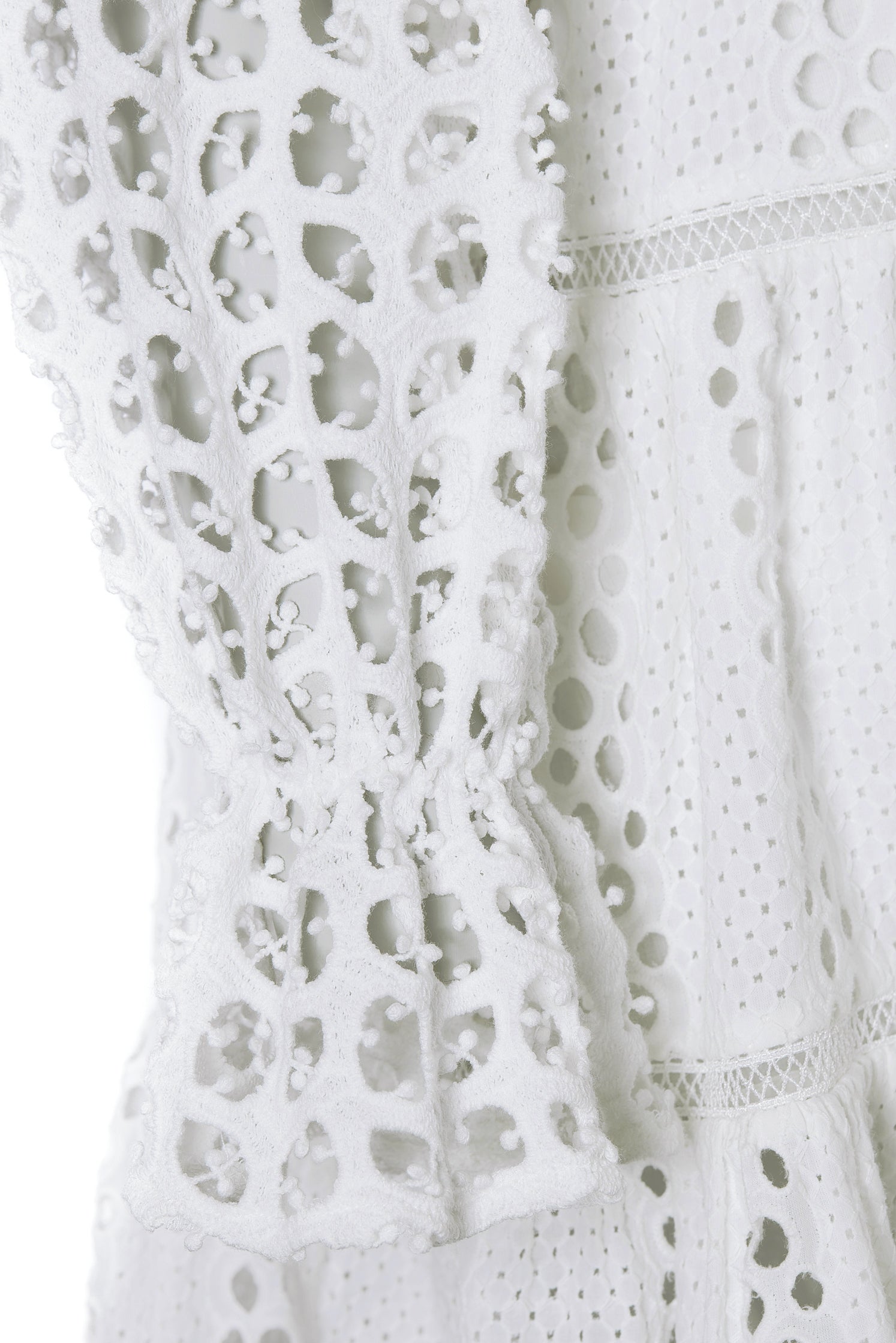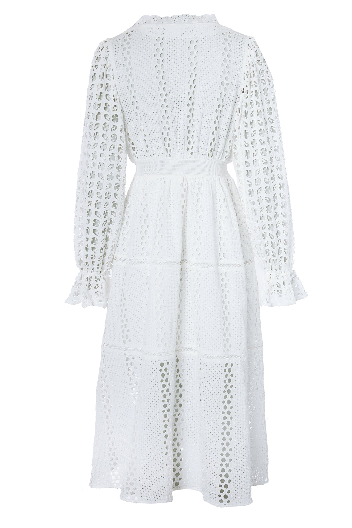 This tiered midi-length dress is crafted from delicate lace fabric, featuring full lining for both comfort and coverage. The dress is adorned with delicate contrasting lace edge trims, adding a touch of sophistication to its design. The low wrap-over front and v-neck styling create a flattering silhouette, while the long sleeves with bellowed volume at the lower part and fitted cuffs bring a stylish and elegant flair. The shirred waist ensures a flattering and easy fit.