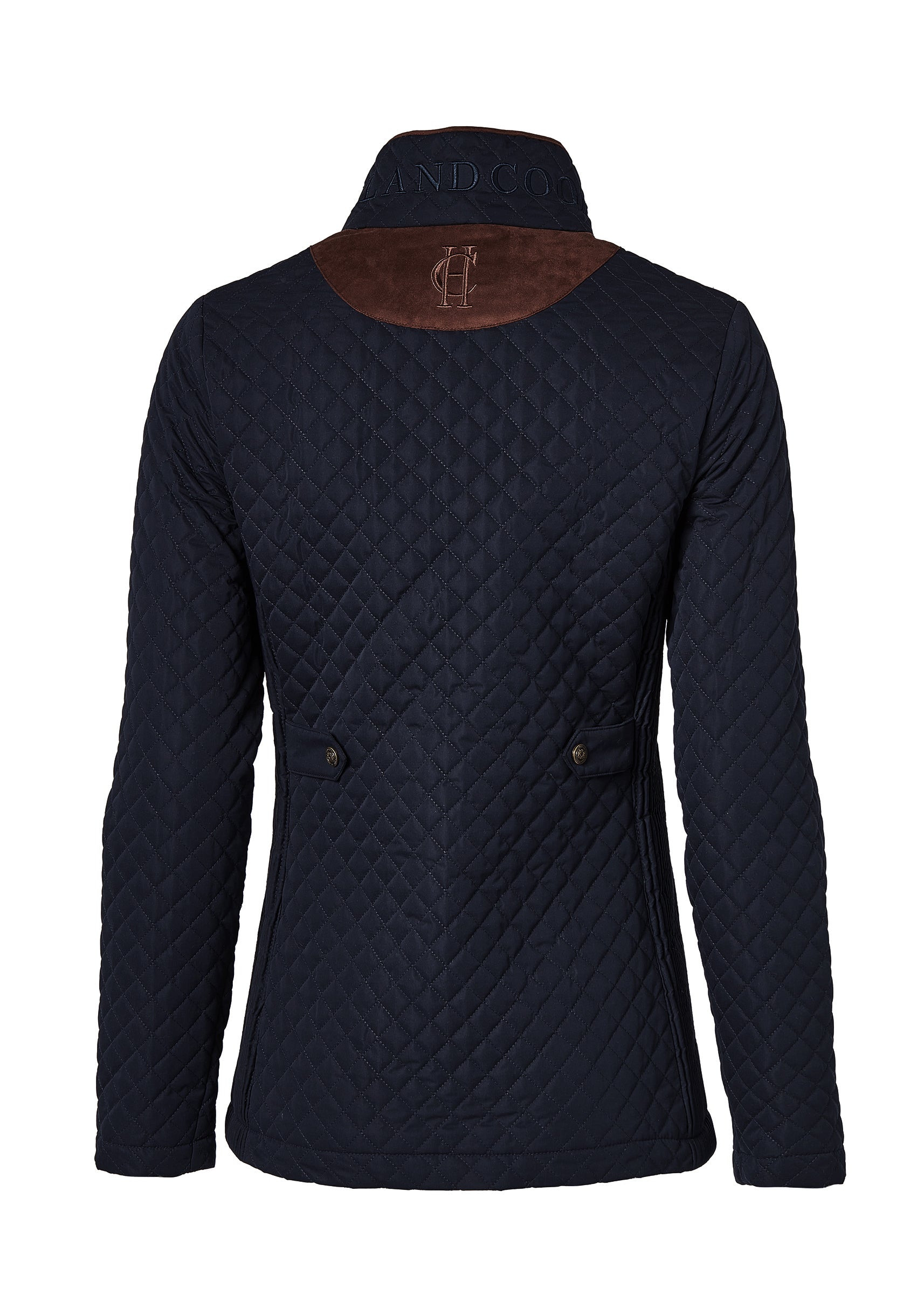 Featuring sheared elastic side panels, it offers both comfort and a flattering silhouette. The faux suede trim fabric in a contrasting colour adds a touch of sophistication, complementing the micro-scale diamond quilting that provides insulation without bulk.