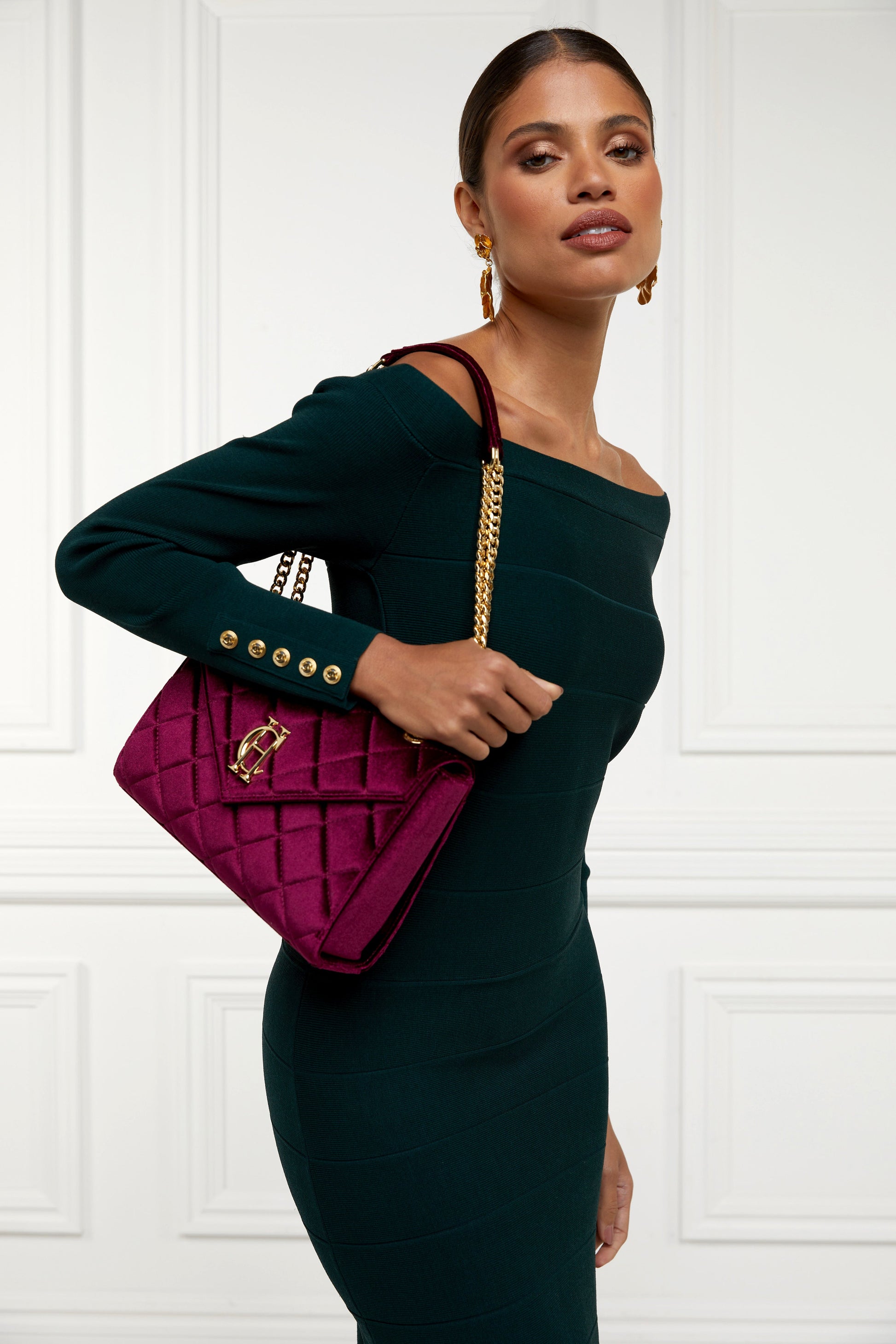 A luxurious statement piece that exudes sophistication. Crafted from rich velvet in a deep merlot hue, this bag features our iconic gold branding for a touch of elegance. The design is completed with a secured chain strap offering a dual-length option, ensuring versatility and style. Perfect for both day and night, the Knightsbridge Shoulder Bag in Velvet Merlot adds a refined, opulent touch to any outfit.