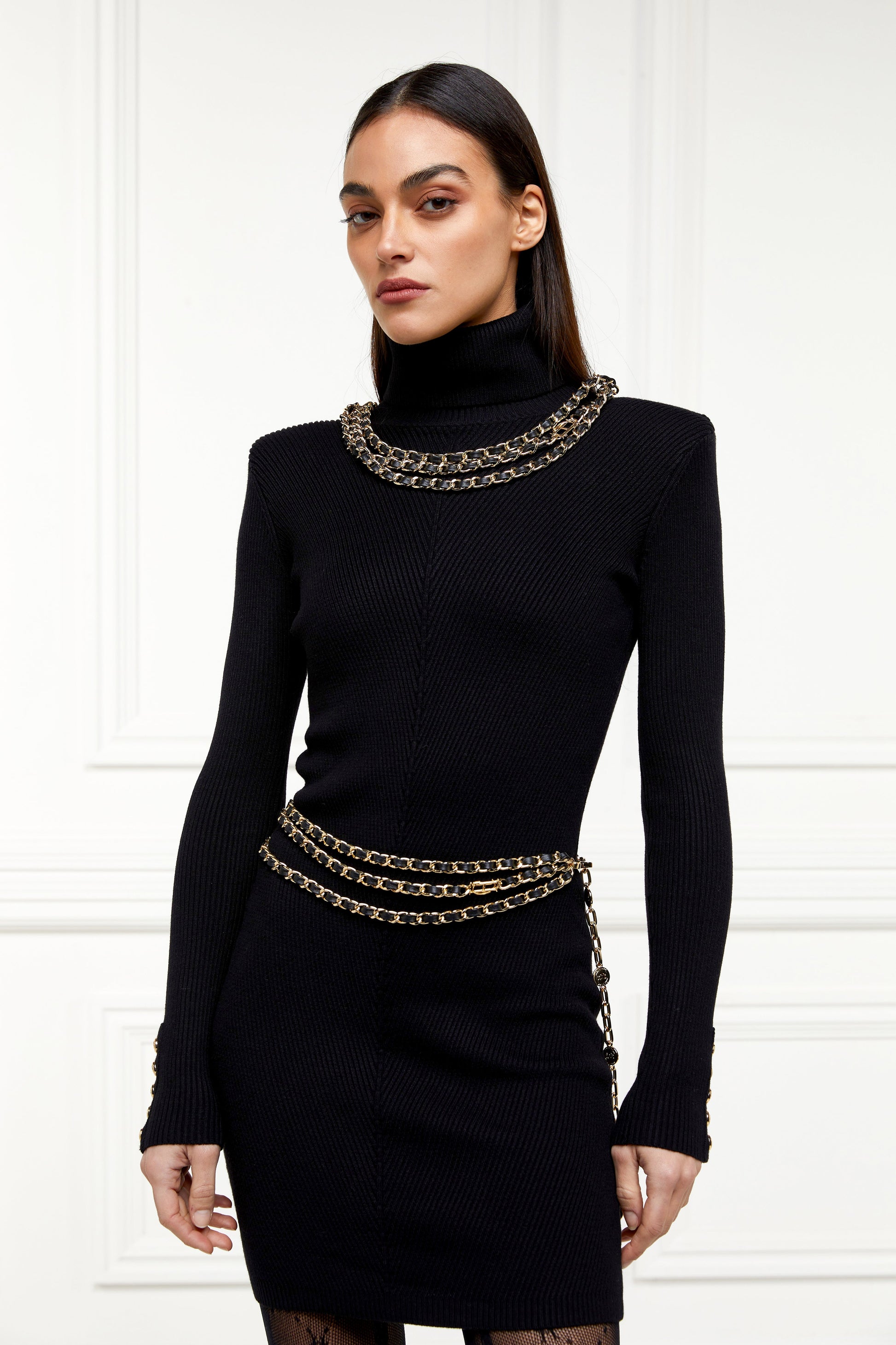 A striking addition to your accessory collection in our iconic black and gold. This PU belt features three elegant gold chains, complemented by our signature HC hardware and a branded crest. Designed with versatility in mind, it can be easily adjusted to fit all sizes. Elevate your outfits with this sophisticated and eye-catching belt.