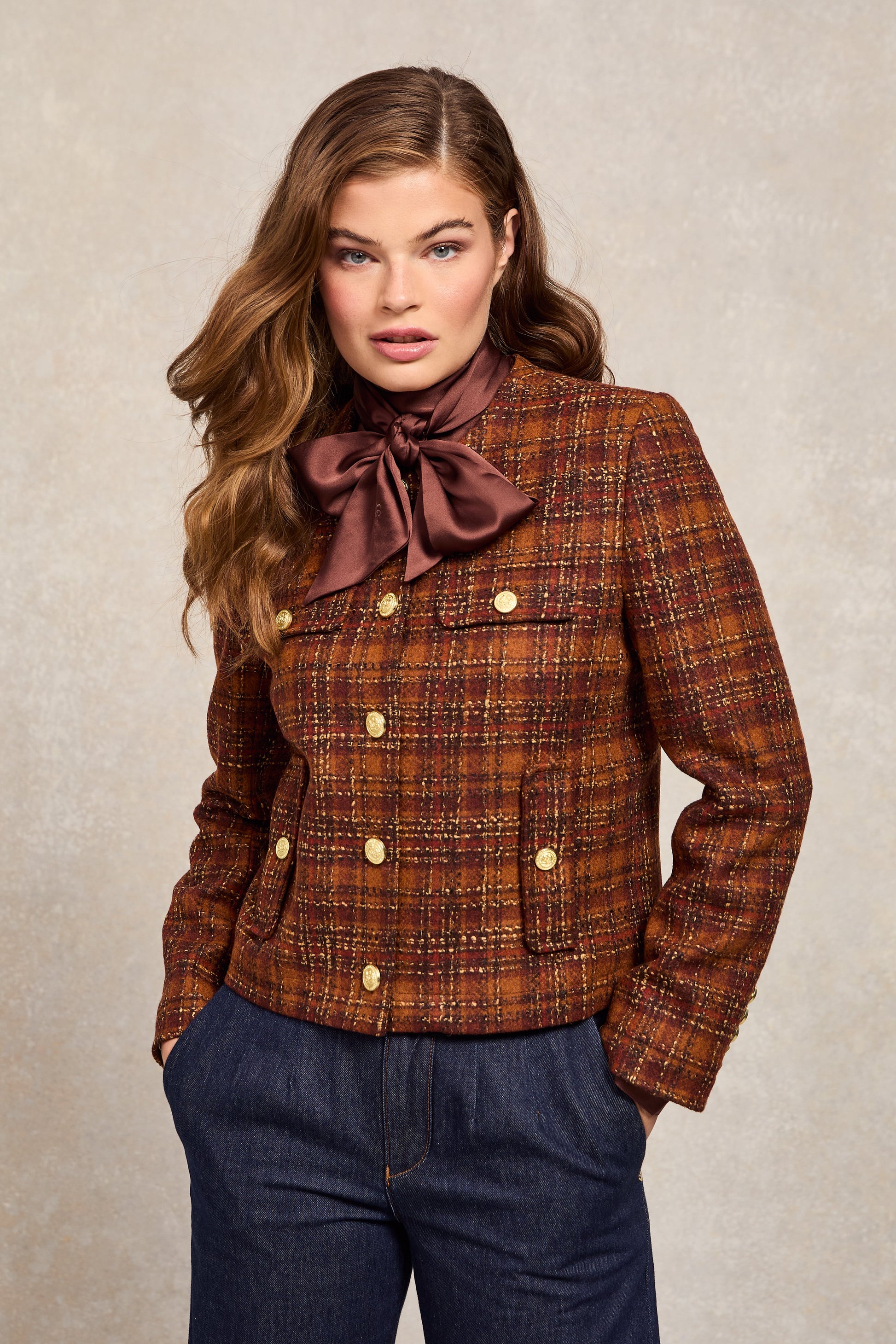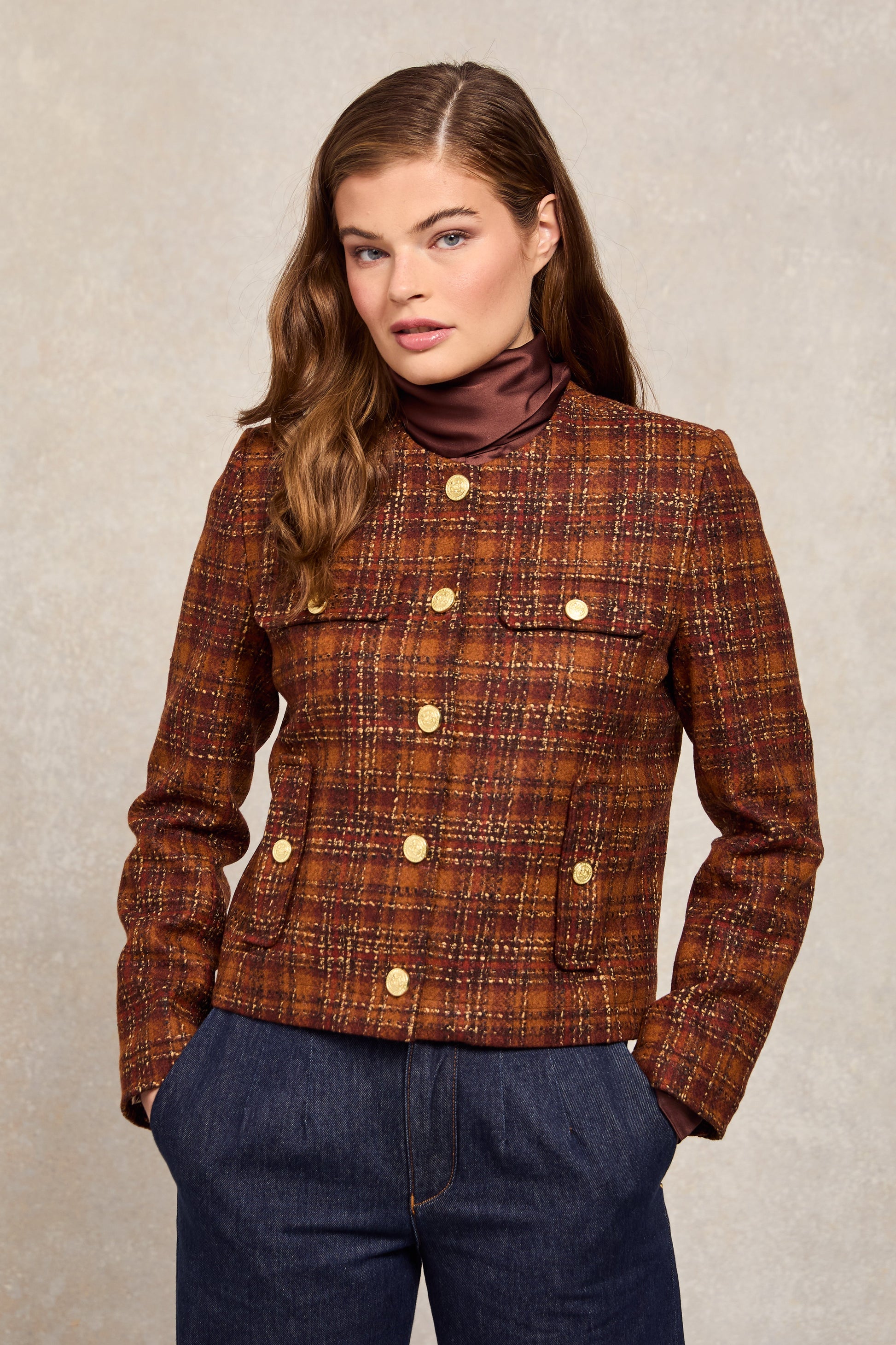 Perfectly blending a modern and vintage aesthetic, this jacket has been crafted with a slightly cropped, easy fit with articulated sleeves. The collarless feature adds a touch of versatility, making it the perfect pairing for shirts, dresses and high-neck tops. Bluff pockets on the chest with fictional pocket flaps, alongside lower side entry welt pockets, enhance its chic aesthetic. Finished with our signature Holland Cooper gold hardware, this jacket seamlessly blends timeless elegance with contemporary flair.