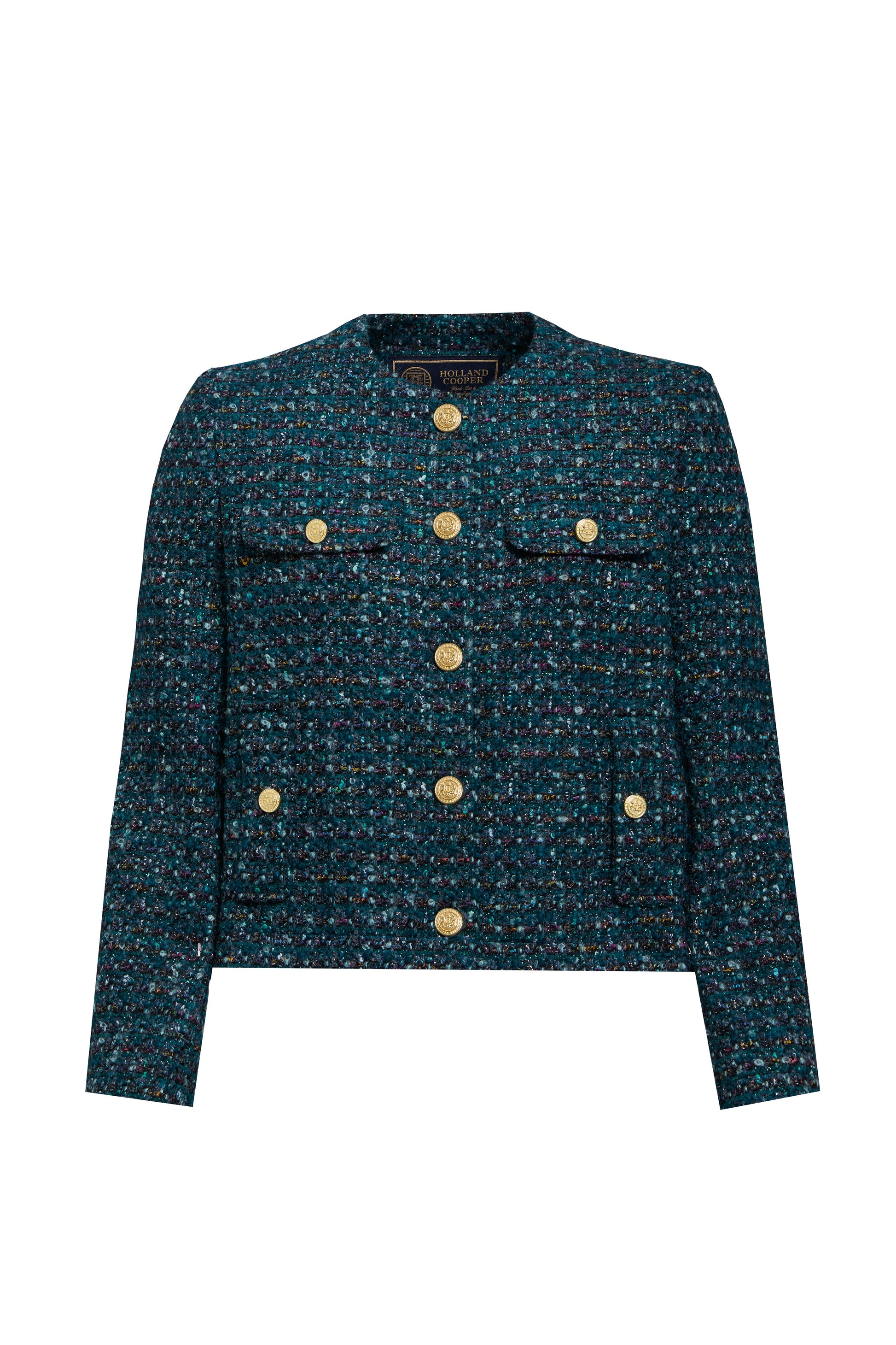 Perfectly blending a modern and vintage aesthetic, this jacket has been crafted with a slightly cropped, easy fit with articulated sleeves. The collarless feature adds a touch of versatility, making it the perfect pairing for shirts, dresses and high-neck tops. Bluff pockets on the chest with fictional pocket flaps, alongside lower side entry welt pockets, enhance its chic aesthetic. Finished with our signature Holland Cooper gold hardware, this jacket seamlessly blends timeless elegance with contemporary flair.