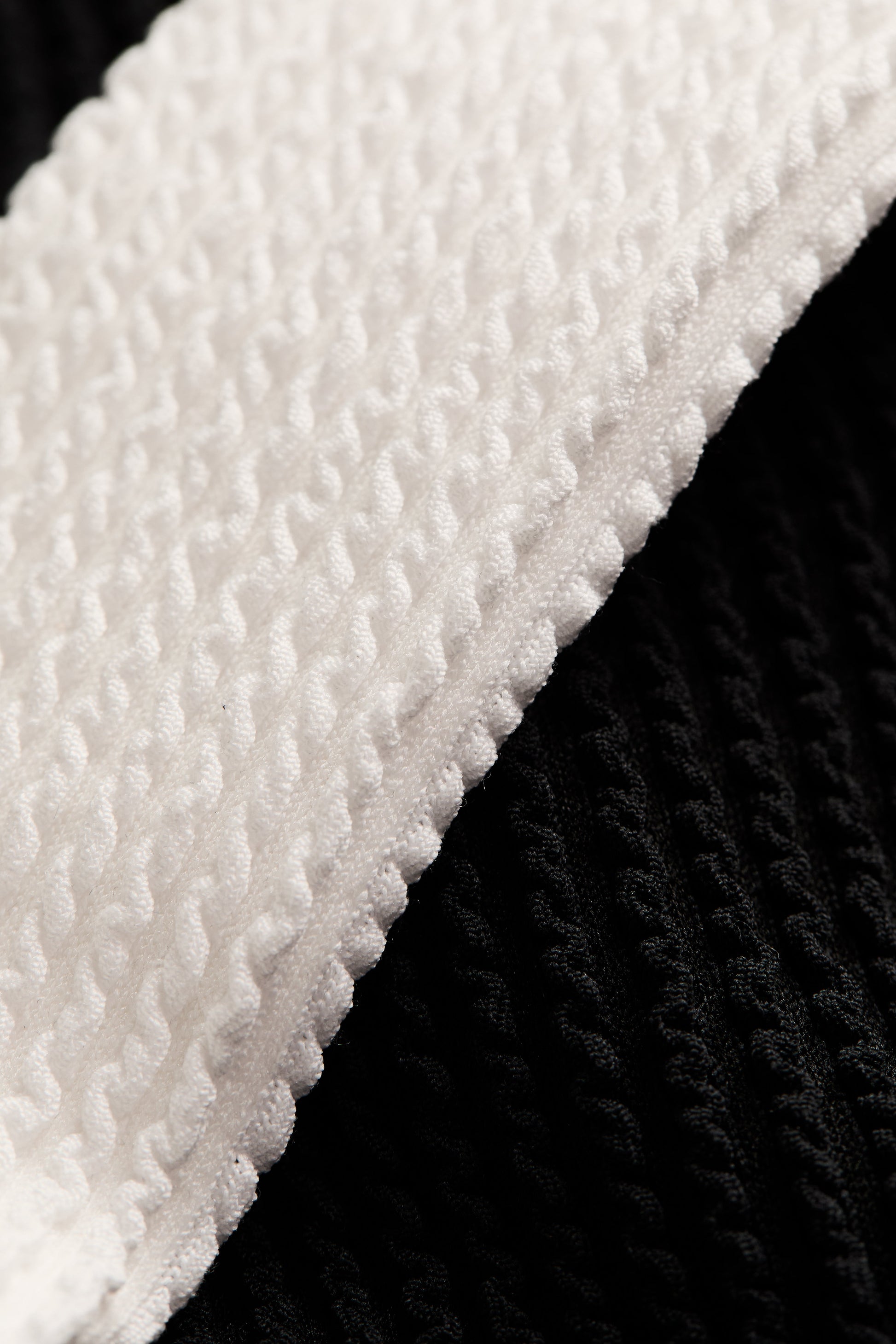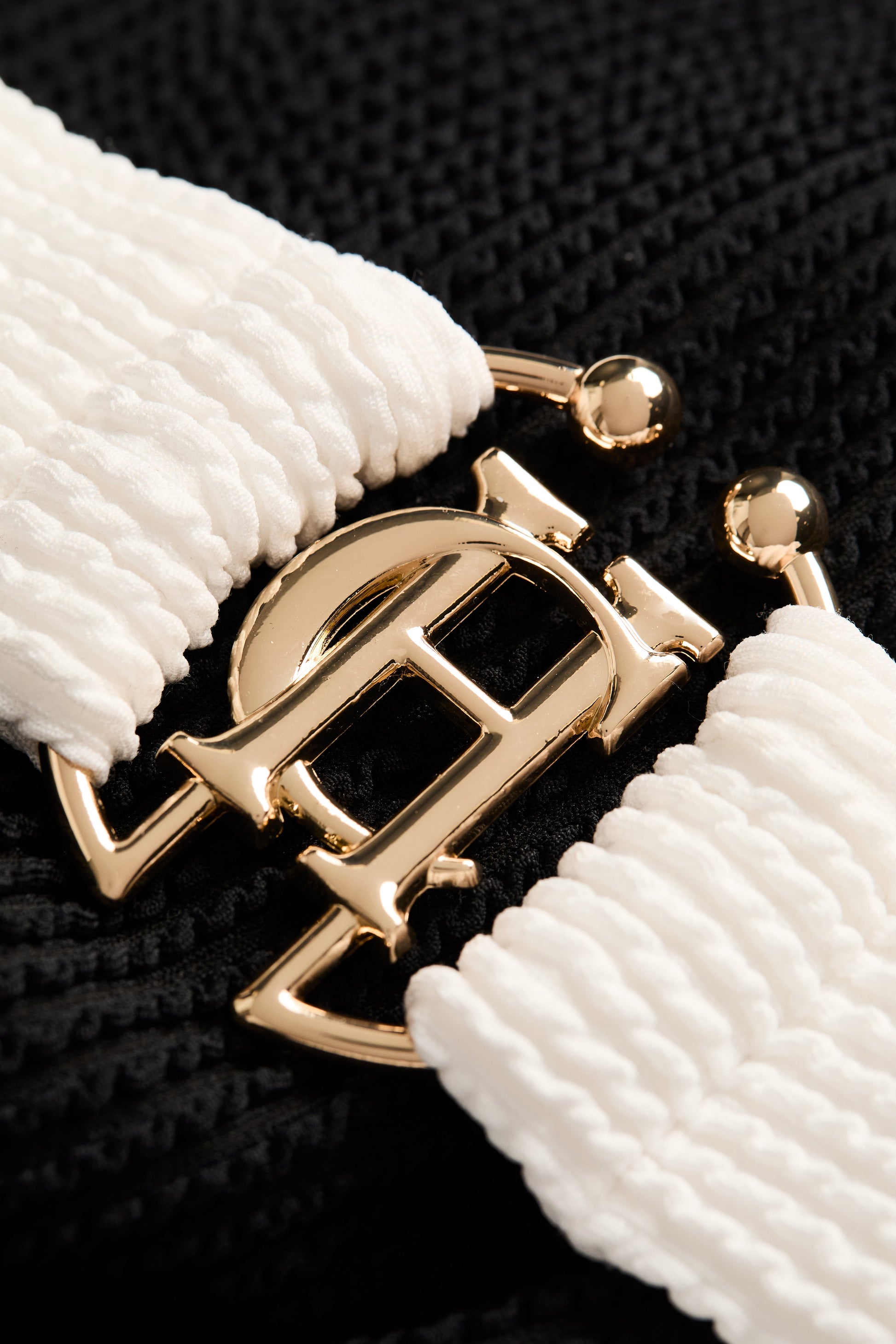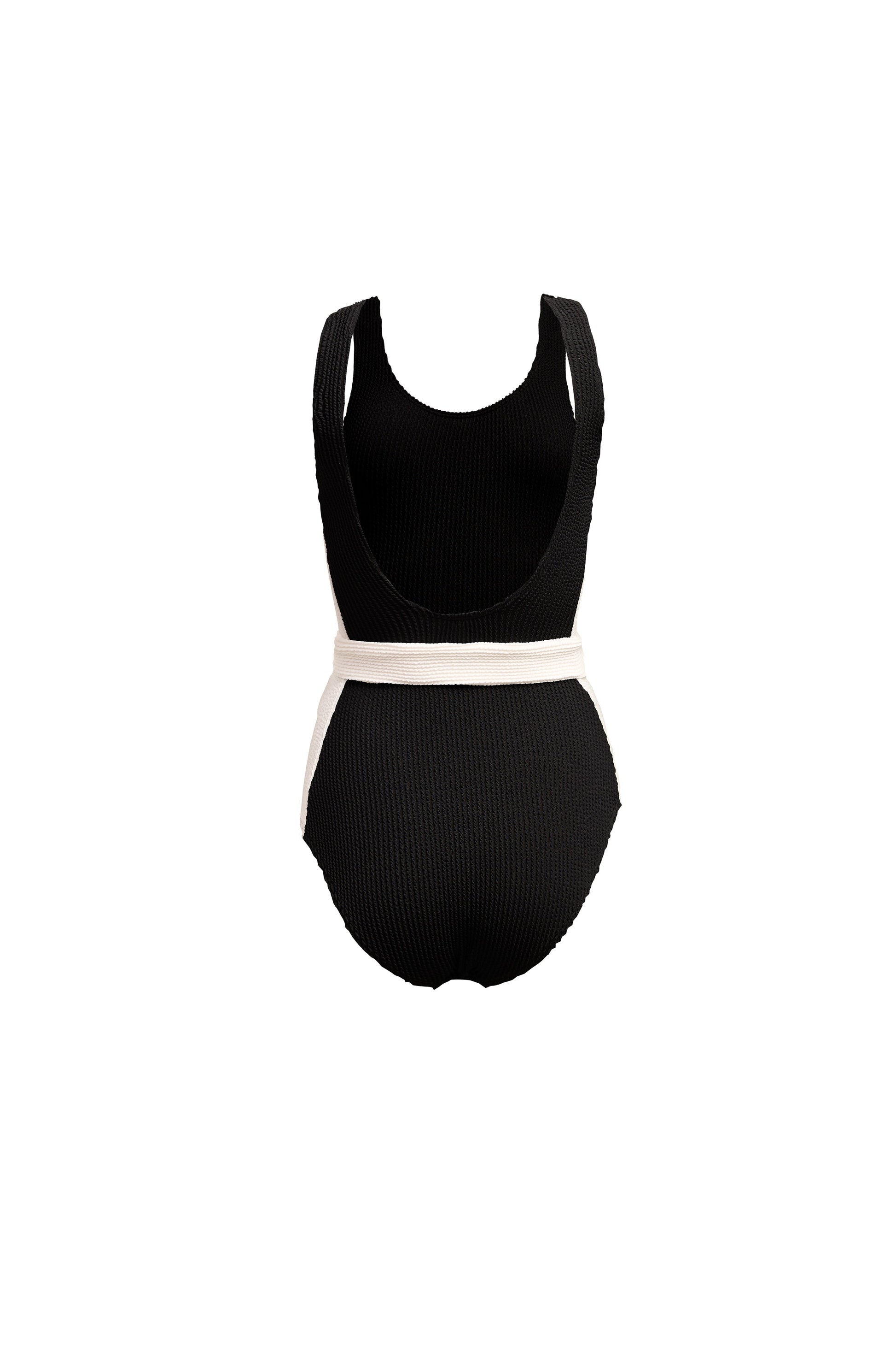 Crafted in luxurious 4-way stretch crinkle fabric, this striking one-piece features innovative contour shaping with considered contrast paneling for an exceptionally flattering fit. The signature HC hardware adorns the adjustable crinkle fabric belt, adding our distinctive equestrian polish. A graceful scoop neck and back create an alluring profile, while the premium fabric composition ensures lasting comfort and shape retention. The perfect fusion of classic design and contemporary luxury.