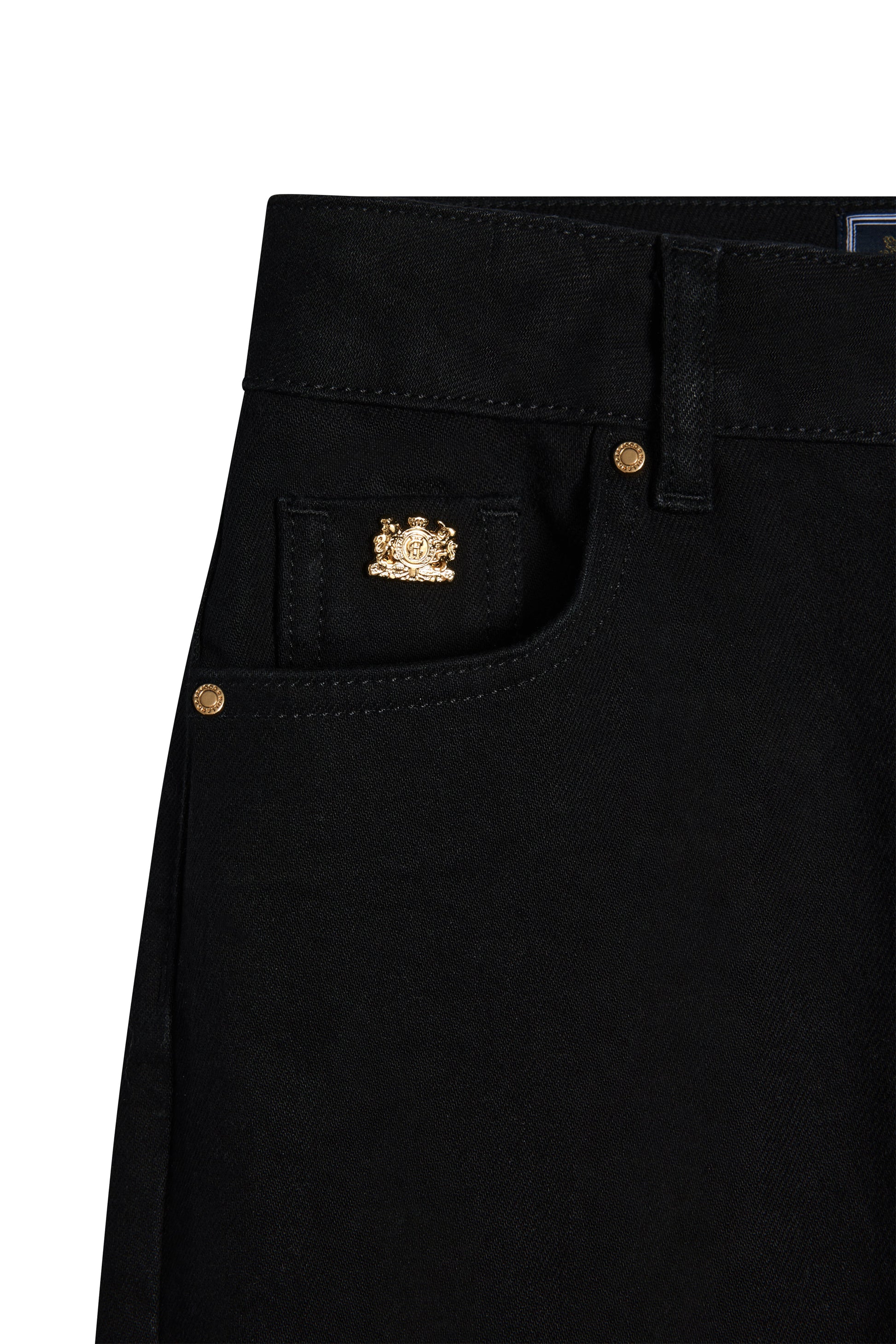 These jeans feature classic five-pocket styling and a single-shank waistband closure, ensuring a secure and comfortable fit. Adorned with signature gold hardware, they boast a high-rise design that accentuates them beautifully. Crafted for elegance, the jeans offer a long, straight leg with an outward seam for a retro-inspired silhouette. The leg width strikes the perfect balance - not too wide, not too slim - delivering a vintage feel with modern comfort. Whether you dress them up or down, these jeans are a versatile staple that exudes effortless style.