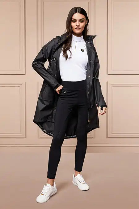 Lined with a luxuriously soft fleece, these water-resistant leggings were designed to ensure maximum movement and comfort whilst in and out of the saddle. High-waisted and made with a slim fit that lifts and contours your figure. Complete with monogrammed silicone riding knee grips and embellished with crystals to the leg.