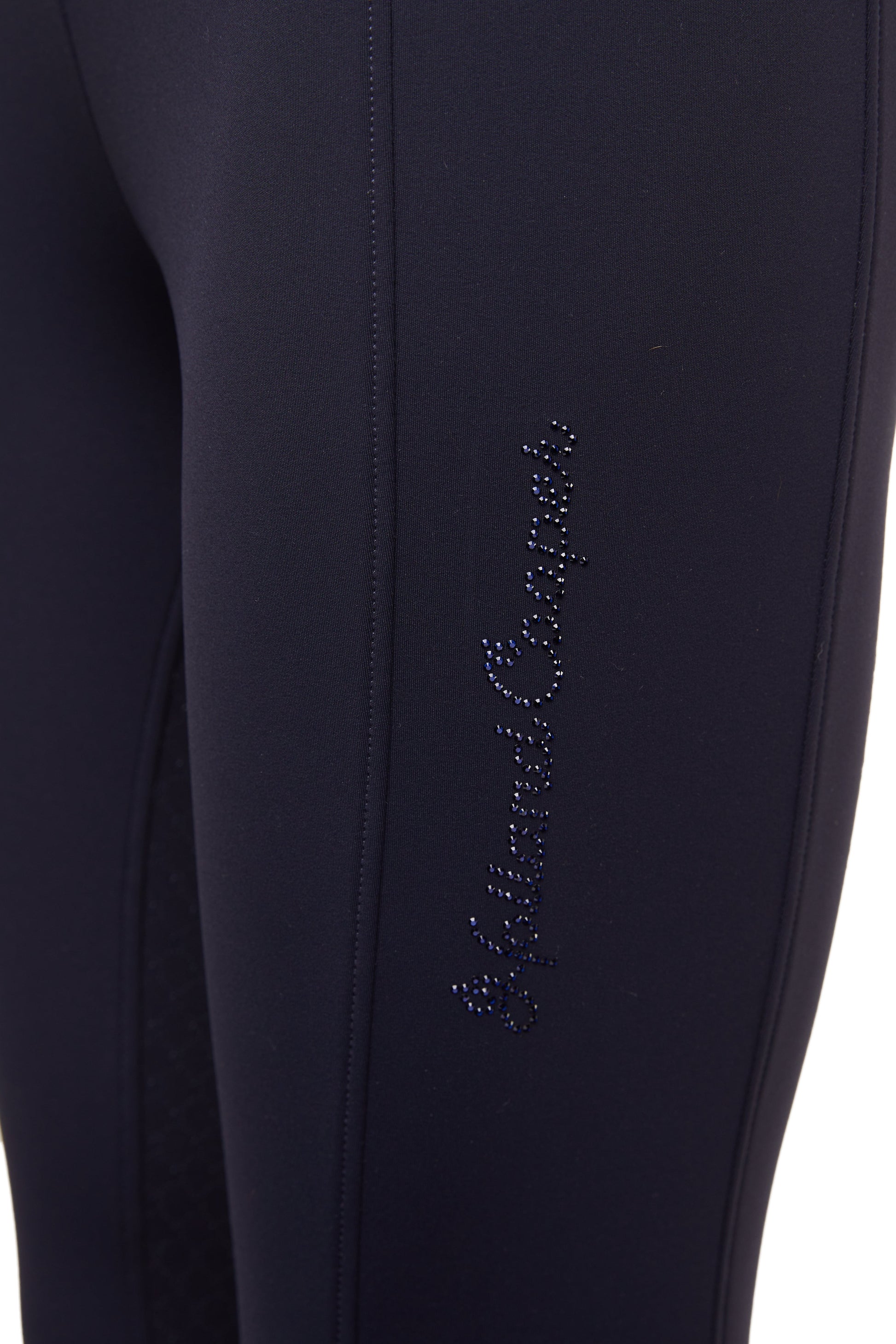 Lined with a luxuriously soft fleece, these water-resistant leggings were designed to ensure maximum movement and comfort whilst in and out of the saddle. High-waisted and made with a slim fit that lifts and contours your figure. Complete with monogrammed silicone riding knee grips and embellished with crystals to the leg.