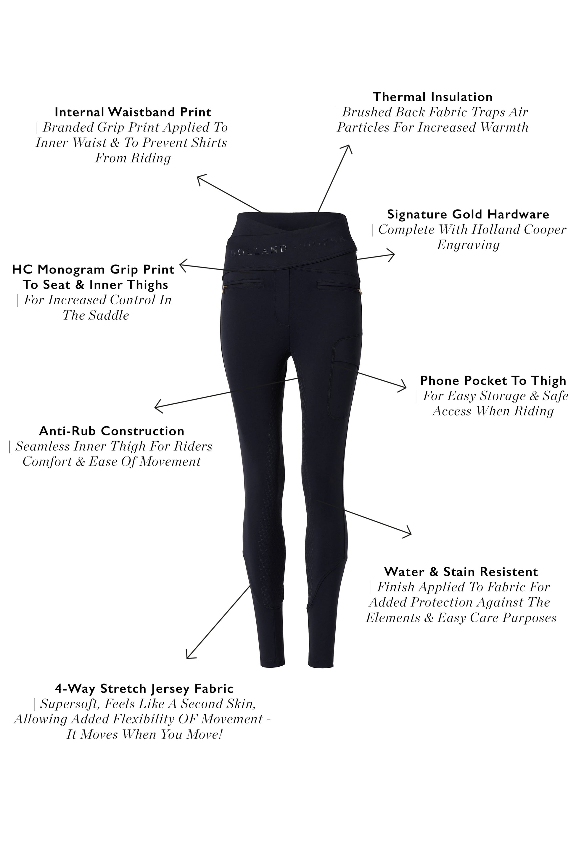 Where performance meets style, our new Cooper Training Breeches have been crafted from a thermal insulated fabric for increased warmth. Providing support and comfort, the branded crossover waistband ensures a secure fit. With grip-printed elastic tape inside the back waistband to prevent shirts from rising, the HC monogram grip print to the seat & inner thigh increases control in the saddle. With a phone pocket on the leg and jetted pockets on the front featuring branded monogram zip pull.
