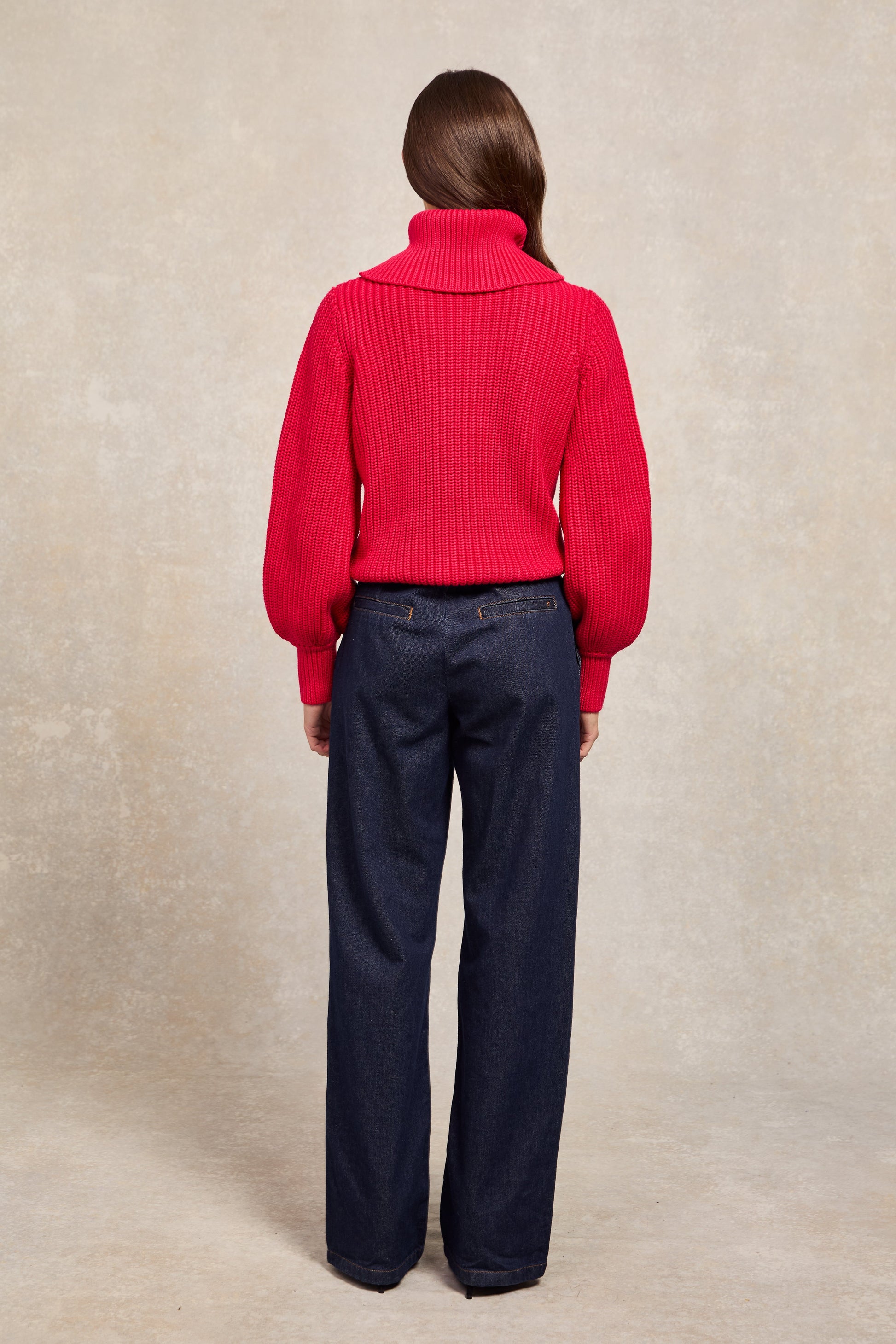 The Corded Roll Neck Knit features a cozy ribbed cowl neck and super soft cable detailing for ultimate comfort. With a set-in sleeve design that adds fullness around the cuffs, this knit combines style and ease. The body showcases mixed cables, contrasted by a plain knit back, while five rivets on the cuffs offer a subtle, elegant finish.