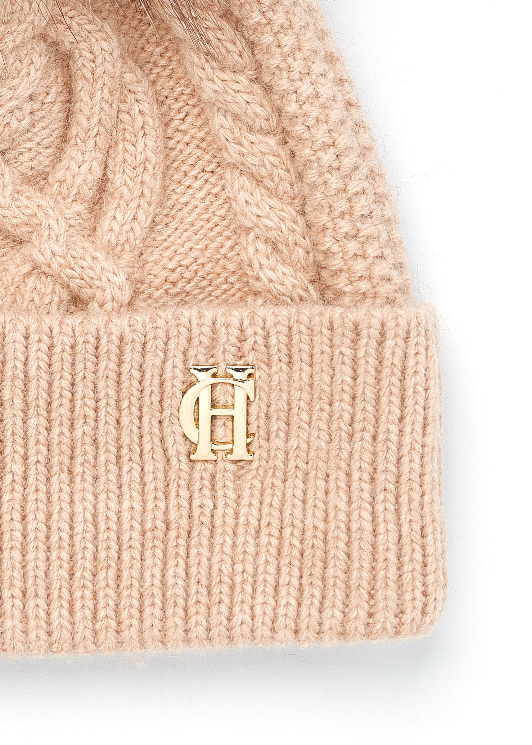 Elevated in seasonal colours, this hat has been crafted from a delicate & subtle yarn. Designed with a luxurious detachable bobble crafted from faux fur. Created with a cable knit aesthetic & detailed with a subtle HC pin finish.