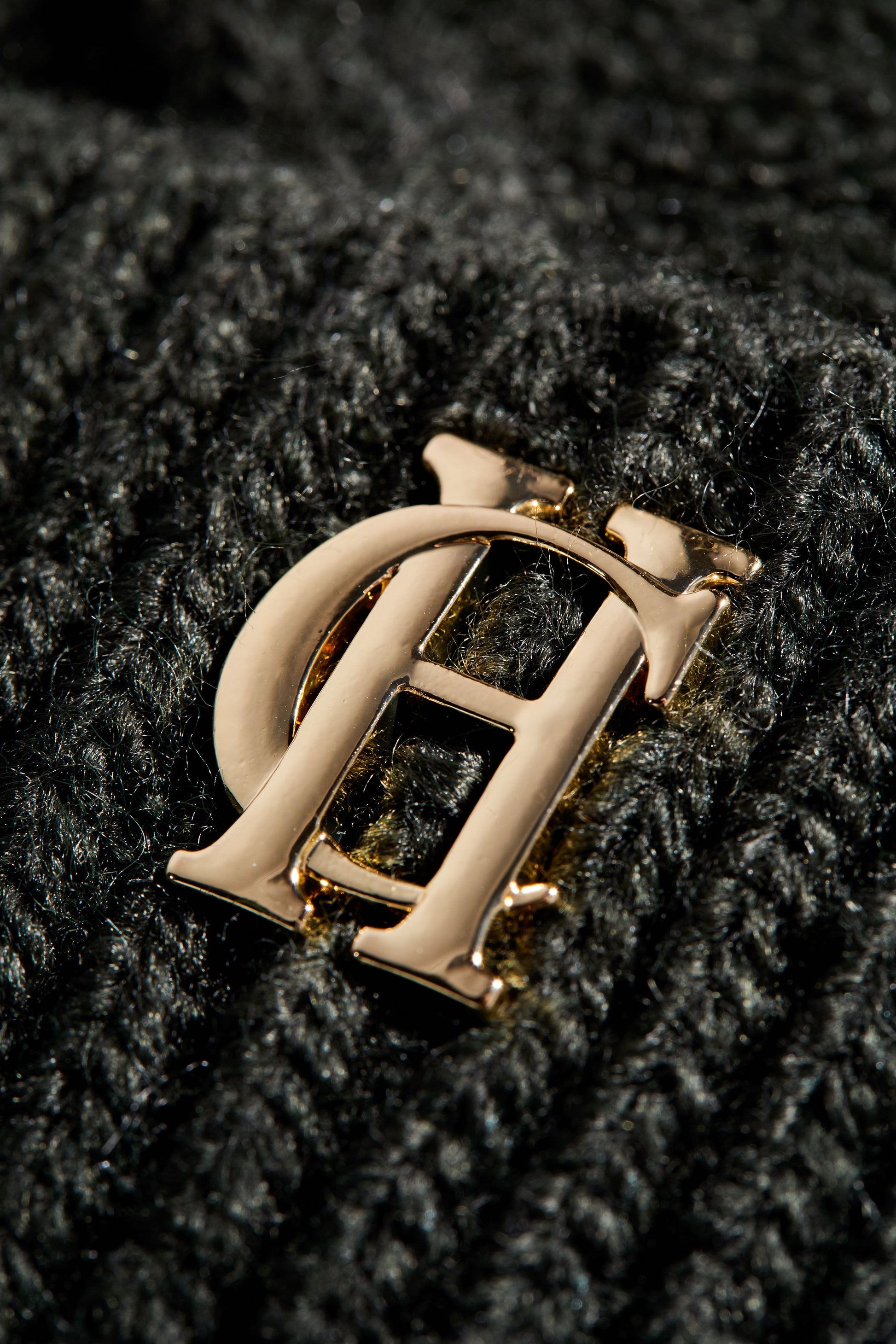 Elevated in seasonal colours, this hat has been crafted from a delicate & subtle yarn. Designed with a luxurious detachable bobble crafted from faux fur. Created with a cable knit aesthetic & detailed with a subtle HC pin finish.