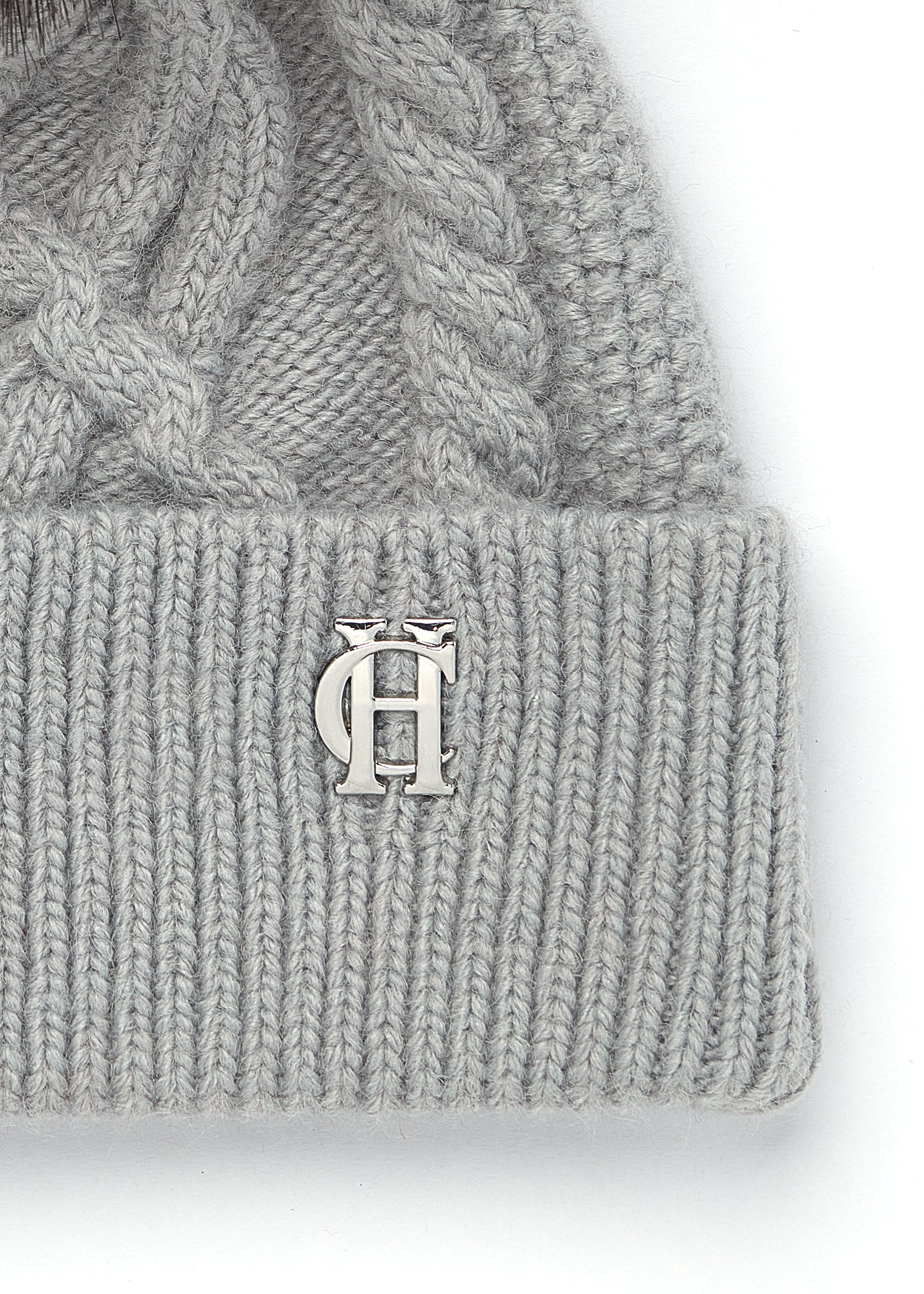 Elevated in seasonal colours, this hat has been crafted from a delicate & subtle yarn. Designed with a luxurious detachable bobble crafted from faux fur. Created with a cable knit aesthetic & detailed with a subtle HC pin finish.
