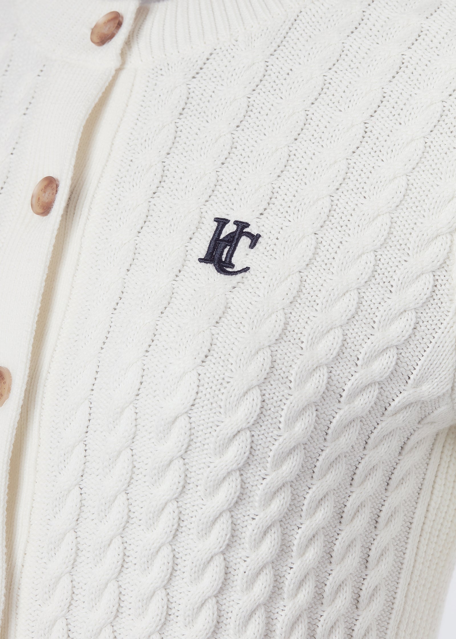 Crafted from the softest cotton, this cardigan features an elegant cable pattern on both the body and sleeves, adding a touch of sophistication to your wardrobe. Embellished with the iconic HC embroidery on the chest and horn button detailing, every element of this cardigan is carefully curated for a timeless and luxurious feel.