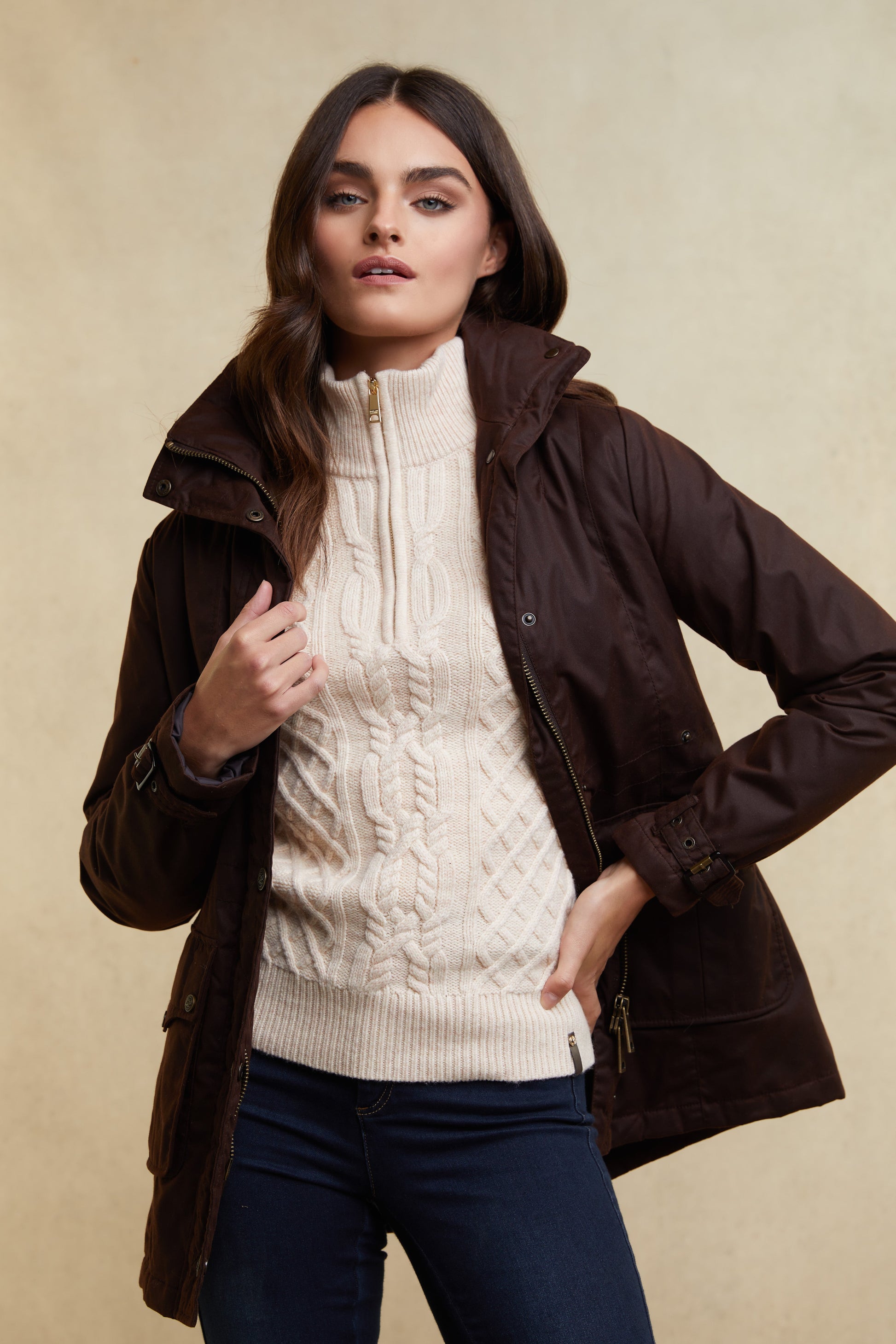 The Country Cable Quarter Zip Knit features a ribbed roll neck collar, cuffs, and hem, complimented by a quarter-zip with a branded signature shiny gold zipper. The classic cable knit pattern is enhanced with dark brown elbow patches for a refined touch, while horn effect buttons add a traditional, rustic element to the design. This knit seamlessly blends style and functionality, perfect for a timeless, country-inspired look.