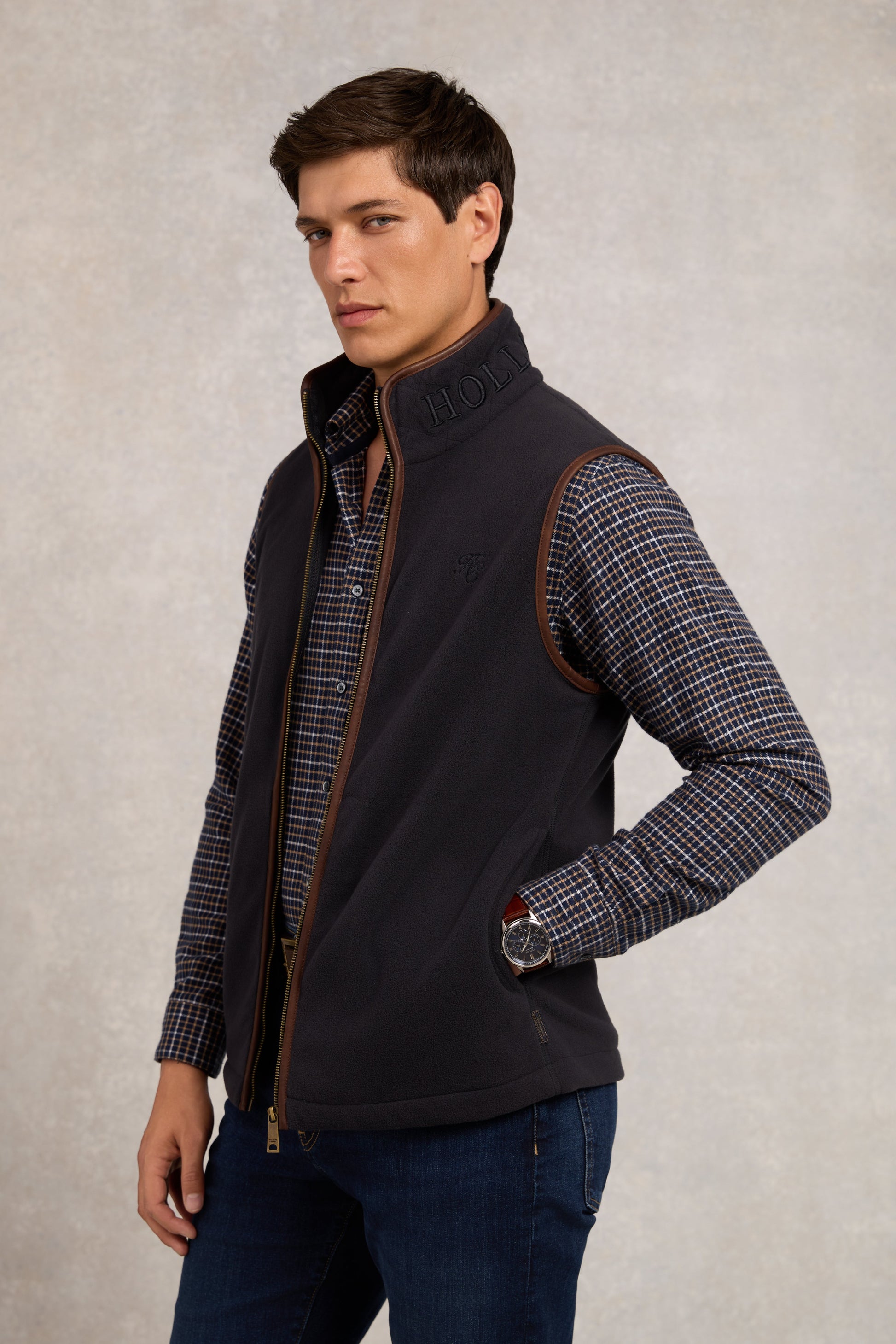 Expertly crafted from technical polar fleece fabric with a full centre zip, this piece has been designed to layer and ensure style on the coldest of days. Detailed with faux leather piping and subtle HC embroidery to the chest, the hidden seamed pockets ensure a smooth and clean fit when worn. Finished with our iconic antique brass fastenings and metal hardware. Layer under our Cheltenham Coat for a classic and British look.