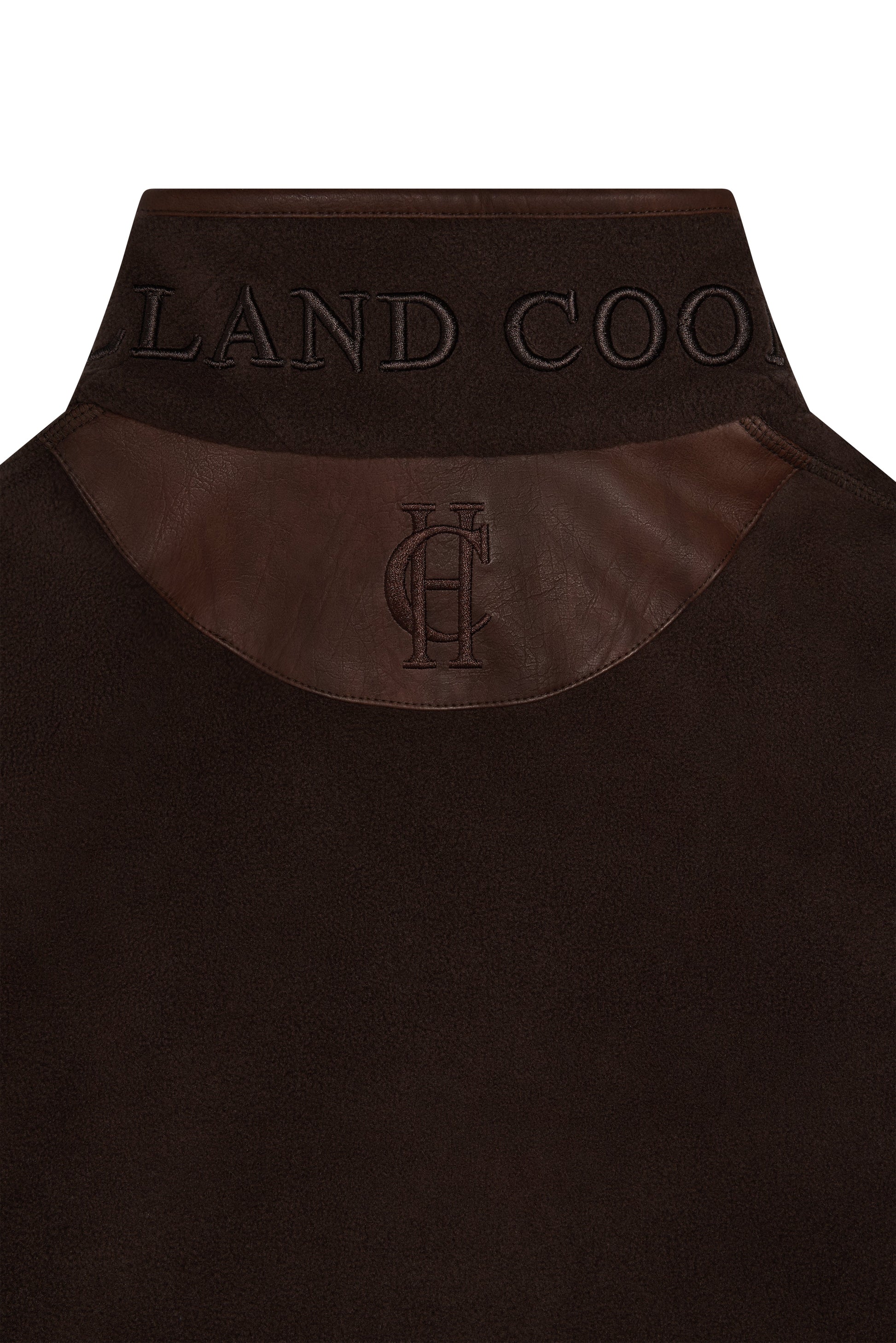 Detailed with faux leather piping and subtle HC embroidery to the chest, the hidden seamed pockets ensure a smooth and clean fit when worn. Elevated with contrasting embroidered back yolk and fleece elbow patches. Finished with our iconic antique brass fastenings and metal hardware.