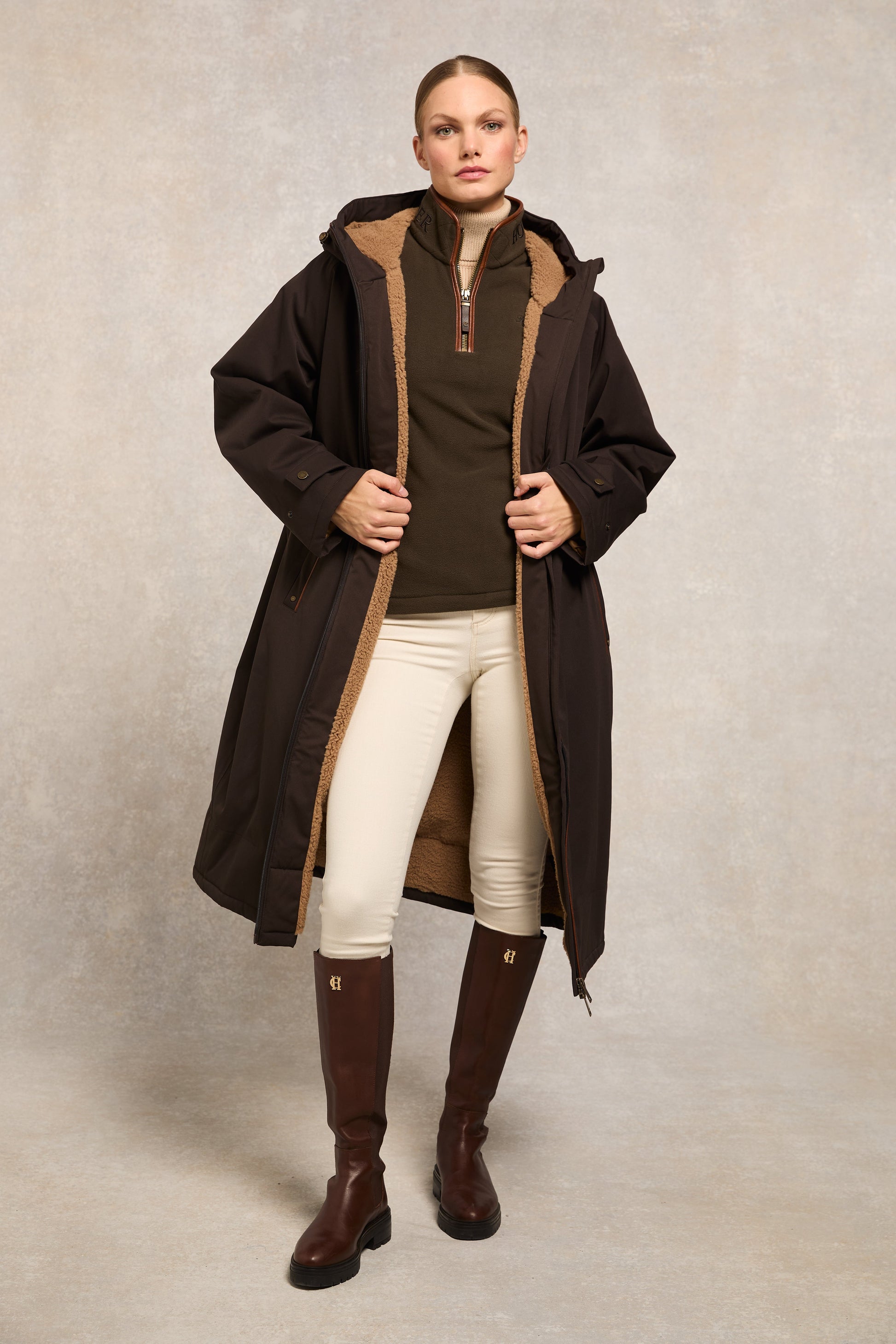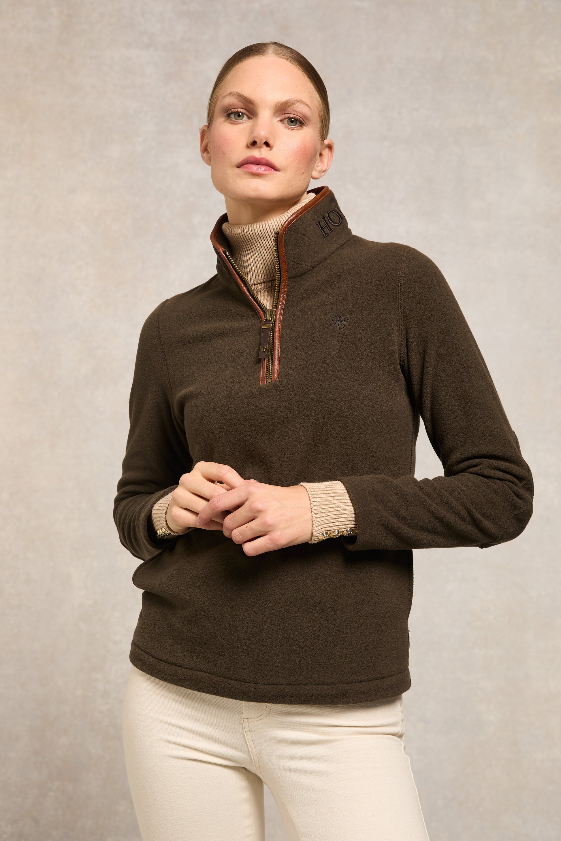 Detailed with faux leather piping and subtle HC embroidery to the chest, the hidden seamed pockets ensure a smooth and clean fit when worn. Elevated with contrasting embroidered back yolk and fleece elbow patches. Finished with our iconic antique brass fastenings and metal hardware.