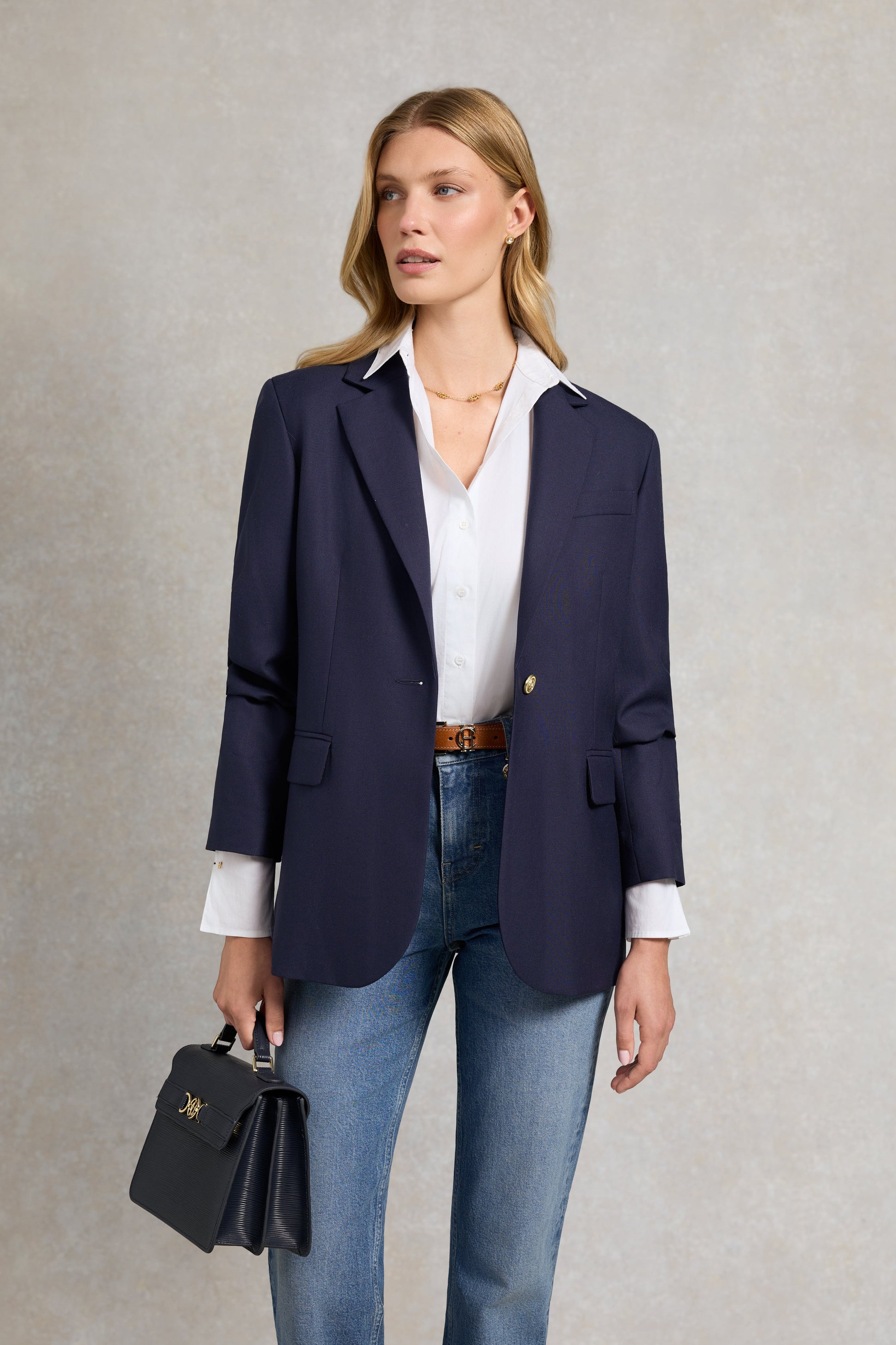 A fresh take on a wardrobe staple, this Classic White Button Down Shirt blends timeless tailoring with feminine detail. It features a relaxed boxy fit and a crisp button-down front with a classic collar. Decorative pleated sleeves add a subtle statement, while a box pleat at the back enhances the silhouette with ease of movement. Finished with signature HC embroidery on the body and gold branded hardware at the cuffs and back yoke, this elevated essential brings refined charm to everyday dressing.