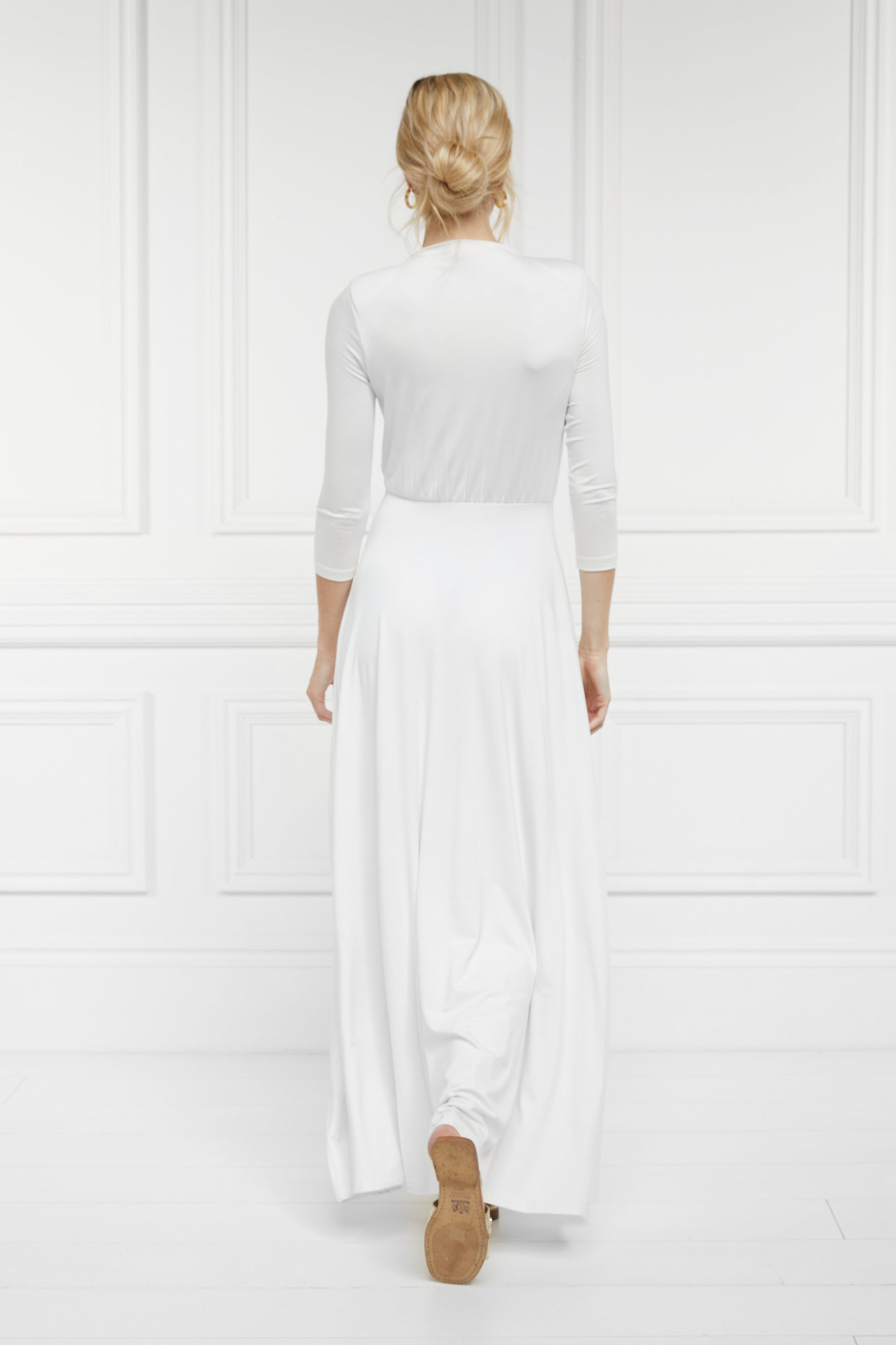 Both elegant and feminine, our new maxi dress is the epitome of chic styling. Crafted from a luxuriously soft fabric, the maxi length encourages an elegant drape when worn. With lightly padded shoulder with a flattering high neckline, the waist ever so slightly cinches you in to flatter your silhouette. Double-layered for comfort and a smoothing effect, this dress is a timeless essential for your wardrobe. Detailed with our iconic gold hardware.