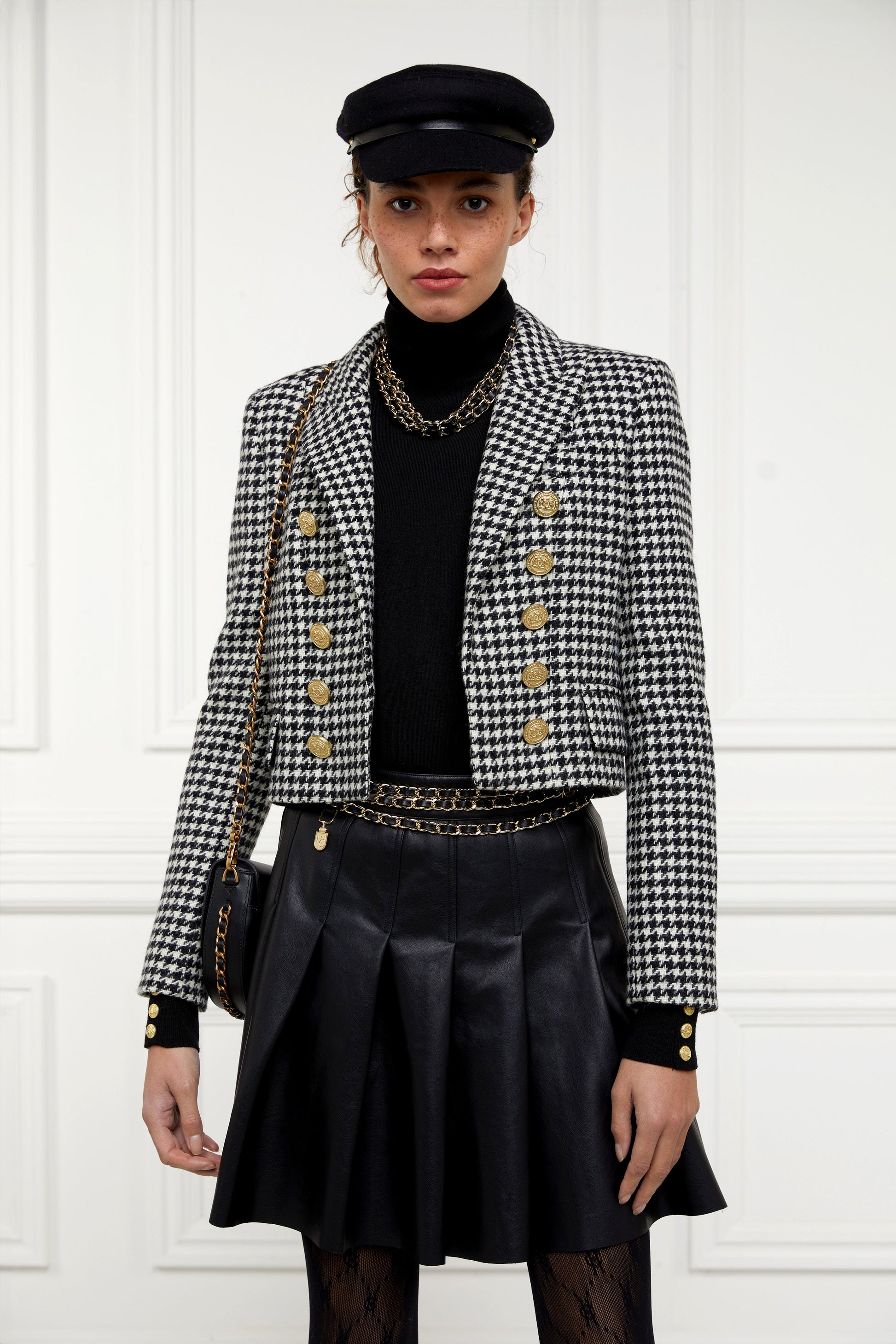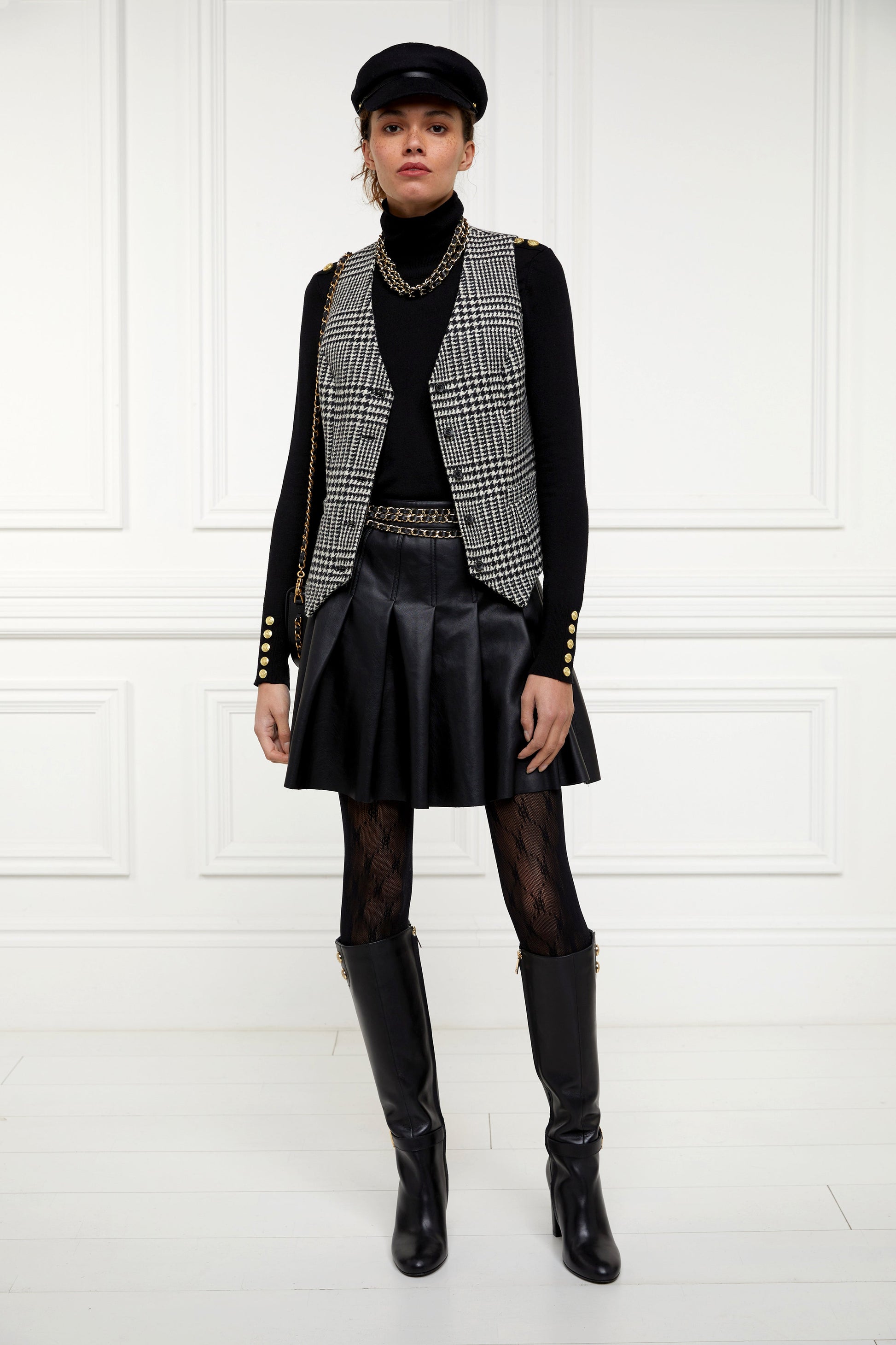 Introducing our vintage-inspired pleated mini skirt, a chic and modern twist on a timeless classic. This mini skirt features elegant knife pleats all around, offering a playful yet sophisticated silhouette. Crafted from super supple and soft faux leather fabric with a refined grain effect, it provides luxurious comfort and style. The extra thick leather topstitching adds durability and a touch of boldness, while the signature gold metal hardware elevates the overall design. Perfect for making a statement, this skirt is a versatile piece that seamlessly blends vintage charm with a modern edge.