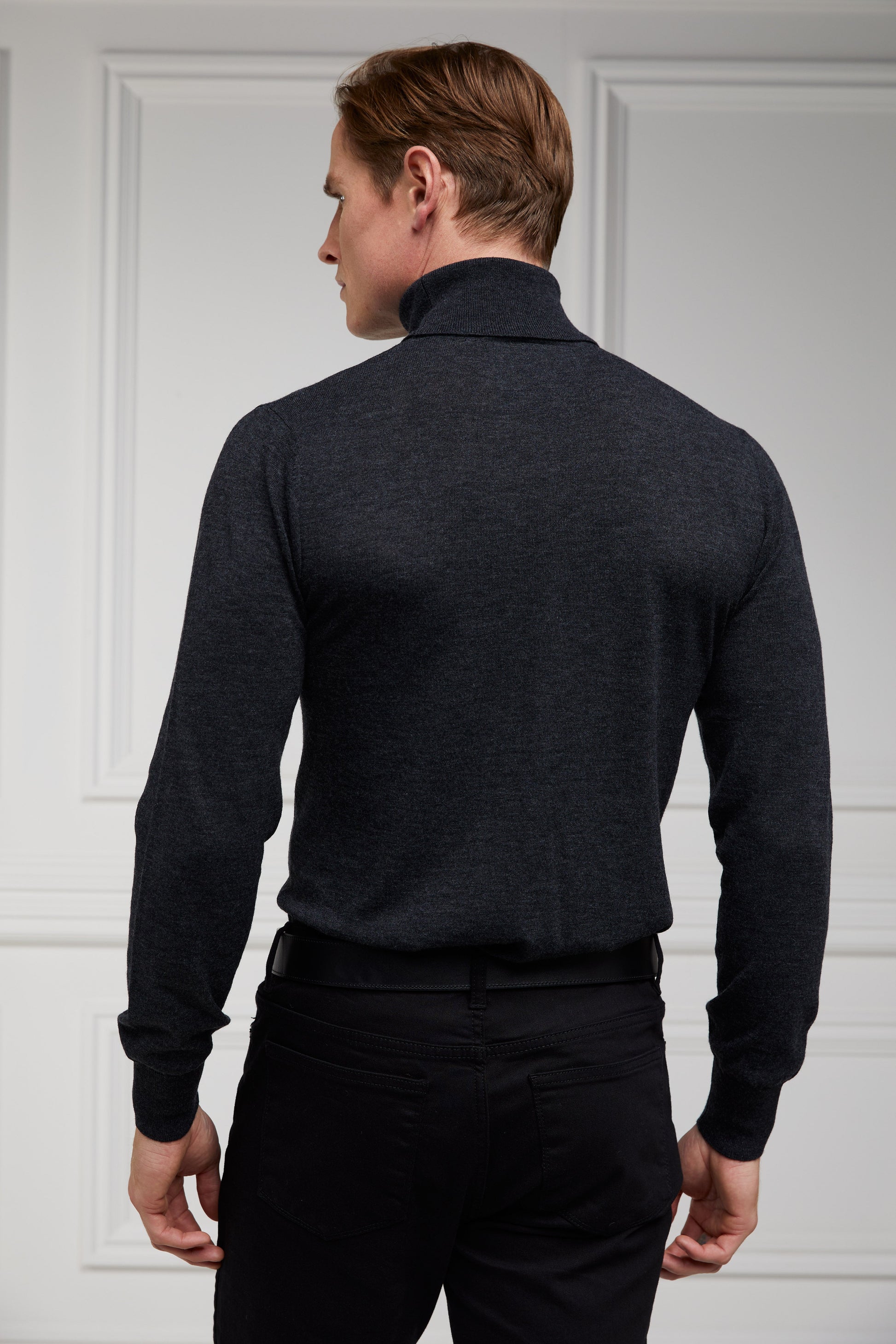 Meticulously crafted using a premium merino wool blend for an understated classic look. A wardrobe essential which exudes sophistication, this knit offers a slim fit with a ribbed hem, cuff and roll neck. The merino wool offers exceptional comfort and warmth whilst remaining breathable and lightweight. Wear alone or layer under one of our pieces of classic British tailoring.