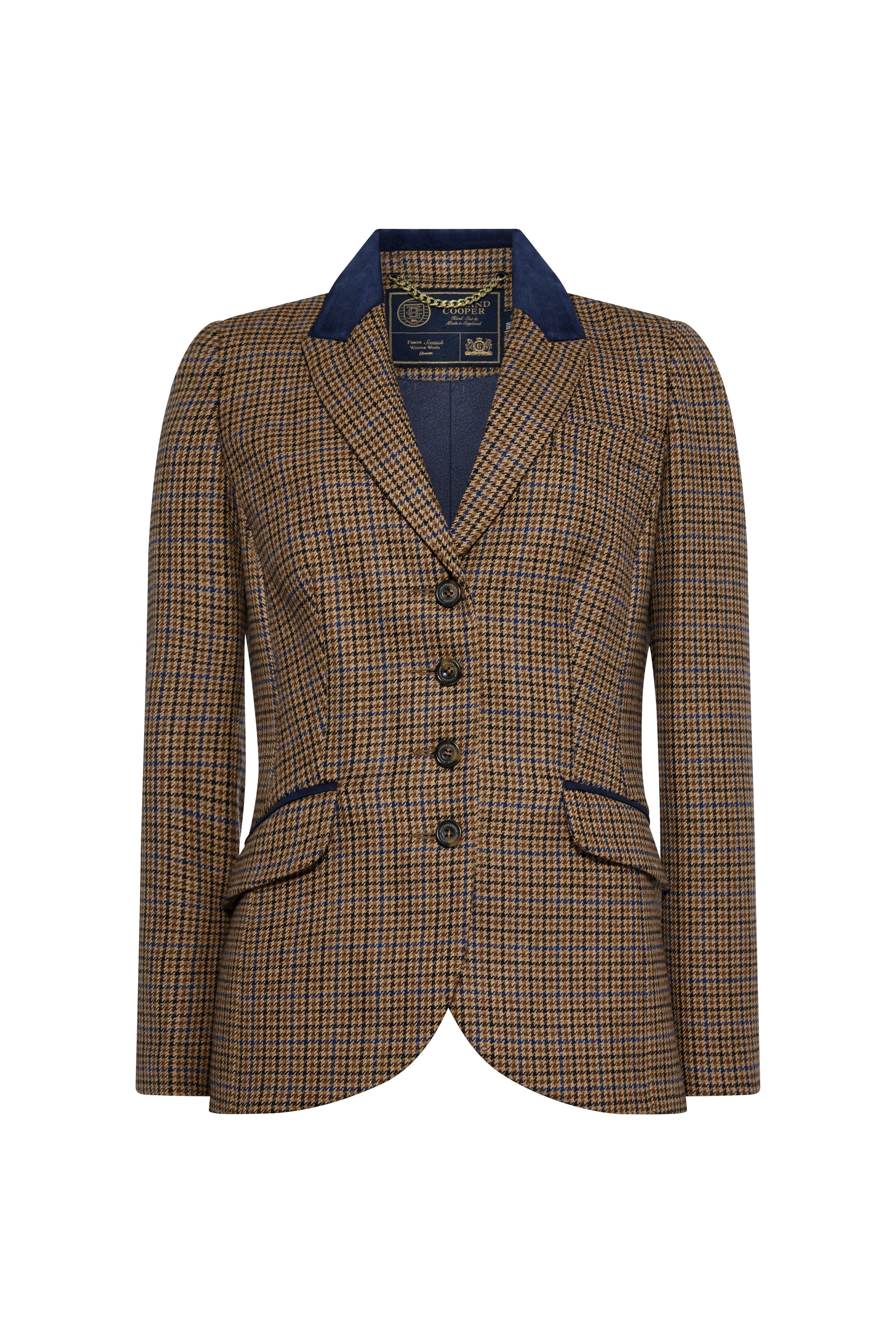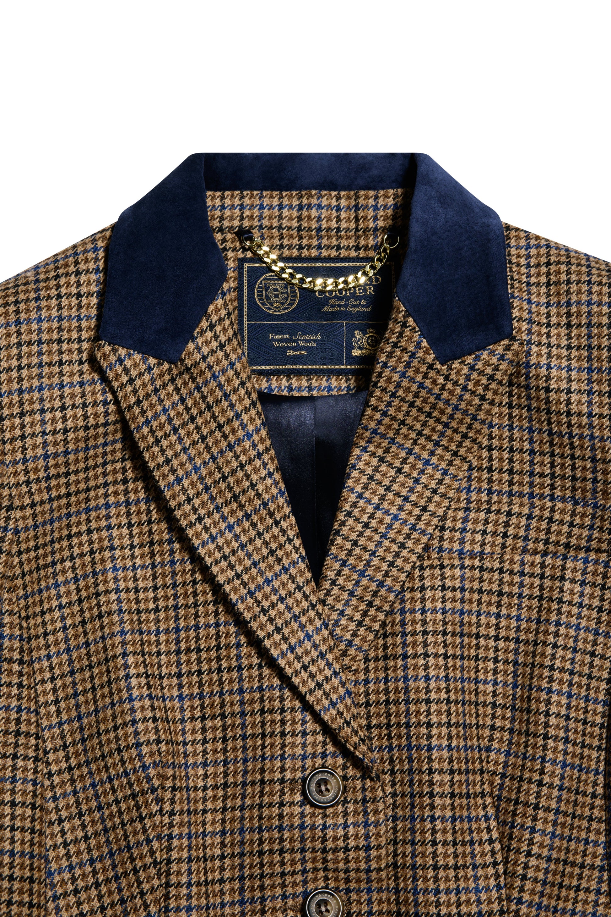 The Hacking Jacket has been designed with both sophistication and function in mind. Cut to a flattering fitted silhouette, it ensures ease of movement while maintaining a refined, polished look. Crafted from the finest Scottish tweed, the design is elevated with a contrast suede top collar and pocket piping, adding a subtle touch of heritage charm. Finished with understated horn buttons and a new discreet branding detail at the cuff featuring our heraldic HC, this jacket embodies timeless countryside style with a contemporary edge.