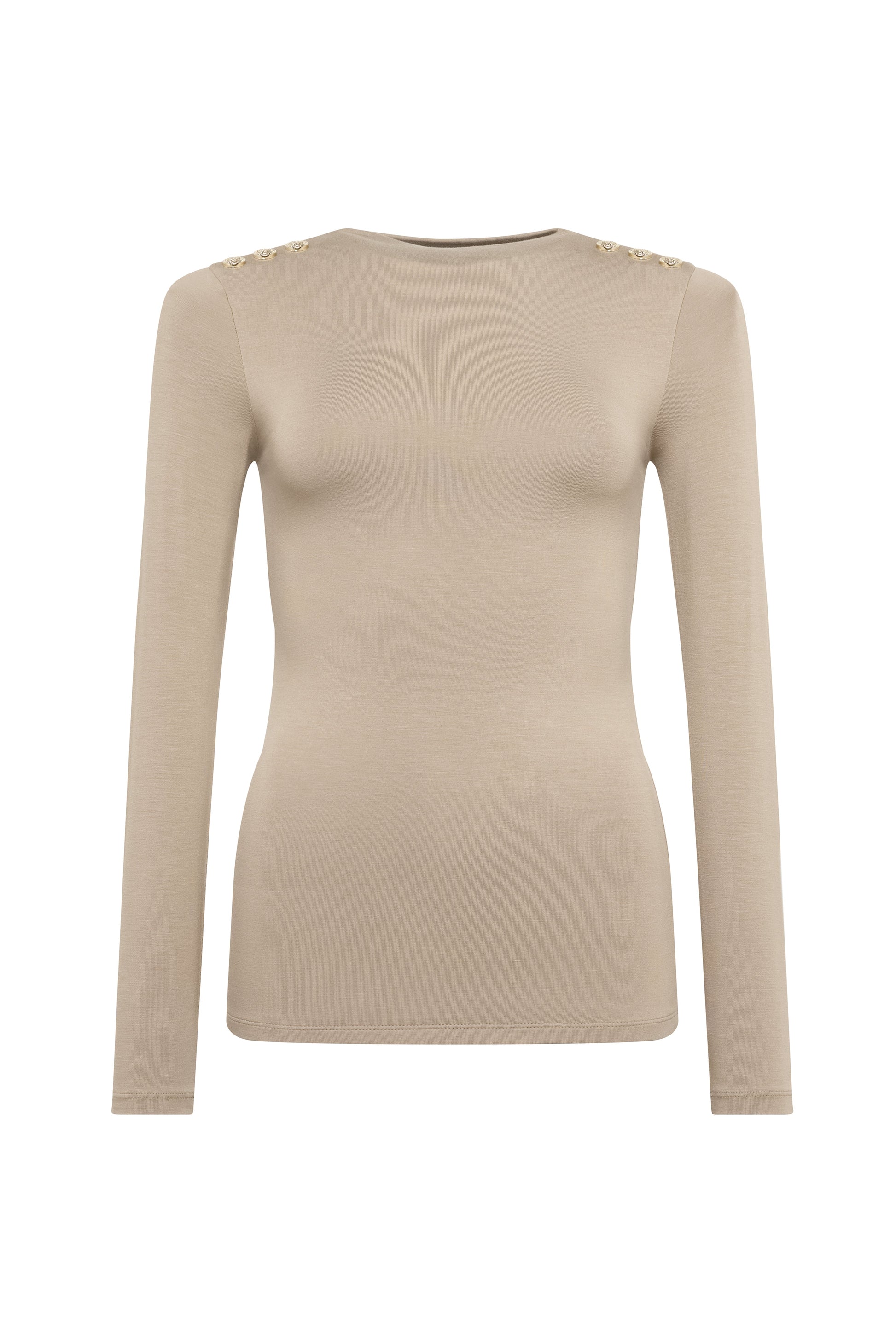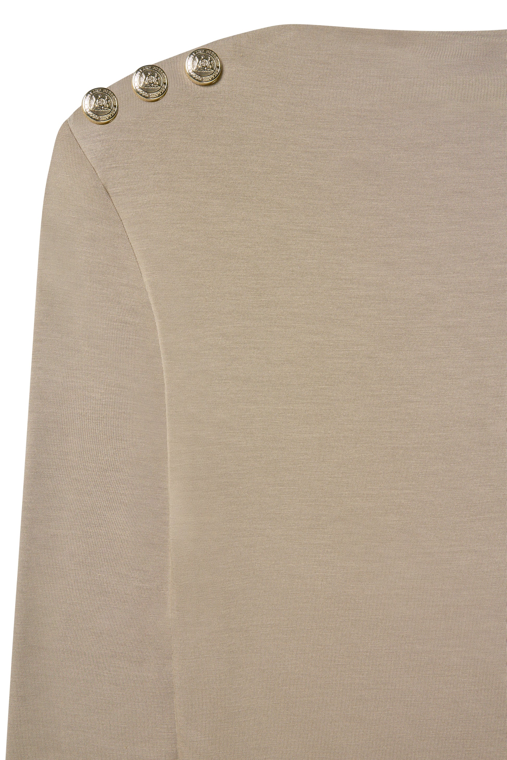 Exuding effortless sophistication, the Harper Long Sleeve Top in natural combines luxurious comfort with refined detailing. This double-layered piece offers elegant draping and exceptional wearability. Distinguished by signature crested rivets at the shoulders, it's an elevated essential that seamlessly transitions from day to evening.