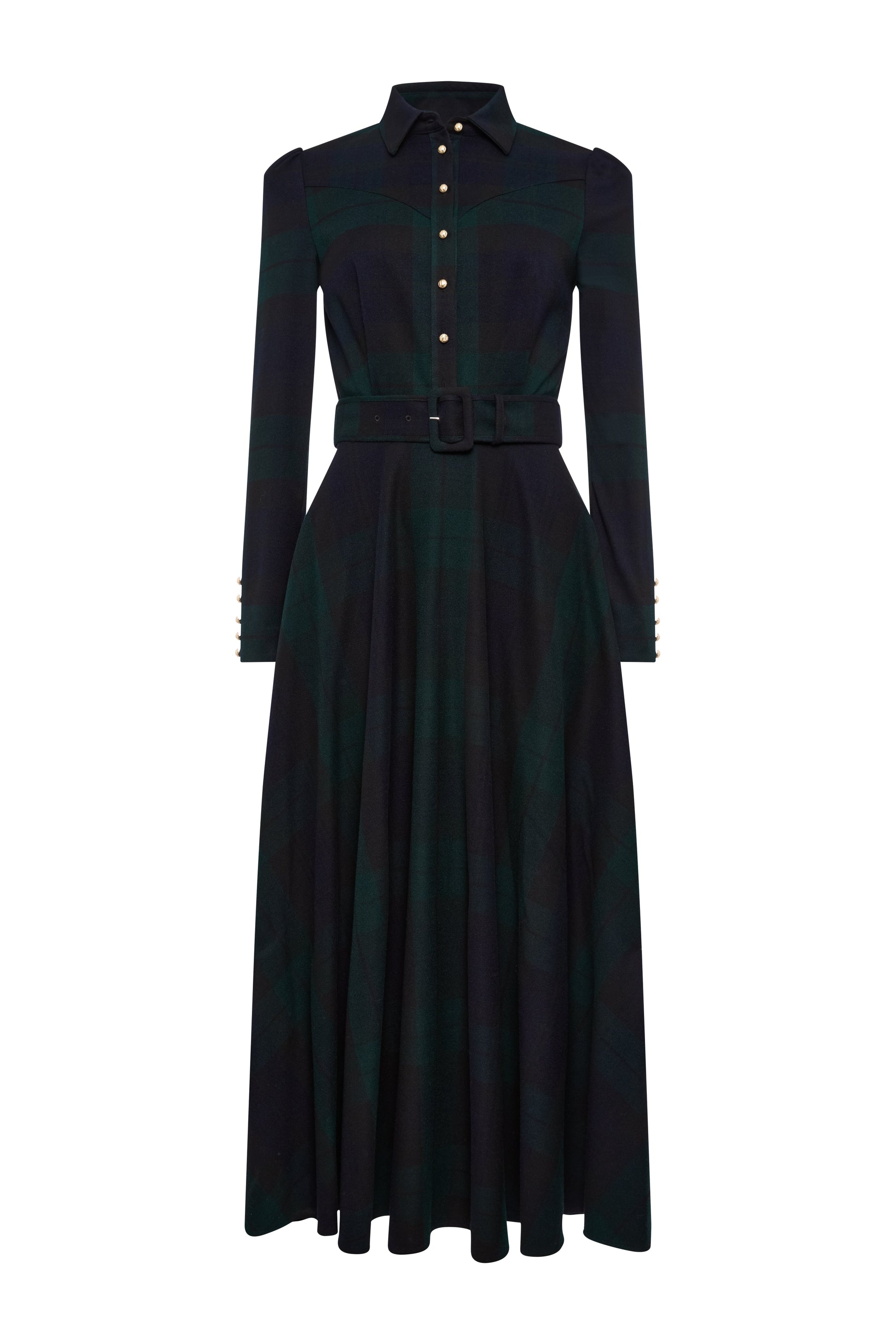 Designed for both elegance and ease, the dress includes an invisible side zip for effortless wear, a self-covered belt to cinch the waist, and softly gathered sleeve. Rouleau loop fastenings at the cuffs, finished with signature HC gold buttons, complete the look with a refined touch.