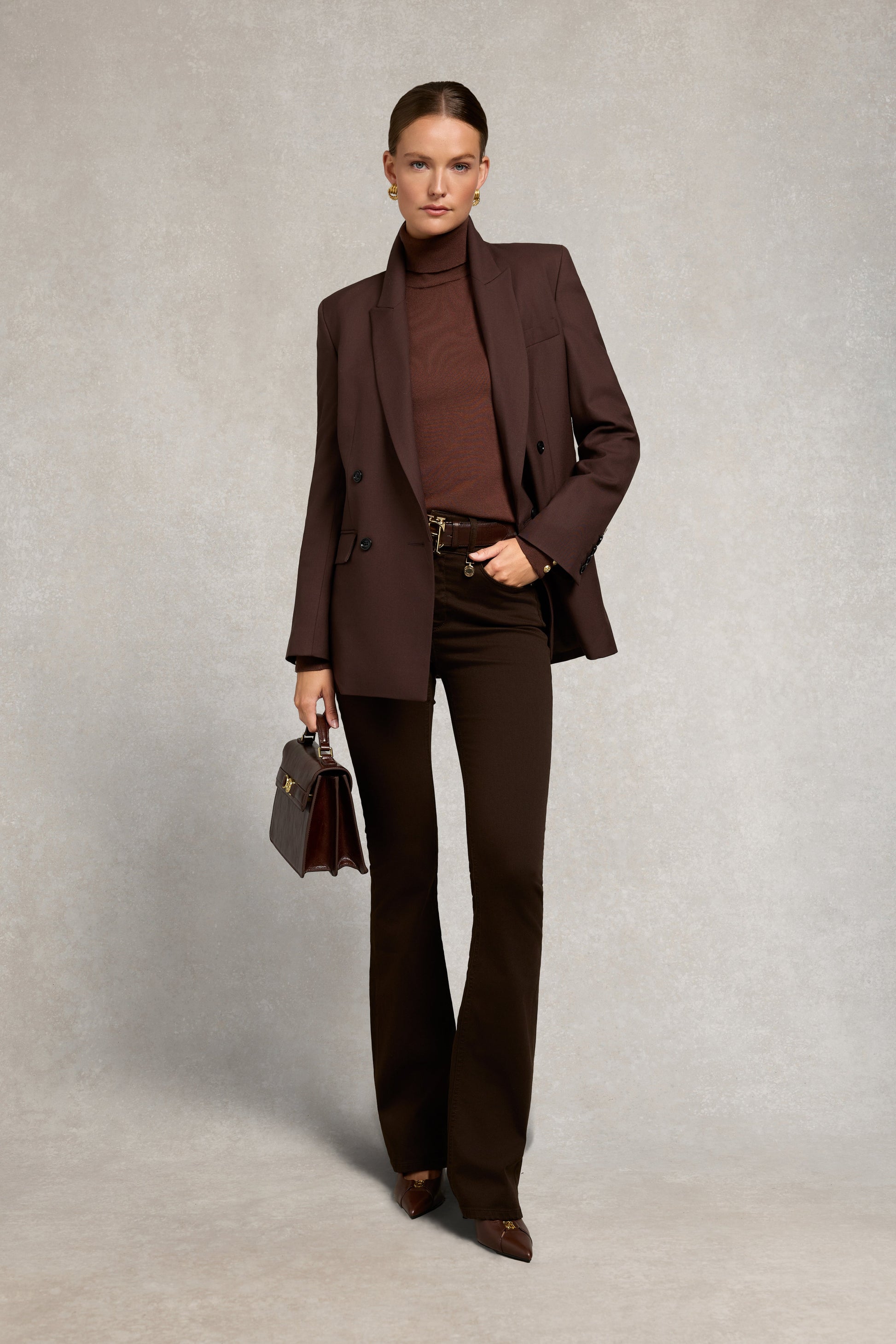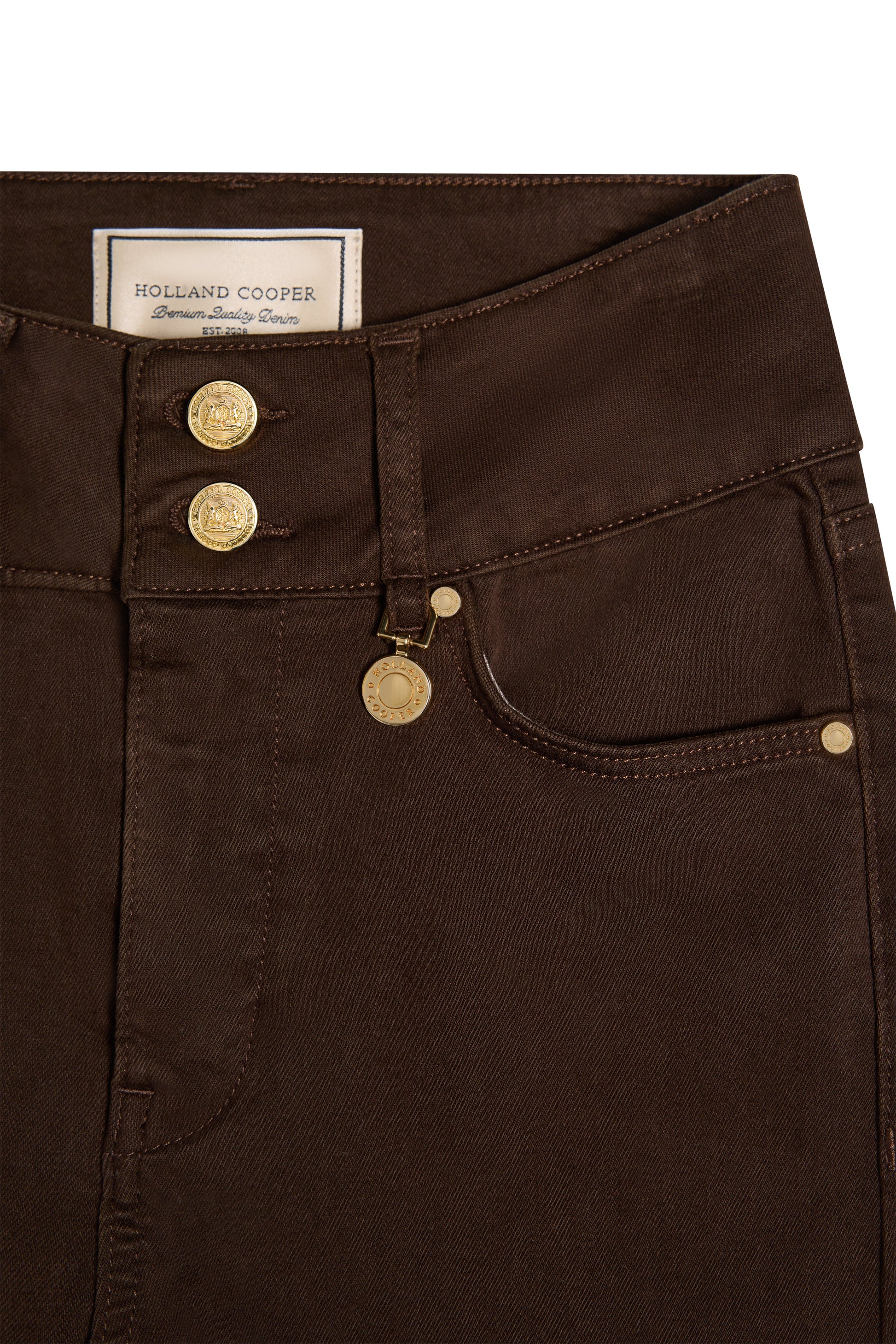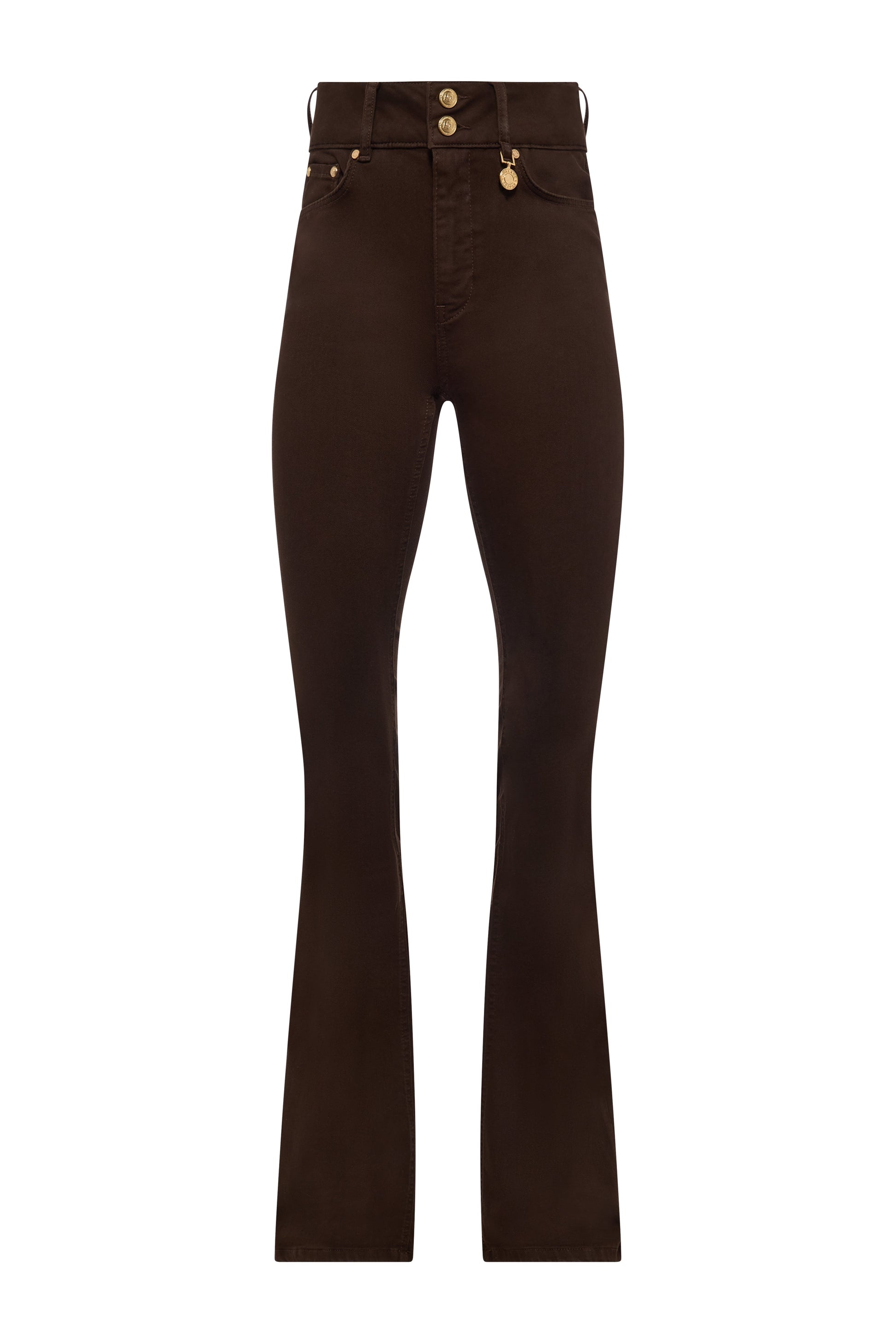 Crafted from ultra-soft stretch denim, these high-rise jeans are designed to sculpt through the leg before falling into a flattering, flared silhouette—perfect for elevating your everyday wardrobe. Finished with our signature crested gold hardware and a delicate HC coin charm at the belt loop, every detail speaks to timeless style and considered craftsmanship.