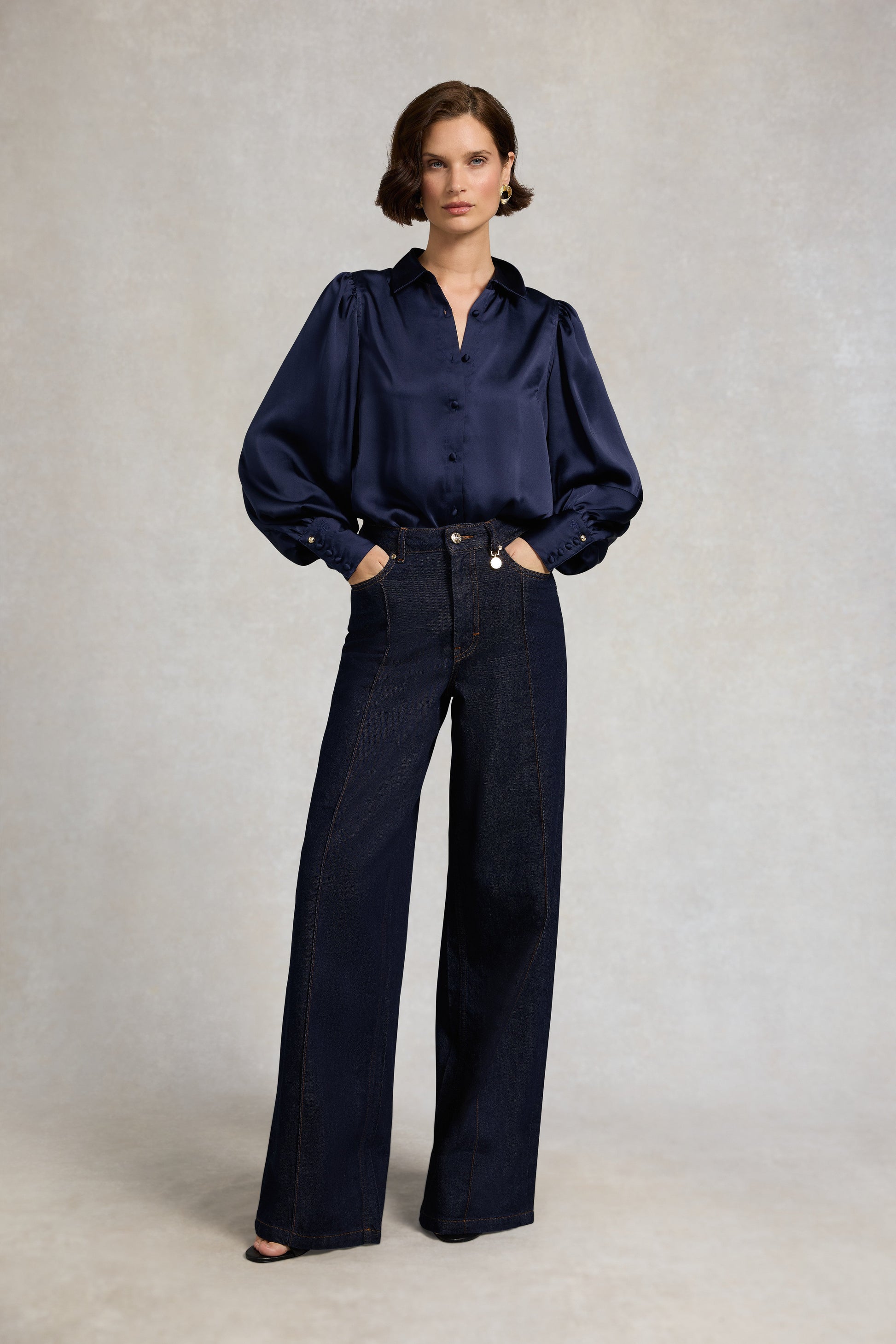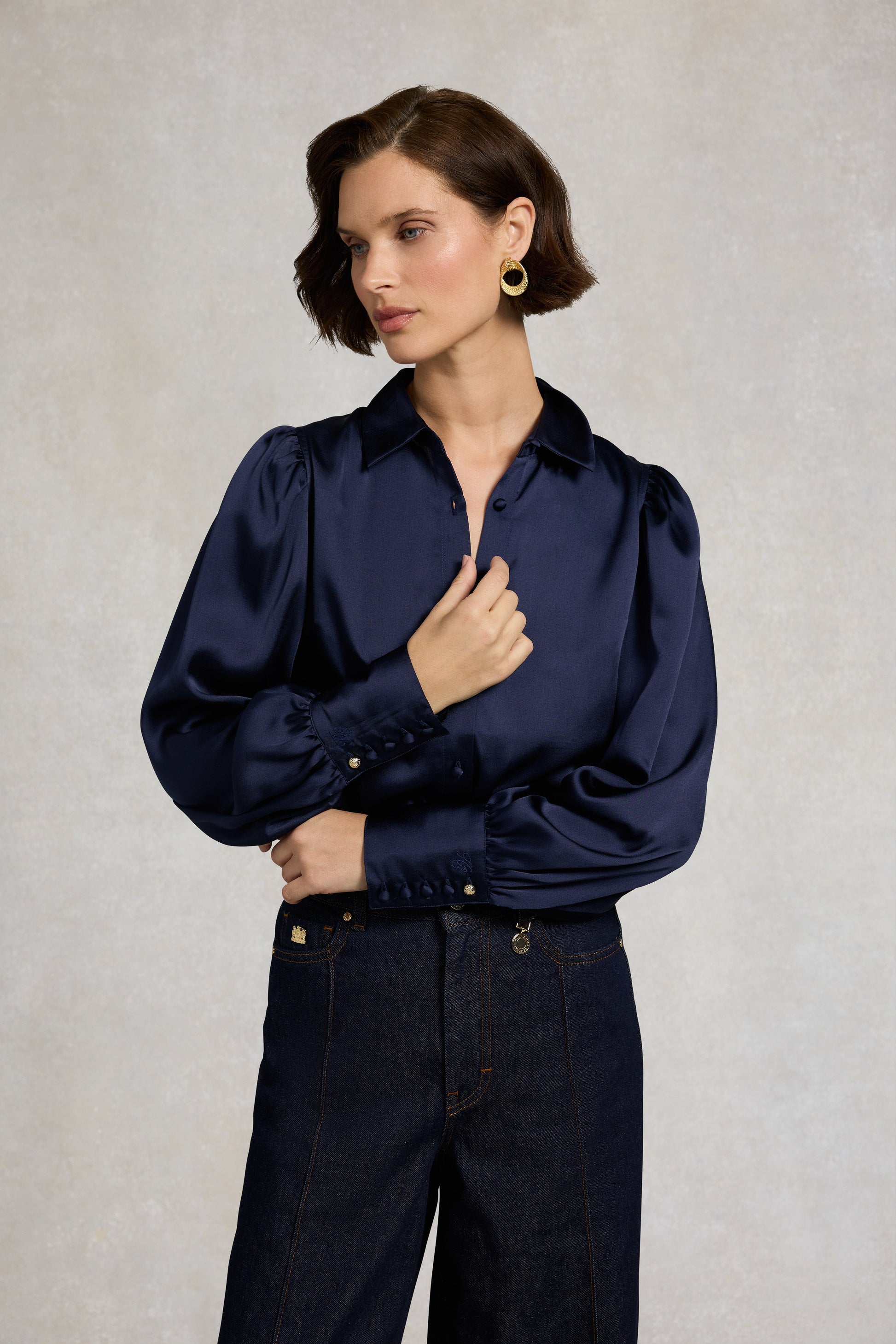Elevated for the season, the Iona Shirt is crafted in luxe satin fabric with a subtle sheen for effortless sophistication. The classic pointed collar frames the neckline, while dramatic gathered sleeves create a striking silhouette. A V-shaped back yoke with delicate gathering adds elegant movement, accented with a signature gold HC pin. Self-covered buttons run down the centre front, with signature gold hardware at the top button to complete this distinguished essential.