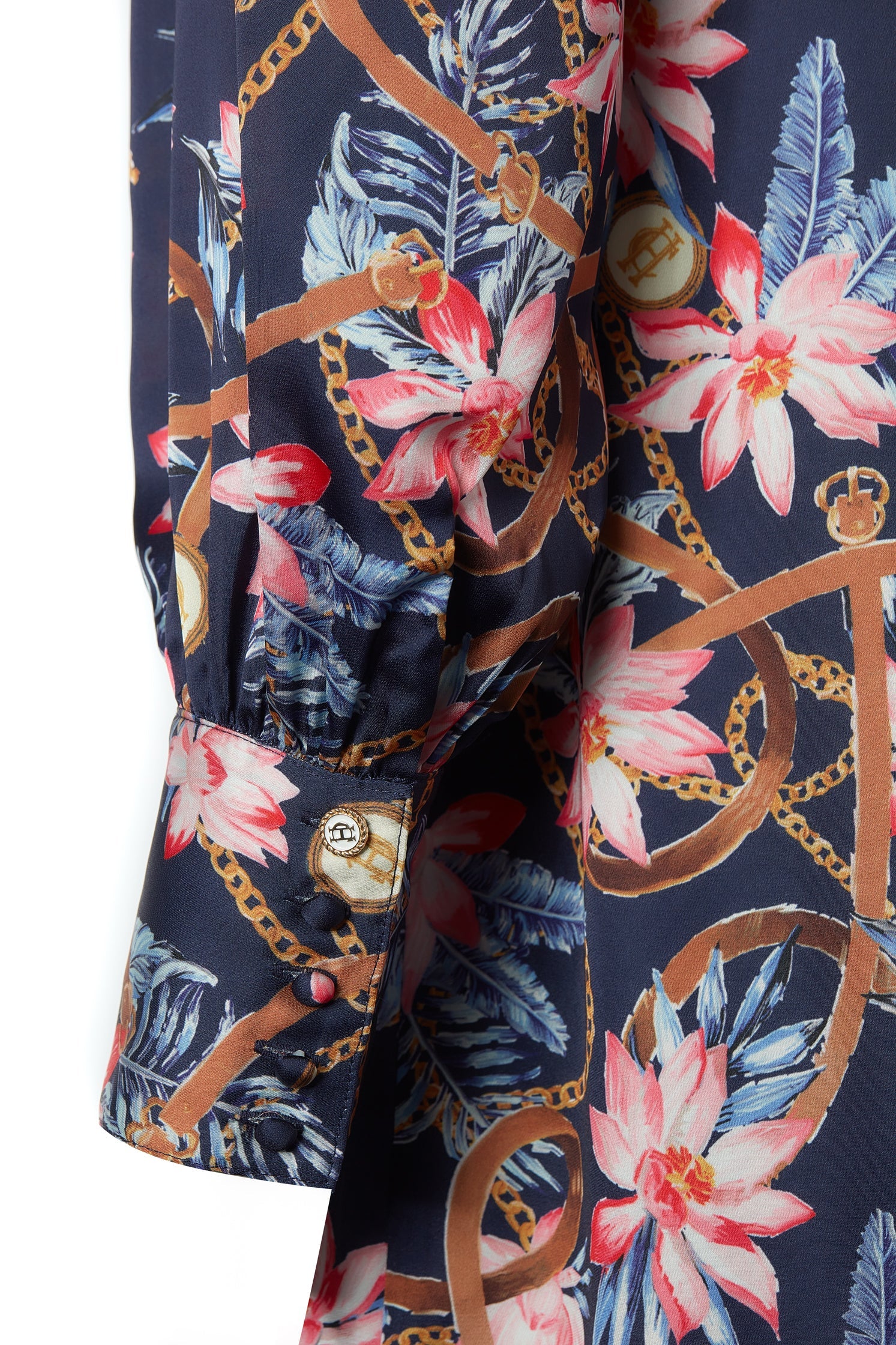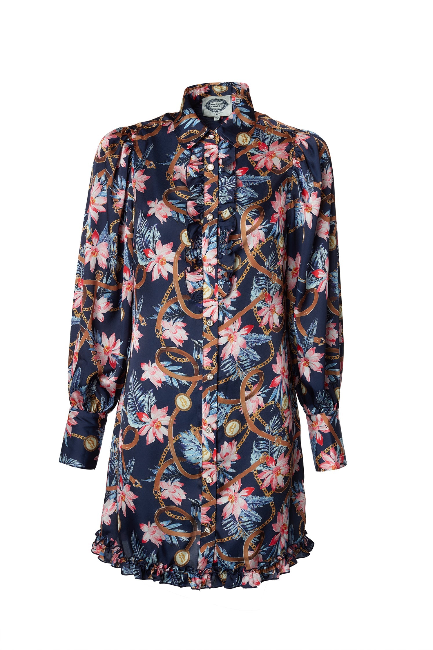 This chic mini dress features a ruffle front placket with covered button detailing, The relaxed, easy oversized shirt fit ensures comfort without compromising on style, making it an ideal choice for various occasions. Designed with a saddle-shaped hem, the hand-drawn HC print elevates this feminine piece.