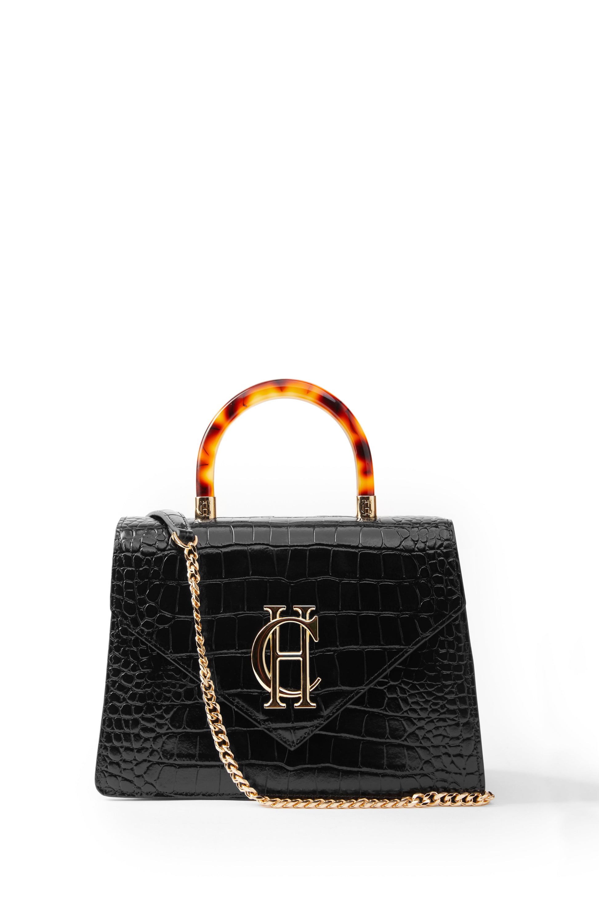 Made from a stunning croc embossed leather, this bag is ideal for elevating any look, day or night. Designed with an envelope closure accompanied by a tortoiseshell top handle and detachable crossbody chain. Detailed with internal card slots, a zip pocket & foiled lining. Finished with a bold HC logo to the centre front.