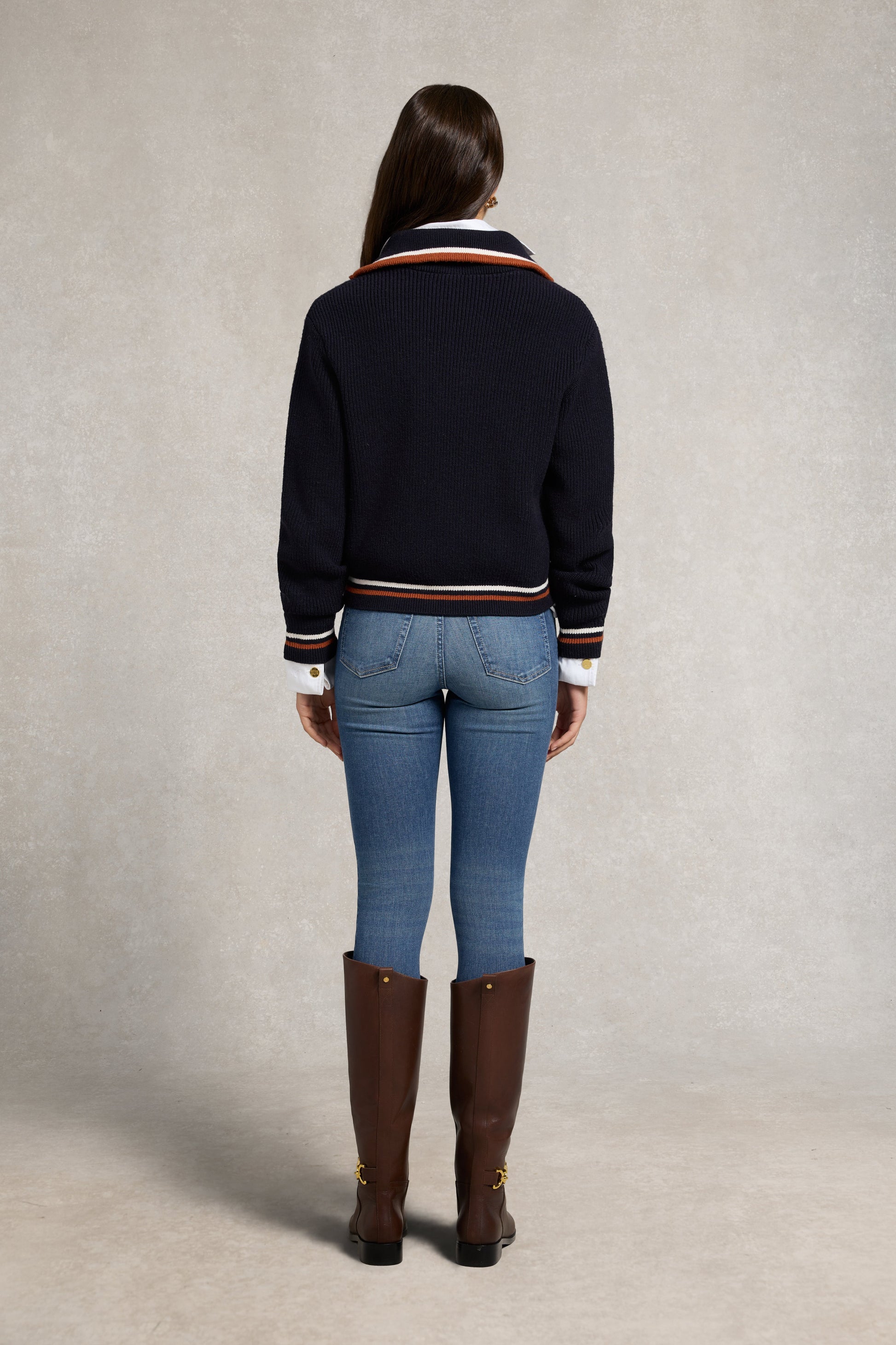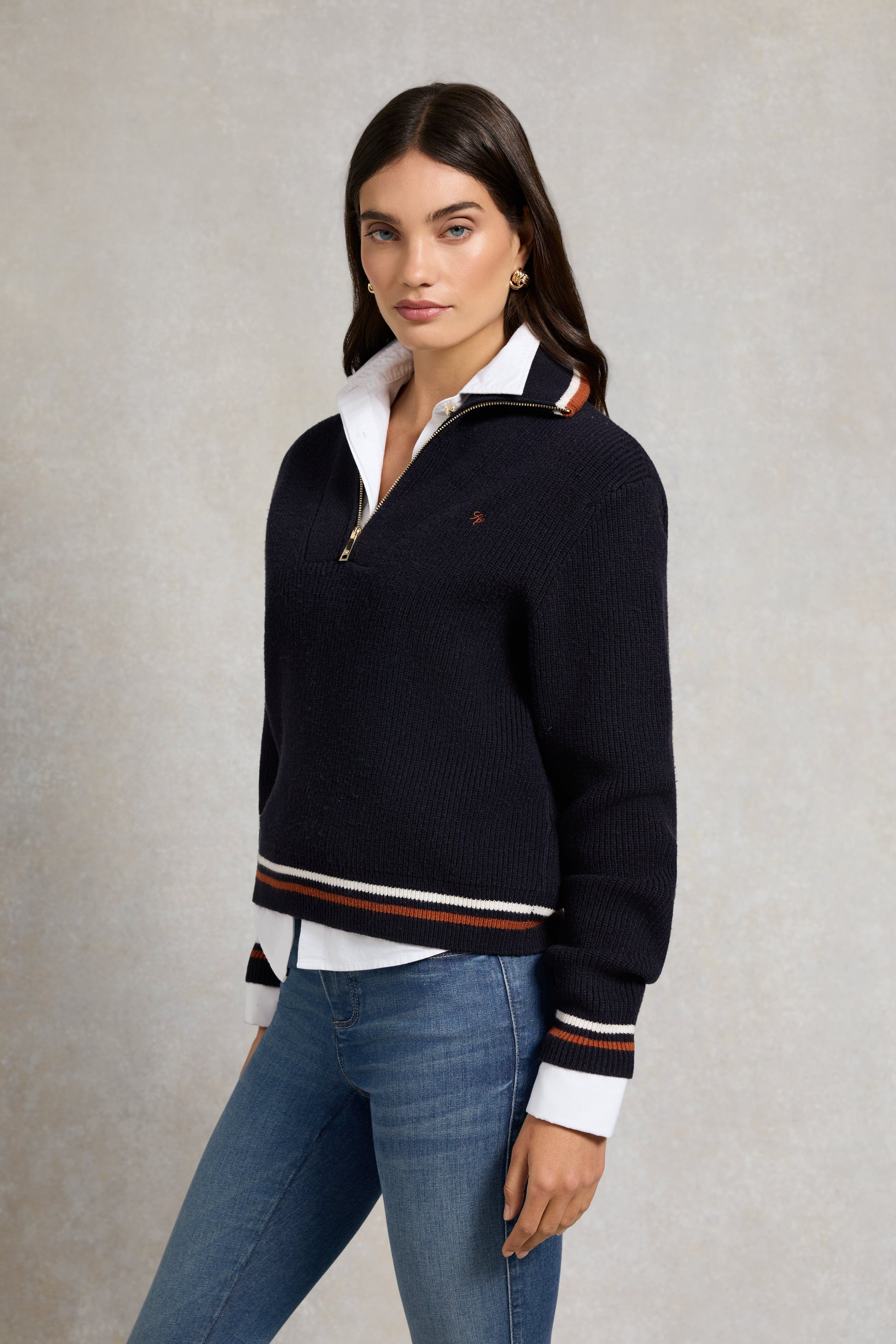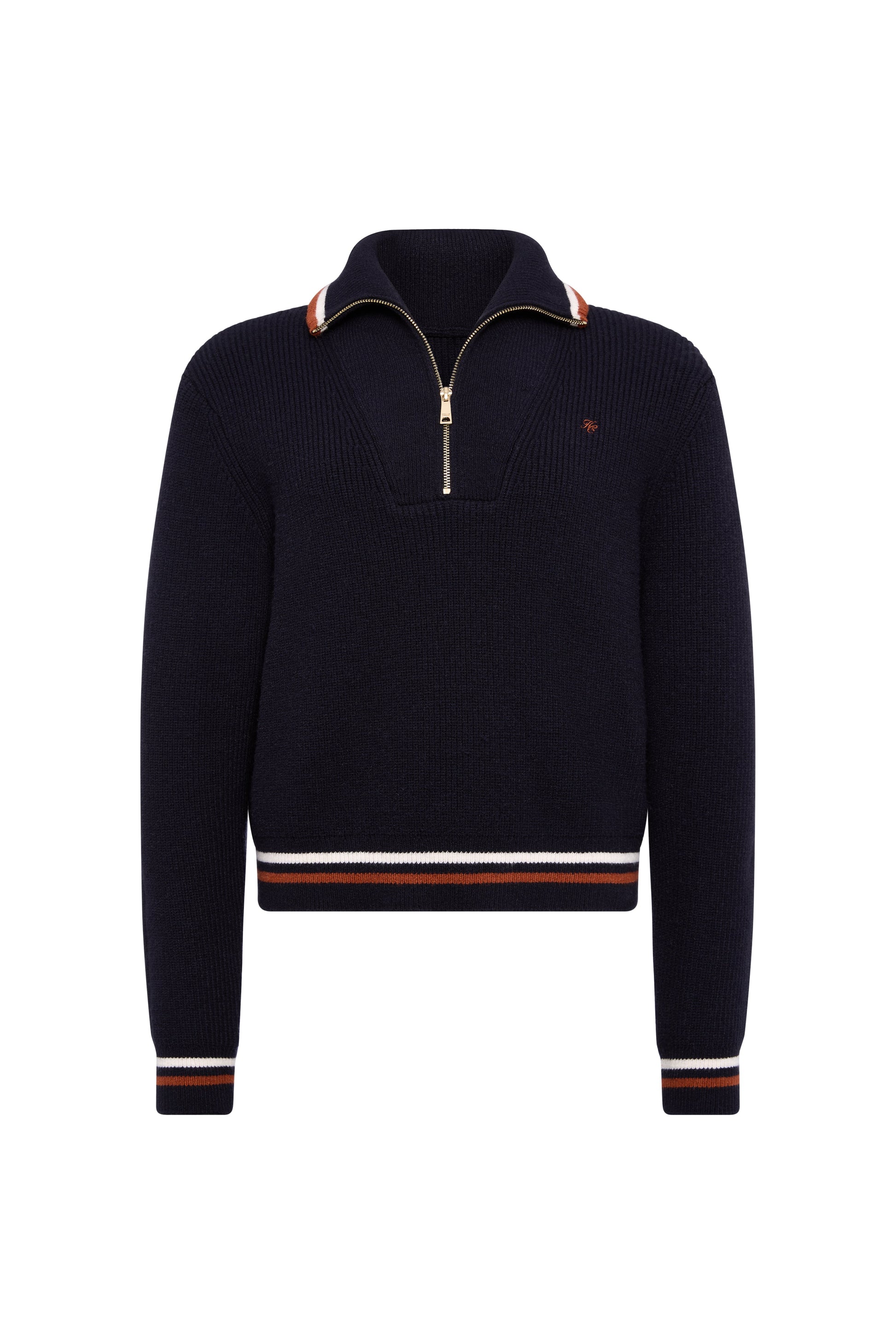 A refined take on a casual essential, the Jessica Quarter Zip is crafted from a luxurious wool blend for warmth and softness. Designed with a ribbed texture throughout, it features a relaxed silhouette with a dropped shoulder and slim sleeves for a flattering yet effortless fit. The quarter-zip neckline is finished with contrast tipping at the collar and cuffs, lending a sporty, elevated edge. Complete with an embroidered HC monogram at the chest, this piece brings timeless style and comfort to your transeasonal wardrobe.