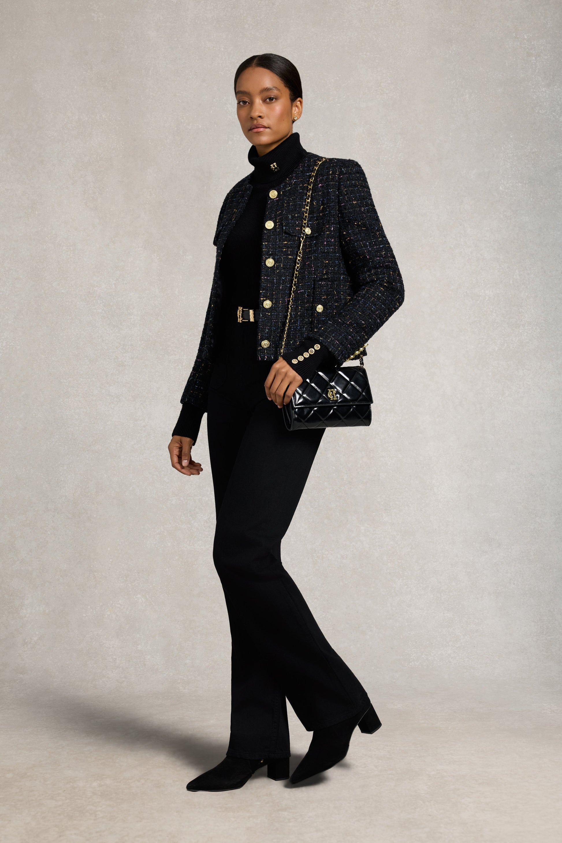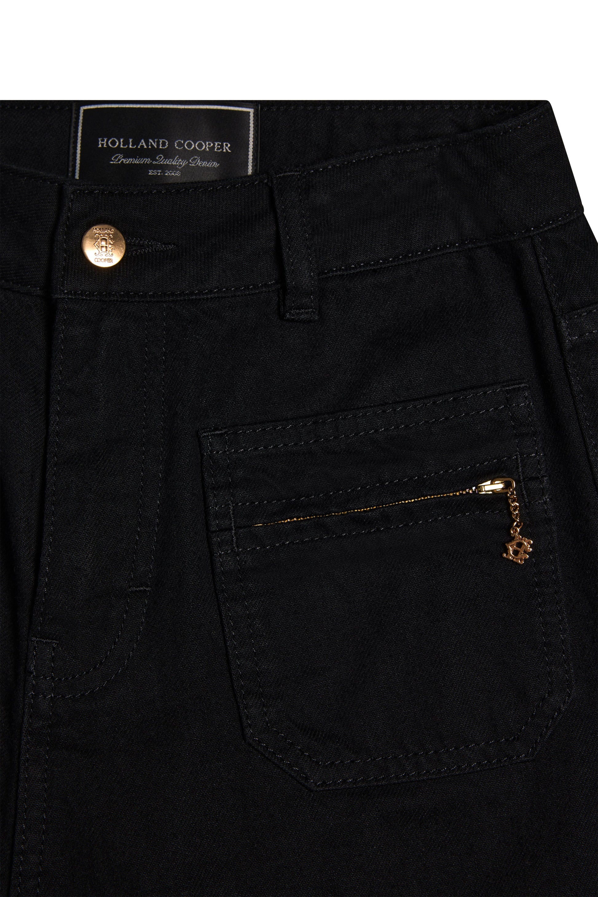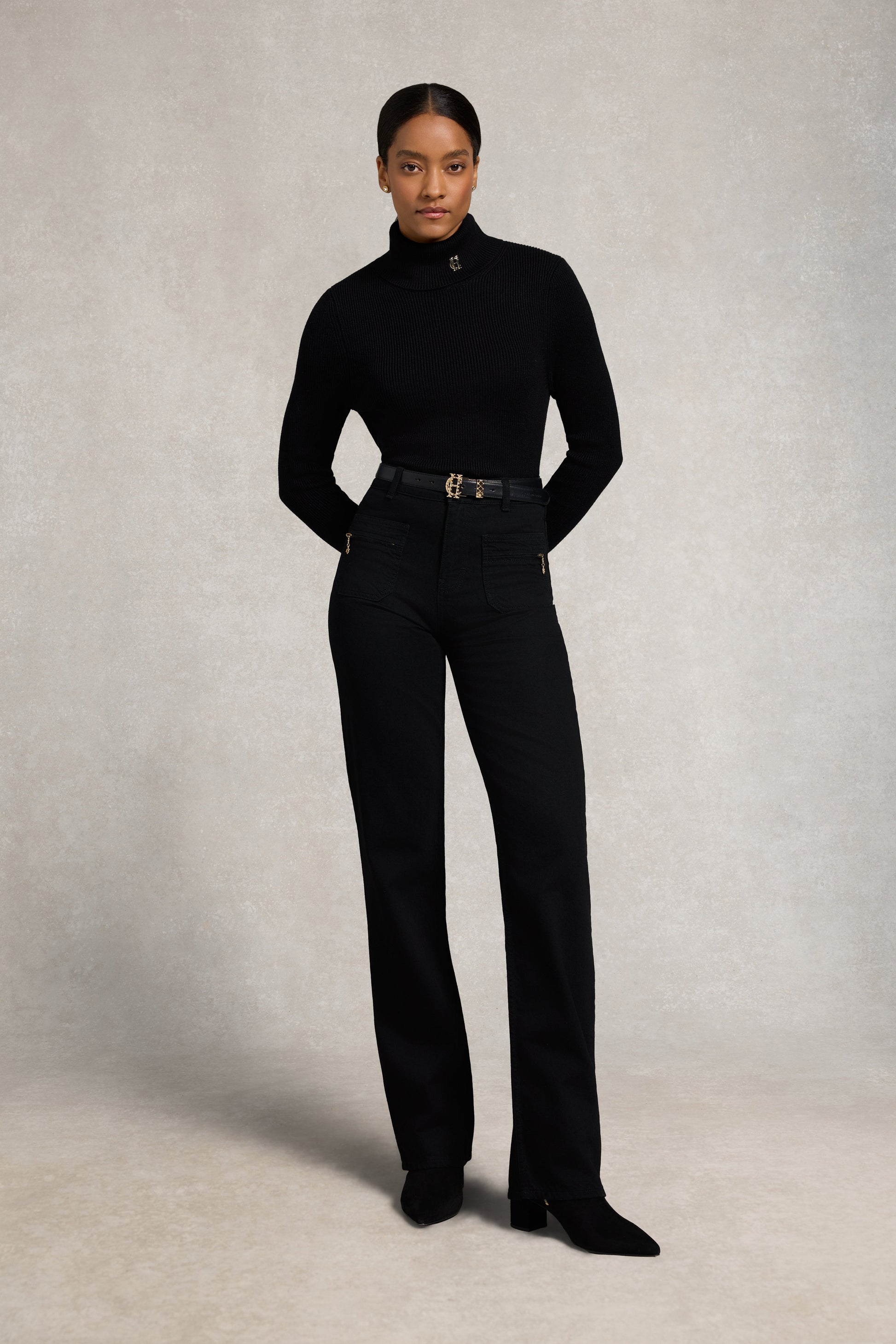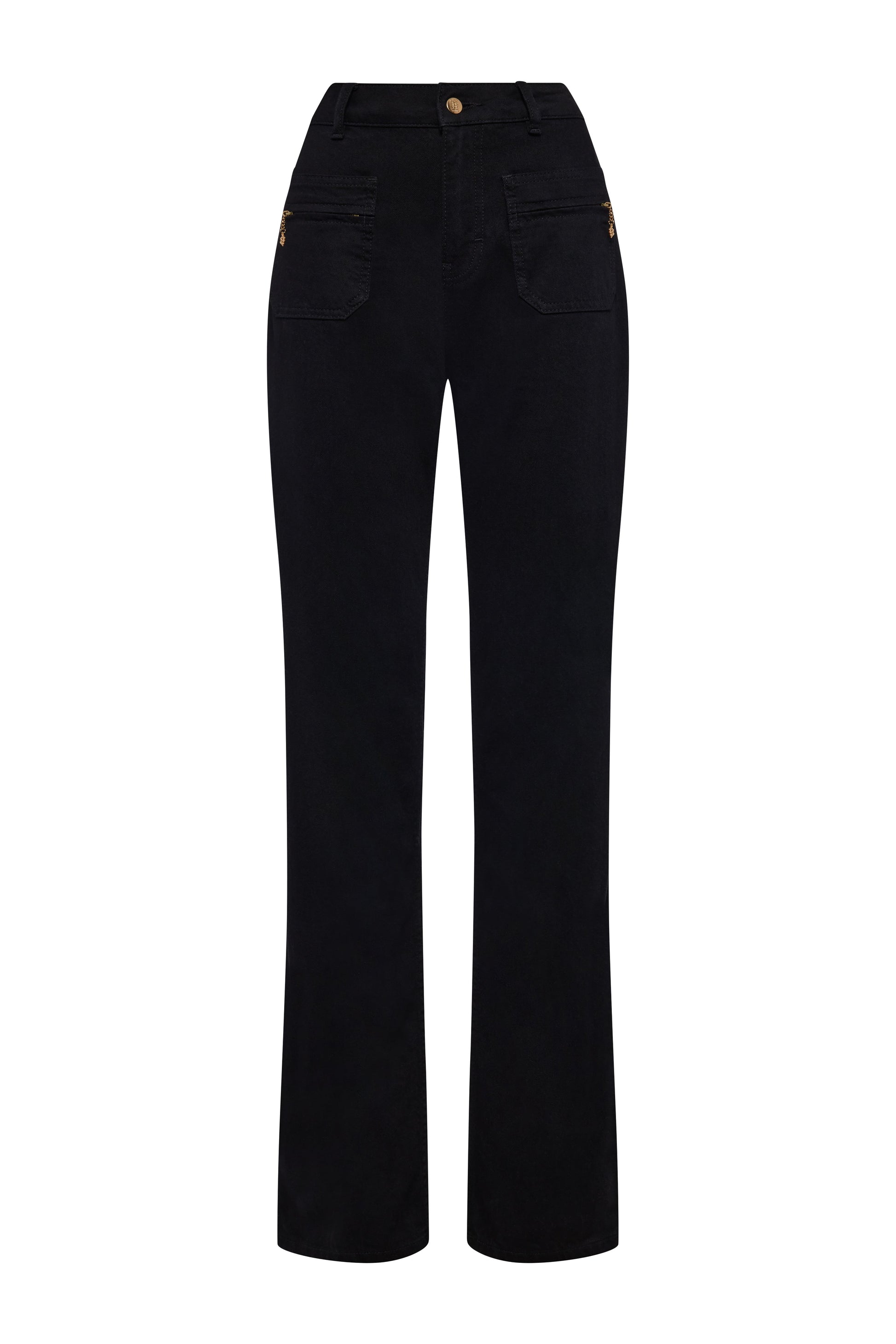 Combining classic structure with elevated detailing, the Jessica Straight Jean is designed with a high-rise waist and a subtle wide leg for a flattering, modern silhouette. Front patch pockets feature functional zip fastenings, complemented by rear patch pockets and finished with domed crested buttons. Crafted with signature gold metal hardware throughout, this style is a timeless wardrobe staple with a refined edge.