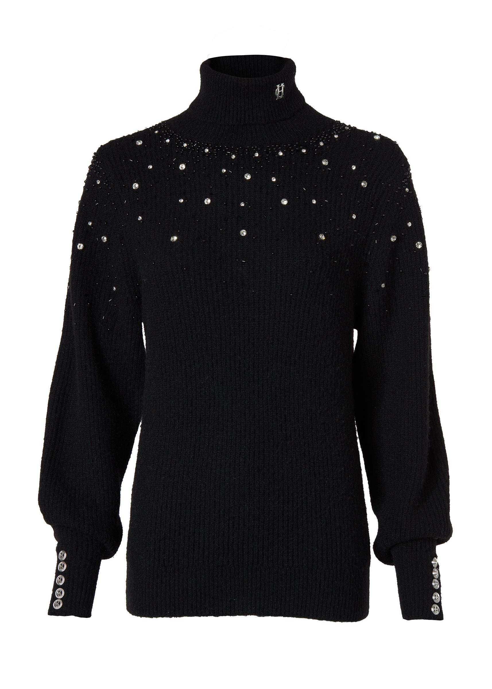 A sophisticated wardrobe essential, crafted from soft, ribbed fabric for a flattering fit. The Kelsie Rib Embellished roll neck is elegantly adorned with crystal and pearl detailing, adding a touch of glamour, while signature hardware on the cuffs offers a luxurious finish. Perfect for elevating both day and night looks, this piece effortlessly combines comfort and style.