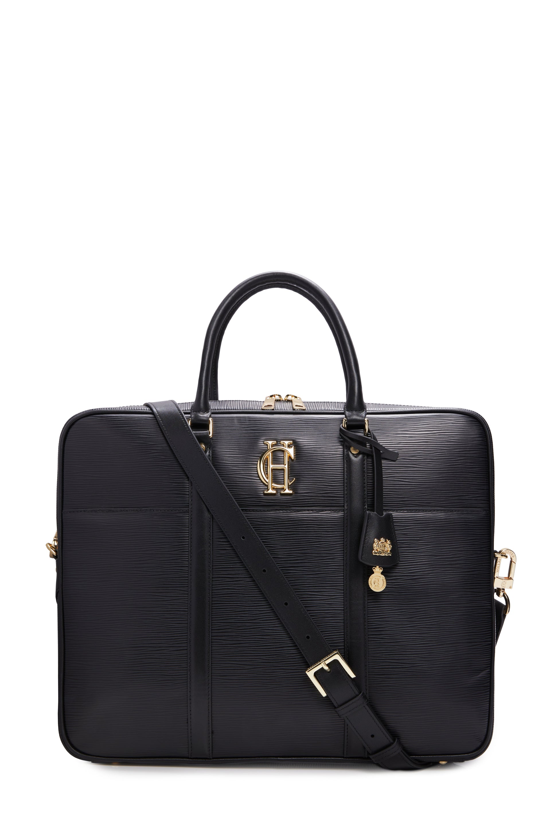 The briefcase is designed with a padded upper for added protection, base rivets for durability, and a gold zip closure. Fully branded with the iconic Gold HC, this briefcase is a sophisticated and practical choice for the modern professional.