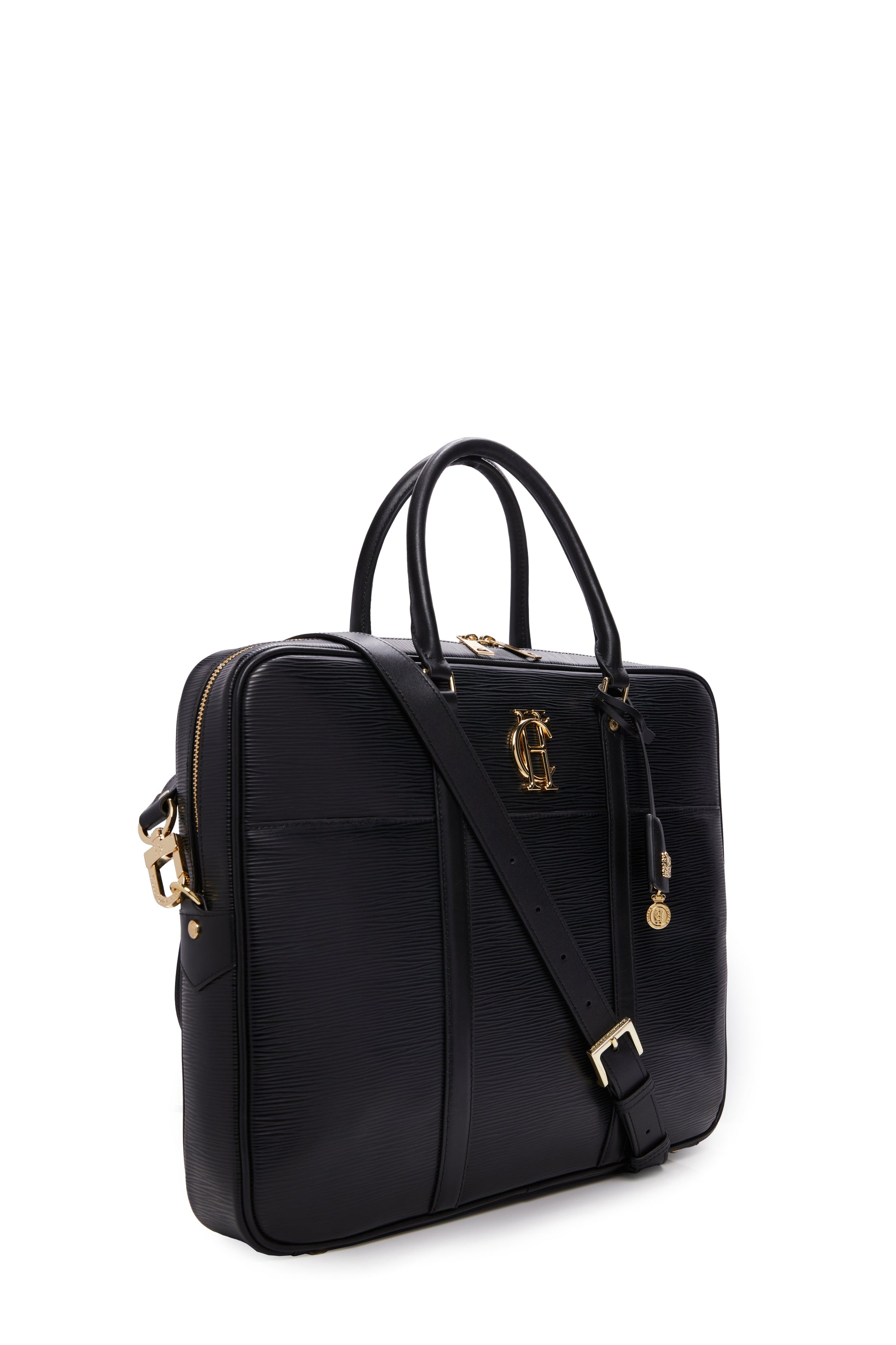 Introducing the Knightsbridge Briefcase, crafted from premium cow leather, featuring an embossed design in sleek black leather. It offers both style and functionality, with padded top handles adorned with branded gold detailing, and a detachable long strap with branded rivets and dog clips for versatile carrying options.