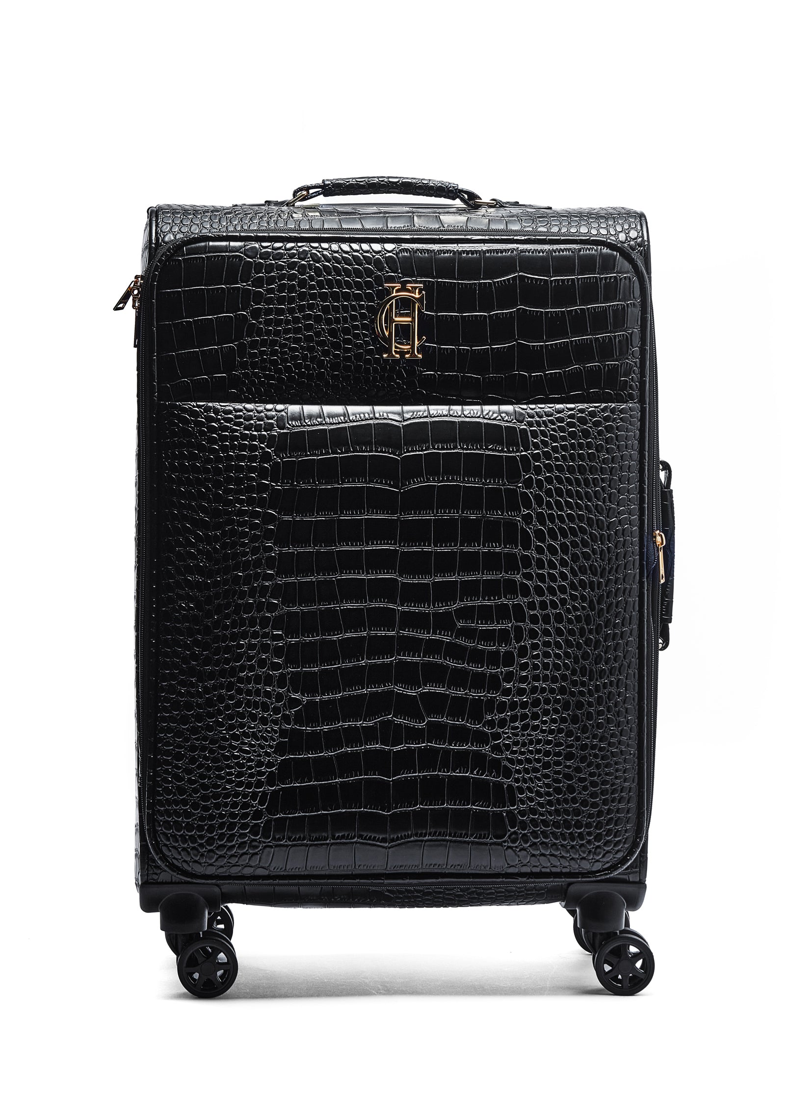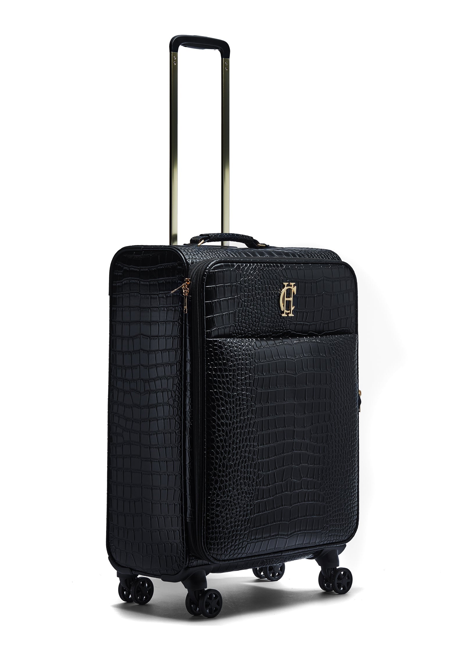 Jet off in style with Holland Cooper's first-ever suitcase. Offering style and exceptional capacity, this suitcase has been perfectly designed with spacious internal compartments with elasticated straps to hold your luggage in place. Crafted from a striking croc-embossed faux leather with our statement iconic Holland Cooper monogram to the front, the gold telescopic handle ensures lightweight and fluid travel. With a four-wheeled design and metal zip closure, travelling through the airport has never been so easy!