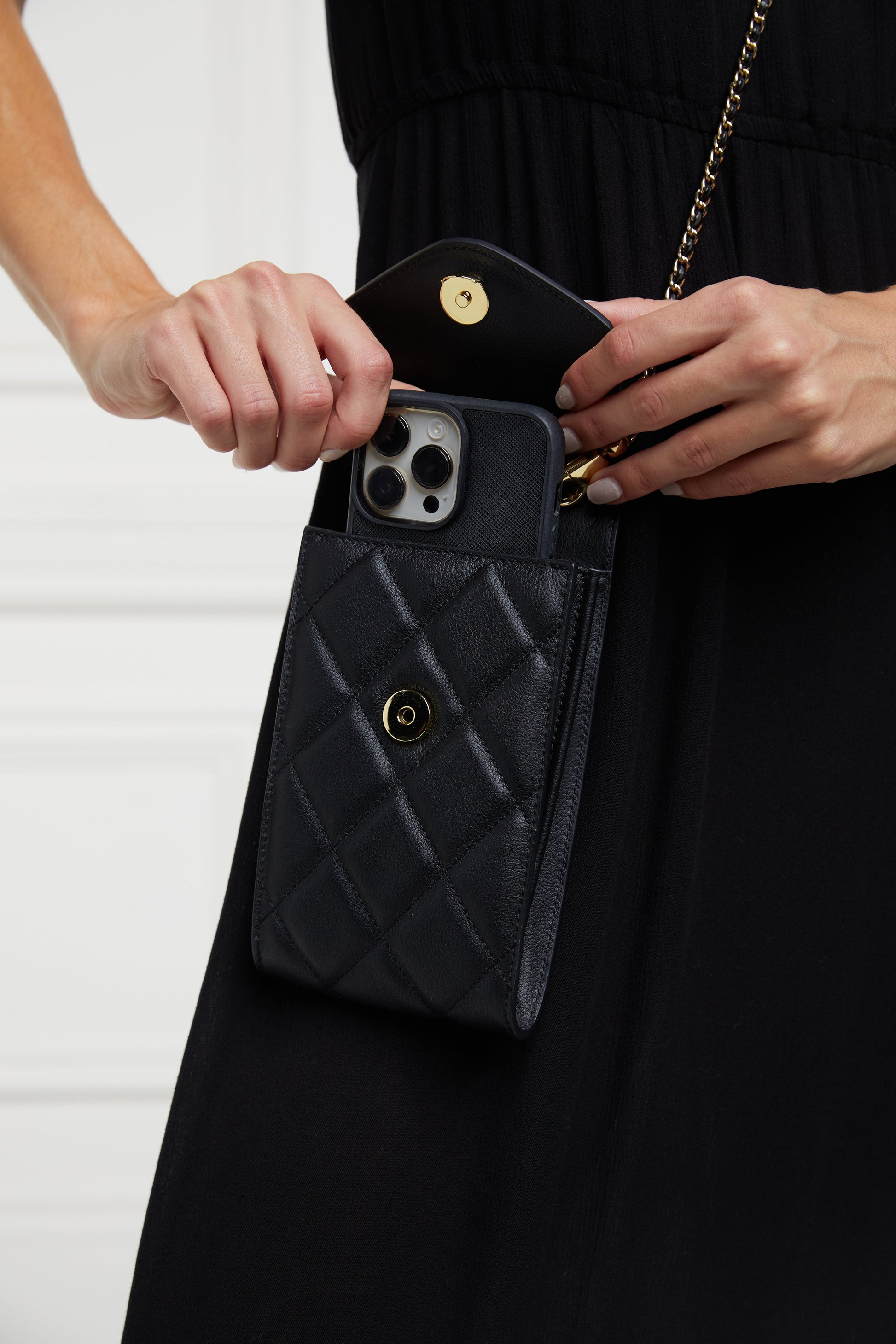 Beautifully crafted from premium quilted leather, this phone pouch is the perfect companion for every outfit. Centred around our iconic gold HC branding, this bag comes with a detachable leather-filled gold chain to perfectly sit on your shoulder. Fastened with a strong magnetic clasp and on the front and a small zip pocket on the back for safe keeping.