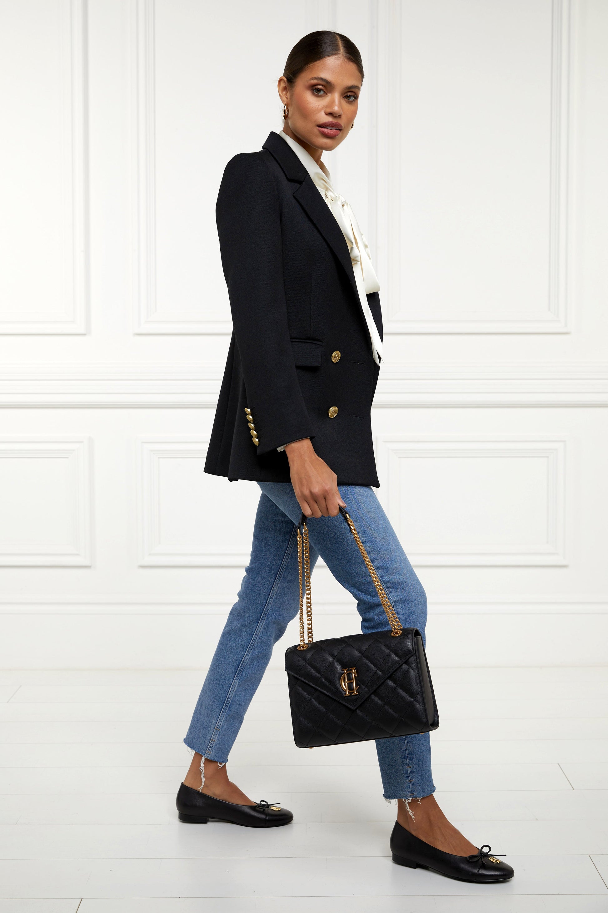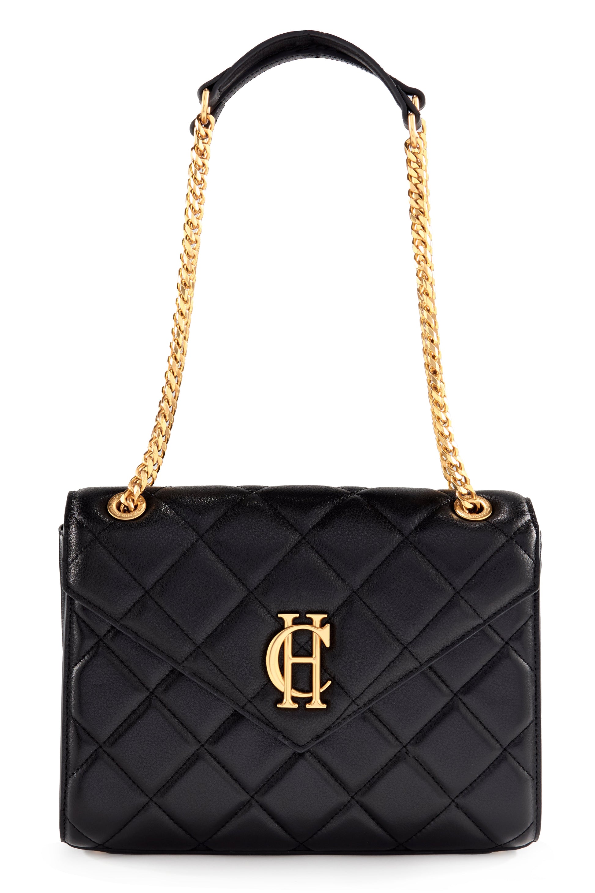 The Knightsbridge Shoulder Bag has been beautifully updated in premium leather, offering a luxurious feel and timeless appeal. This elegant bag features a secured chain strap with a dual-length option, allowing for versatile styling. Adorned with classic HC branding.