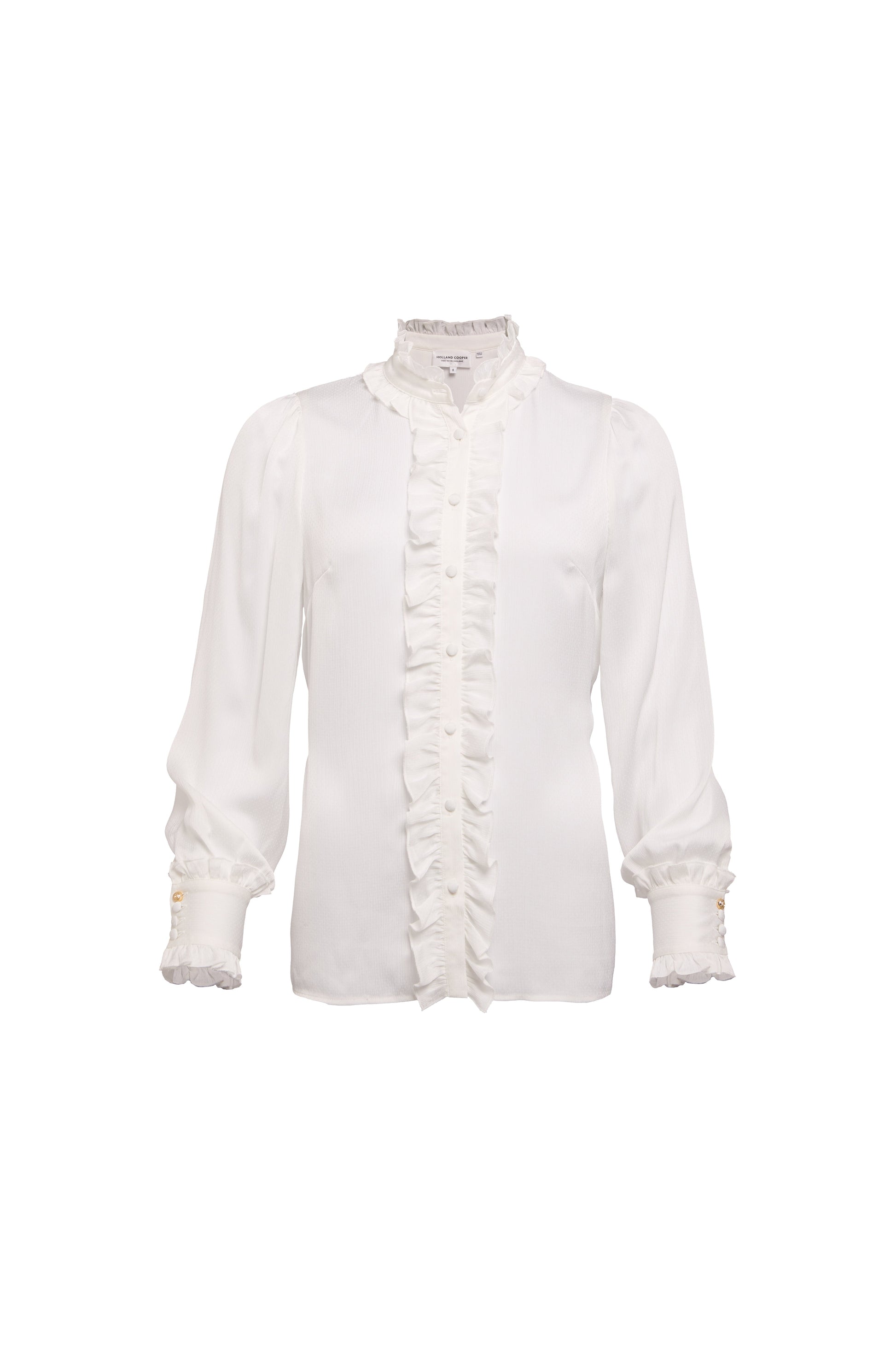 This statement piece features a sophisticated grandad-style ruffle collar and an enchanting cascade of ruffles down the centre front placket, adorned with refined self-covered buttons. The relaxed silhouette is thoughtfully tailored with bust darts for a flattering shape. Romantic gathered sleeves culminate in double-ruffled cuffs, while our distinguished gold HC branding tab adds a subtle touch of luxury to the back yoke.